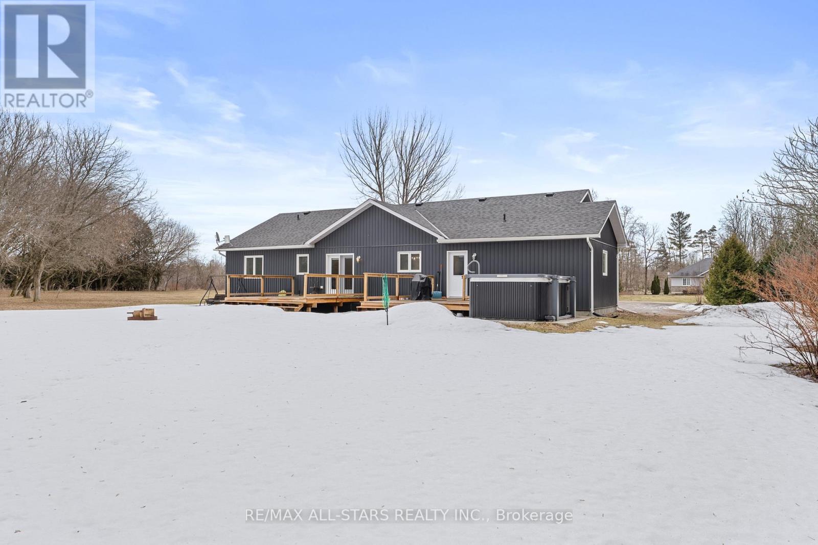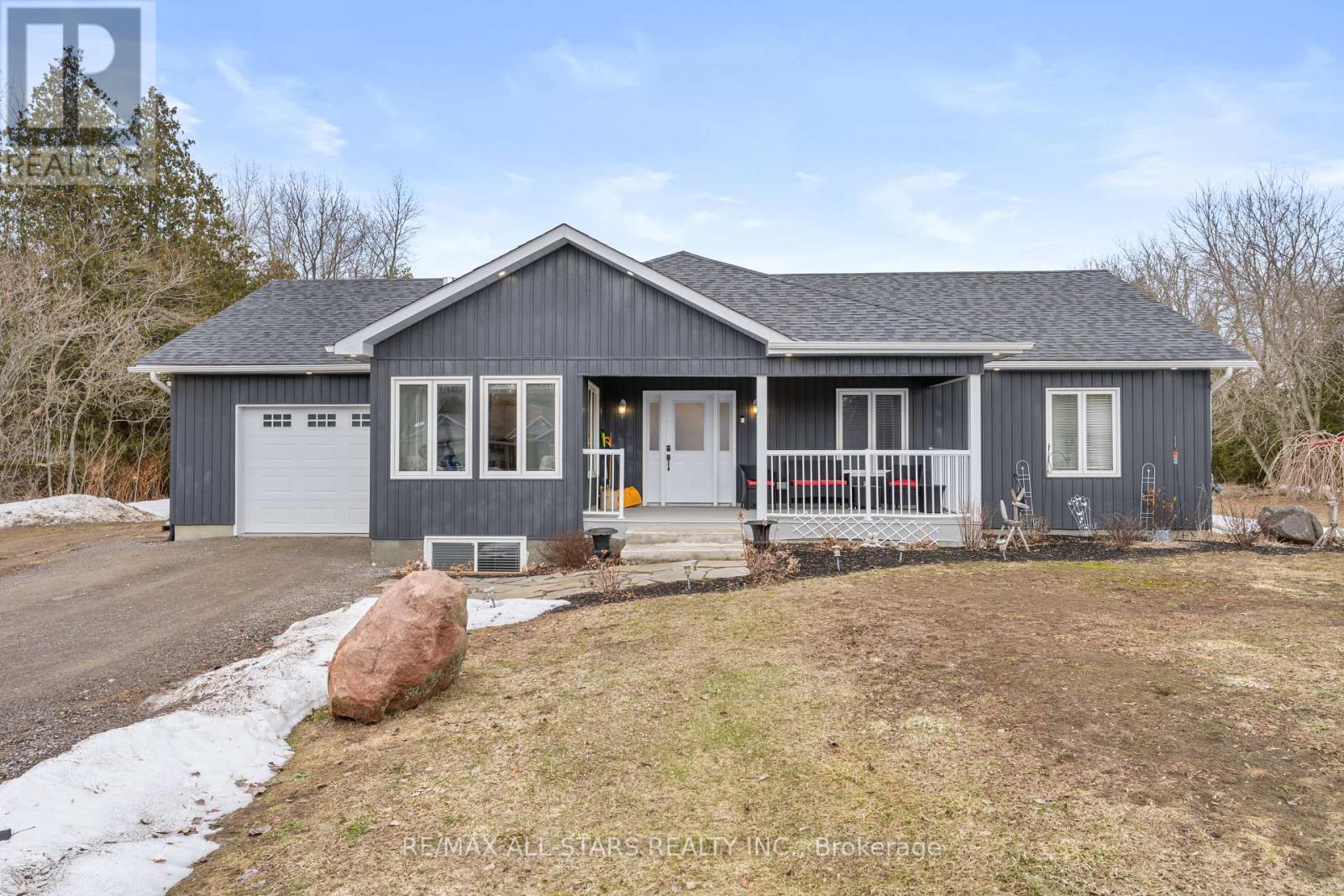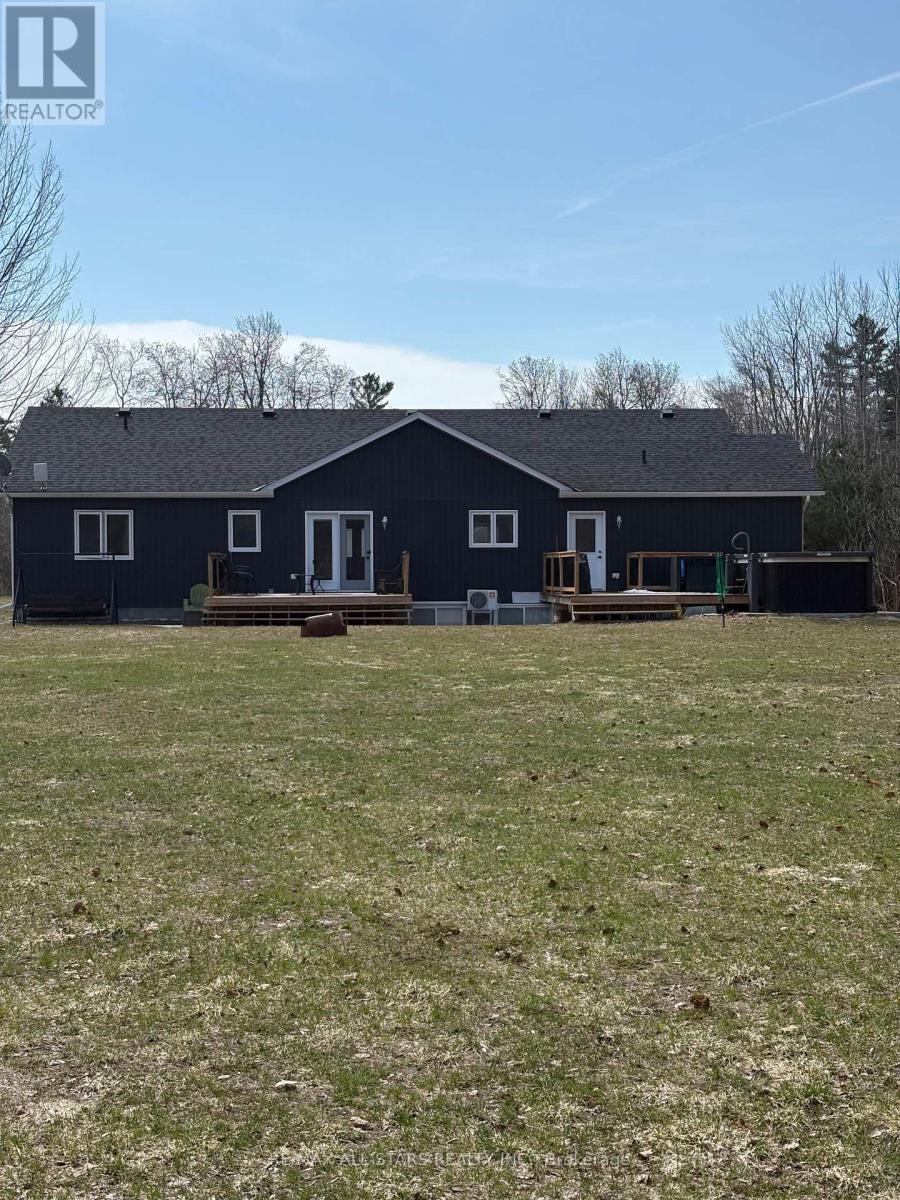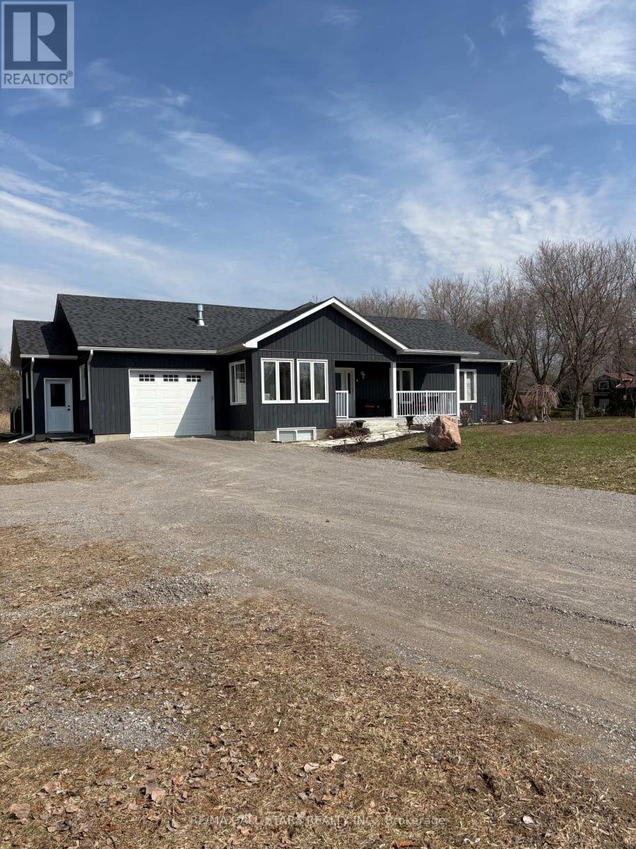 Spacious 3-bedroom, maintenance-free bungalow on a serene 14-acre parcel, showcasing an expansive open-concept kitchen, dining, and living area with a cozy gas fireplace, soaring vaulted ceilings, and abundant natural light. Effortless main-floor living includes practical laundry facilities and a seamless flow to two generous sized decks, perfect for quiet evenings. The primary bedroom retreat delivers a roomy walk-in closet and luxurious 3pc en-suite; complemented by two additional well-proportioned bedrooms and a bright 4pc main bath. Below grade, a voluminous 1669 sq ft finished basement splits into versatile zones: as potential fully self-contained 1-bedroom in-law apartment with private interior entrance, kitchenette, and full bath, plus a spacious family/rec room area with an extra bedroom and storage-ideal for large families or multi-generational households. Prime rural setting with development potential for two severances, and walking distance to Grafton Public & Catholic School. (id:64974)