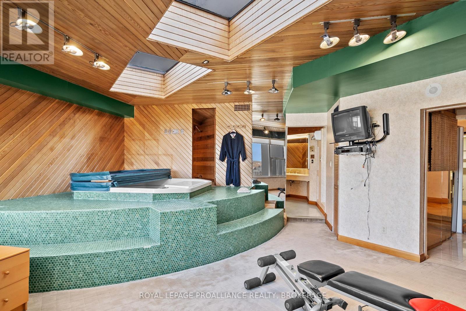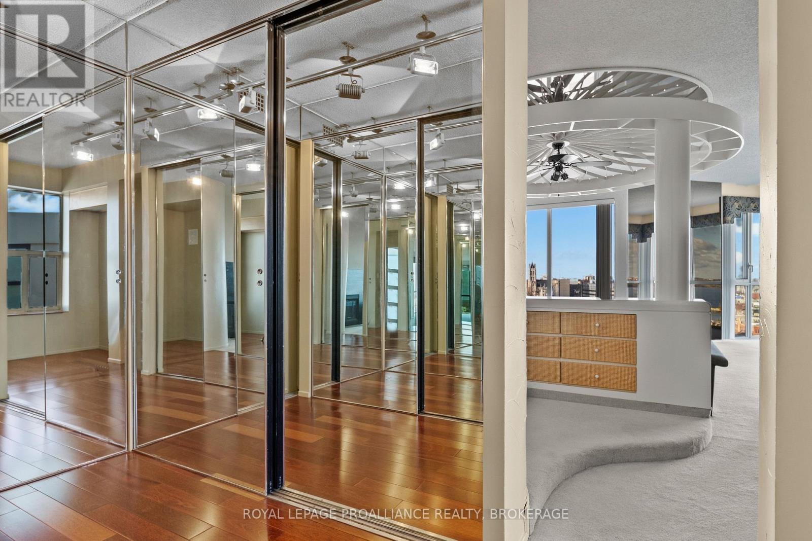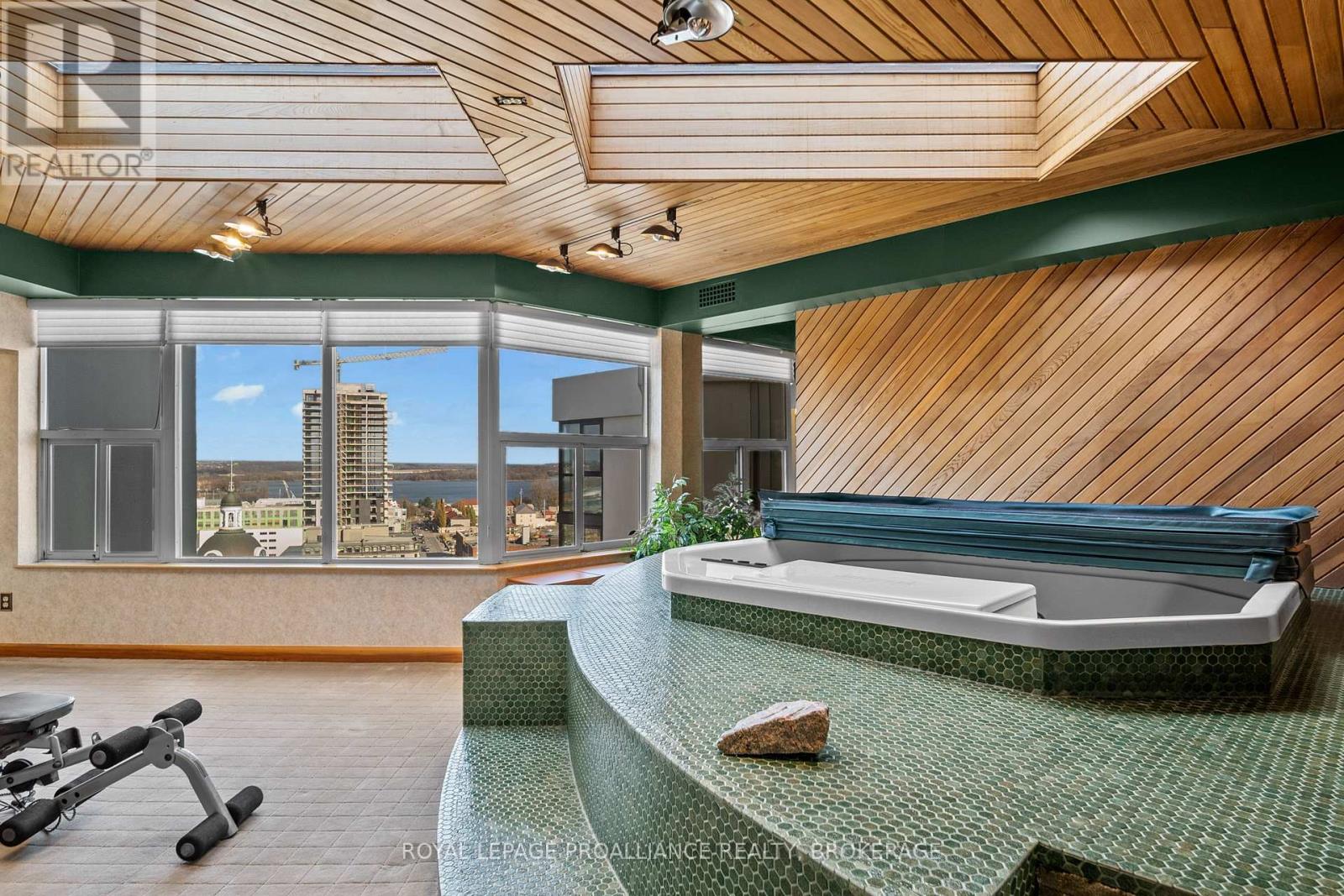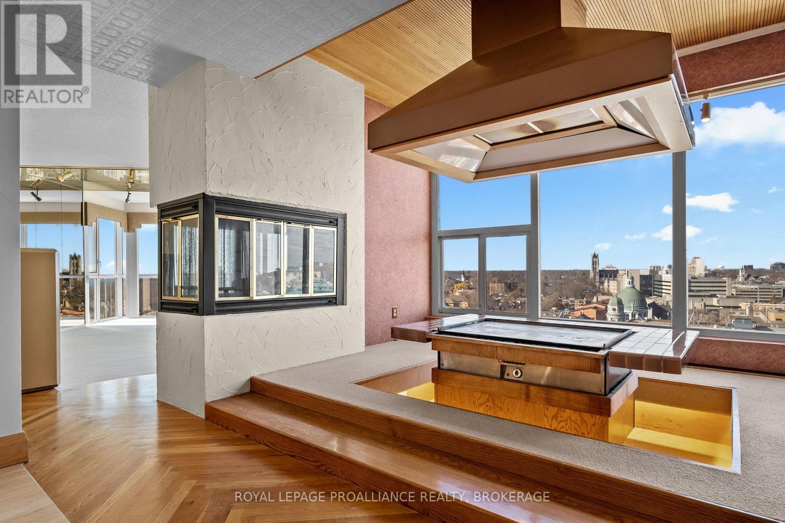 Nestled atop one of the most sought-after locations in the city, this extraordinary 3-bedroom, 3-bathroom Harbour Place penthouse offers an unparalleled living experience. Boasting sweeping, panoramic views of downtown Kingston and Lake Ontario, this meticulously designed residence spans over 3,500 square feet of luxurious living space. The seamless flow of the interior is enhanced by gleaming hardwood floors, large windows, and multiple fireplaces, adding warmth and charm throughout. Truly an oasis in the sky, the sunken living room and dining area complete with a teppanyaki grill are perfect for both intimate gatherings and large-scale entertaining. The primary bedroom is a true retreat, featuring expansive views, a walk-in closet, an office, and your own private gym/spa with a hot tub and sauna. A second bedroom with its own full bathroom provides privacy and comfort for family or guests. Ensuring a lifestyle of ultimate convenience and luxury, this building offers a wide range of amenities, including underground and visitor parking, a car wash, community BBQ, exercise room, library, party room, sauna, and indoor pool. Just minutes from upscale dining, high-end shopping, cultural attractions, and everything the city has to offer, this penthouse is the epitome of luxury living. With its prime location, stunning water views, and unmatched elegance, its a one-of-a-kind property that you wont want to miss. (id:64974)