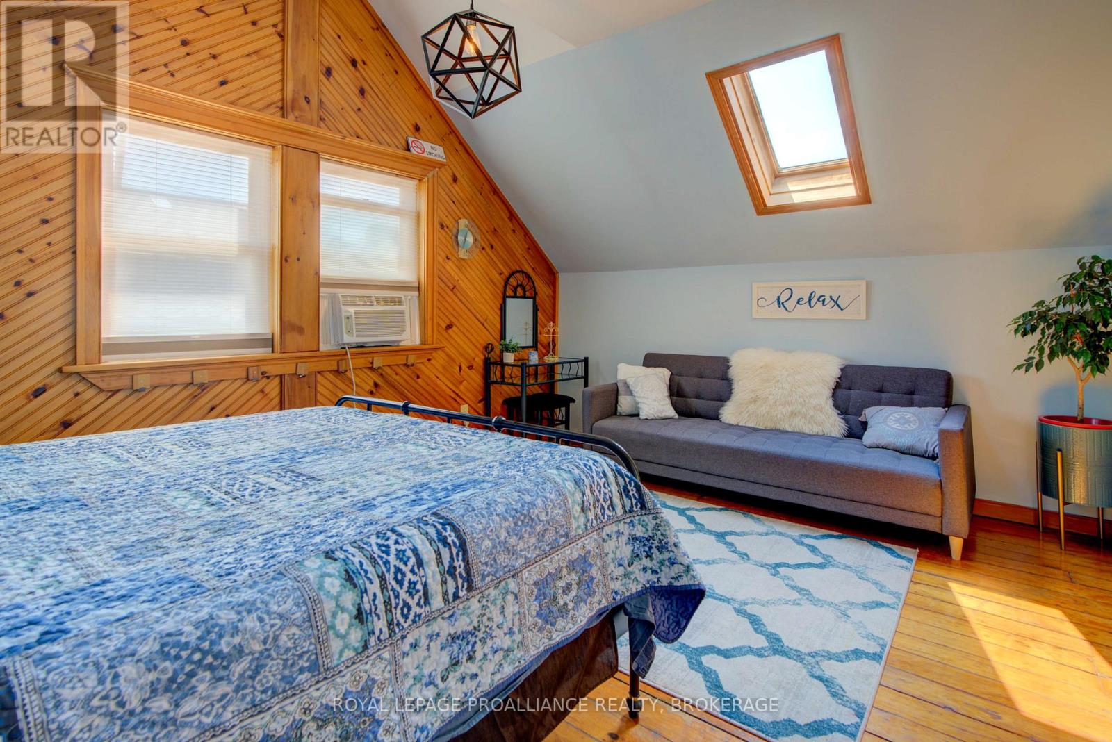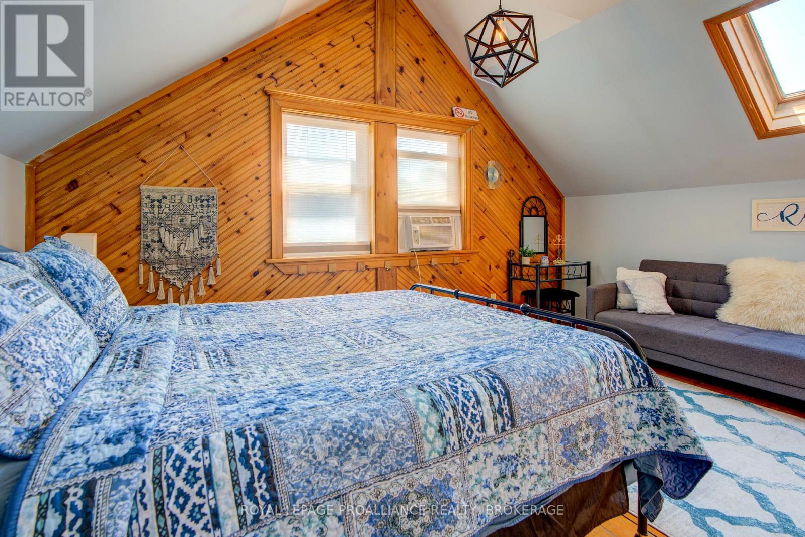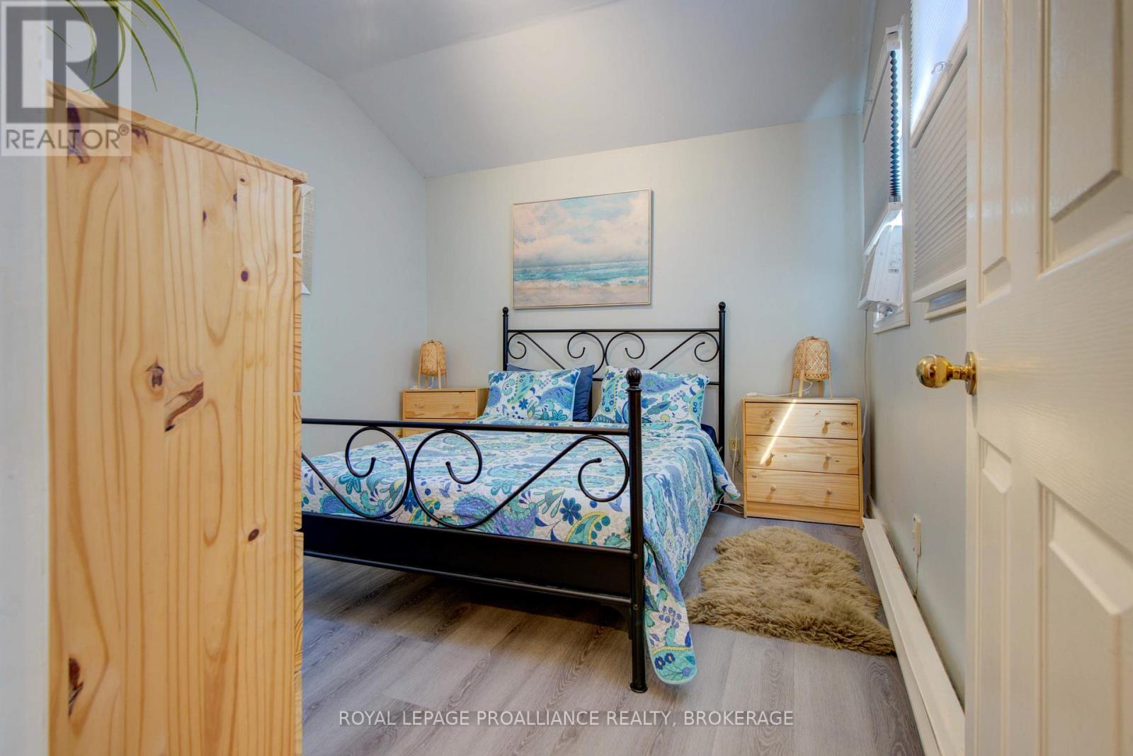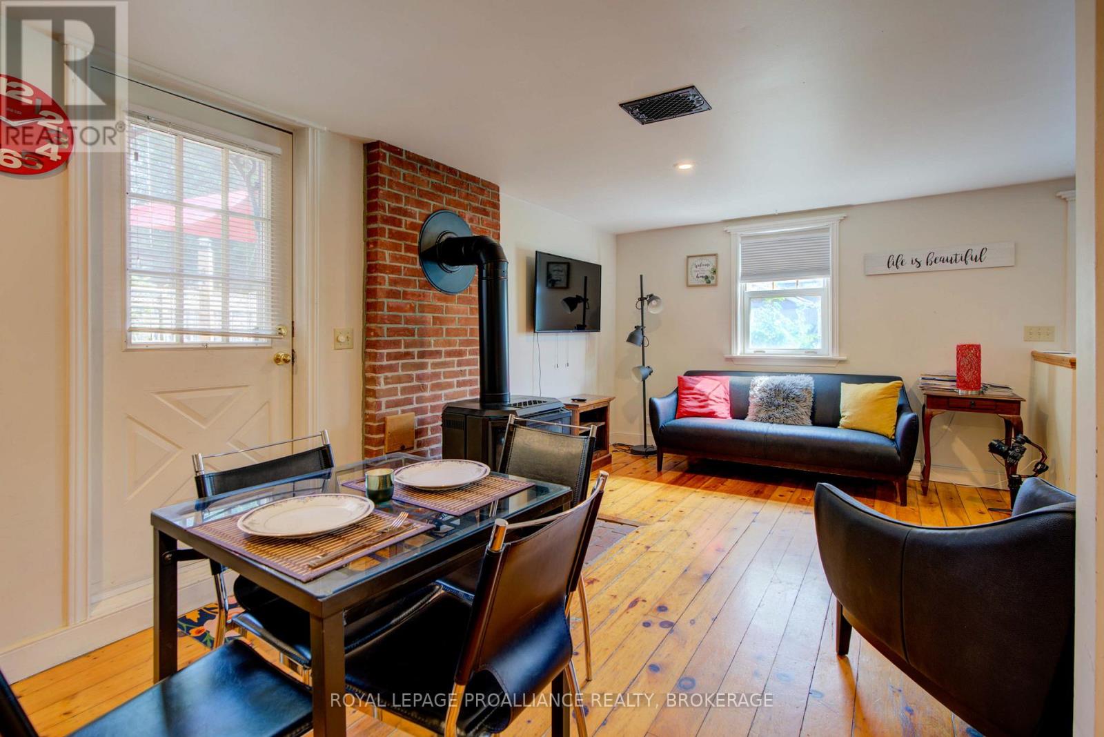 Charming two story home in Bagot offering a warm blend of rustic character and modern comfort, tucked away from the street for added privacy while still being just steps from all the action of downtown. This thoughtfully designed 780 sq. ft. residence features 2 bedrooms, 2 bathrooms, and well planned living spaces that maximize functionality and natural light. The 480 sq. ft. main floor includes a welcoming living room with pine flooring, a large wall mounted TV, and comfortable seating. The adjoining kitchen showcases dark cabinetry and wooden countertops, complemented by a bright dining area with a glass top table-an ideal layout for everyday living and entertaining. Upstairs, the 300 sq. ft. second level offers one inviting bedroom. The primary bedroom (180 sq. ft.) features a striking knotty pine accent wall, metal frame bed, geometric lighting, and generous windows. The second bedroom provides a serene, coastal inspired atmosphere perfect for guests or a quiet retreat. The home's bathroom is compact yet efficient, complete with a glass enclosed shower, modern vanity, and a skylight that fills the space with natural light. A dedicated laundry area with full sized appliances adds convenience. Warm wood tones throughout the home pair beautifully with crisp white walls, creating a bright, cozy, and contemporary feel. Hidden quietly behind the historic façade of Bagot Street lies a rare cottage retreat just steps from downtown. Walk to waterfront parks, restaurants, cafés, and boutique shops while enjoying the privacy of a tucked-away setting. A unique opportunity to live in the heart of Kingston without sacrificing tranquility. Walking distance from Hotel Deu, Kingston General, Queen's University. (id:64974)