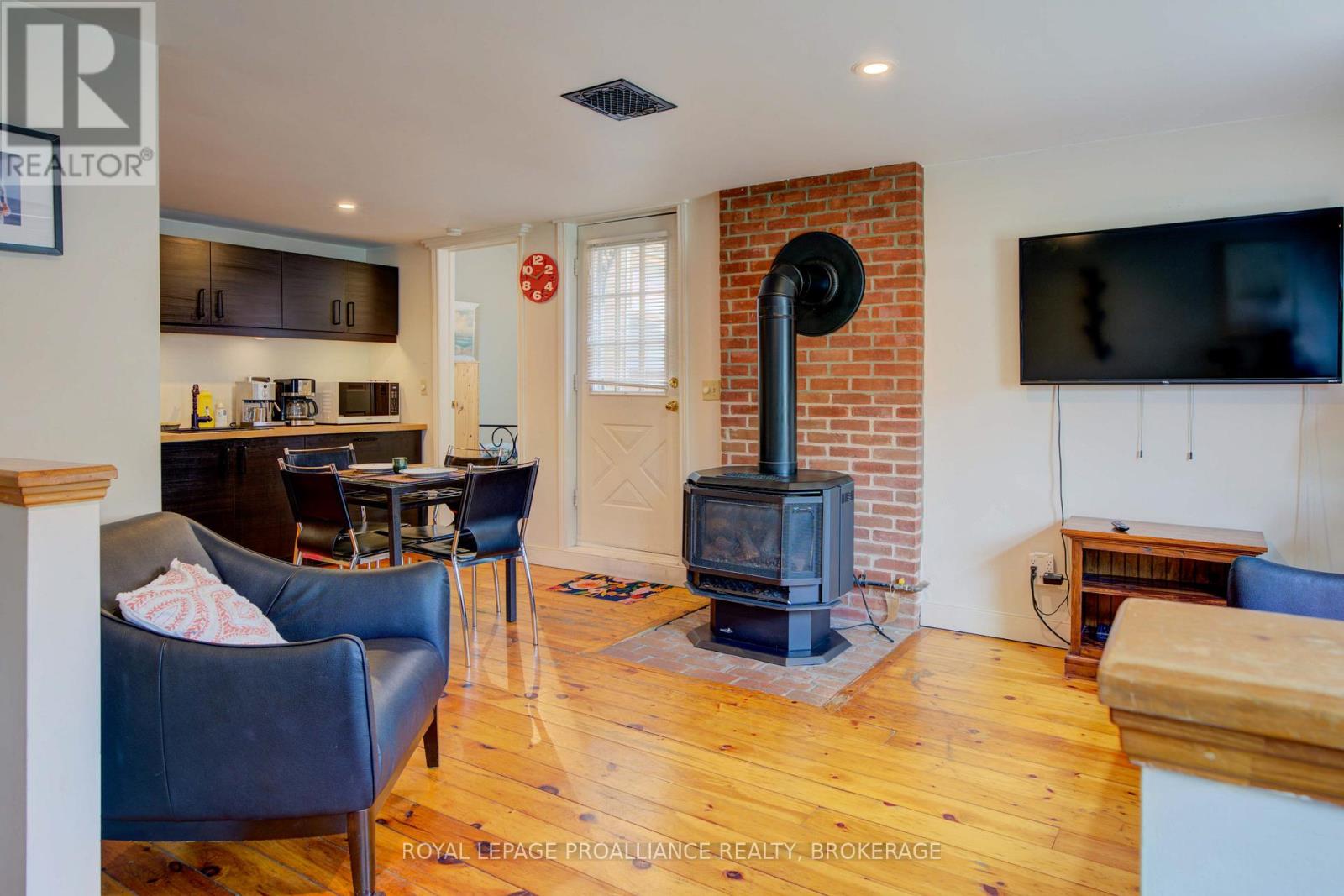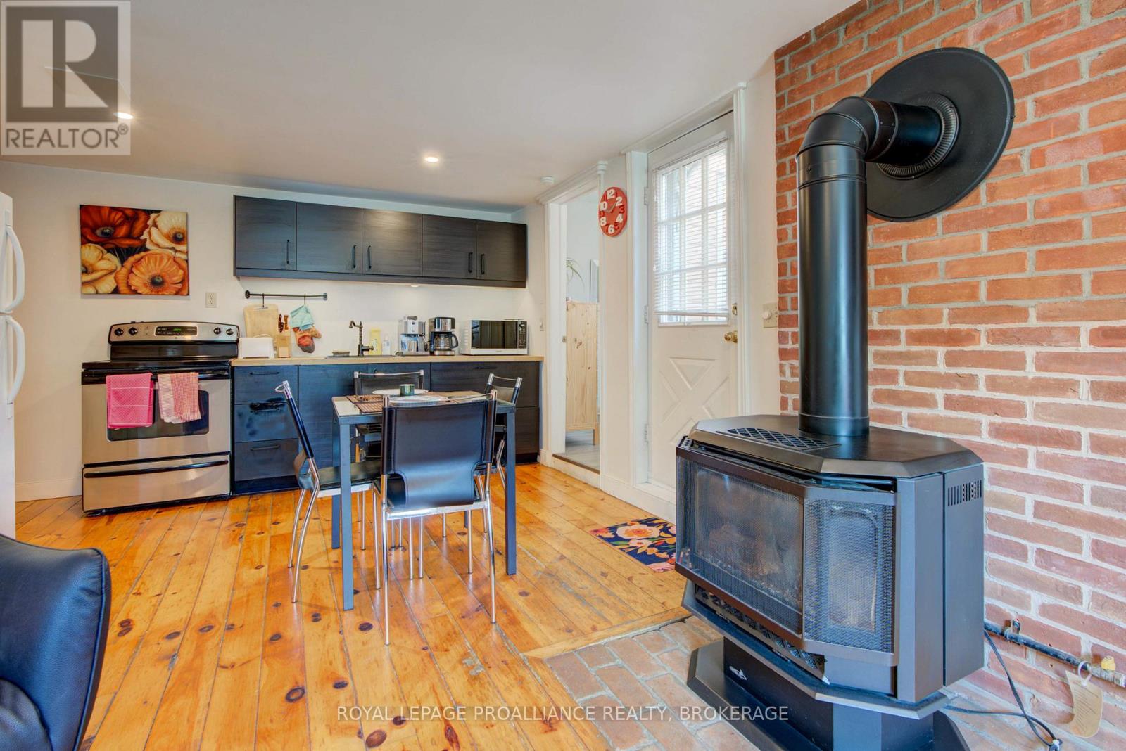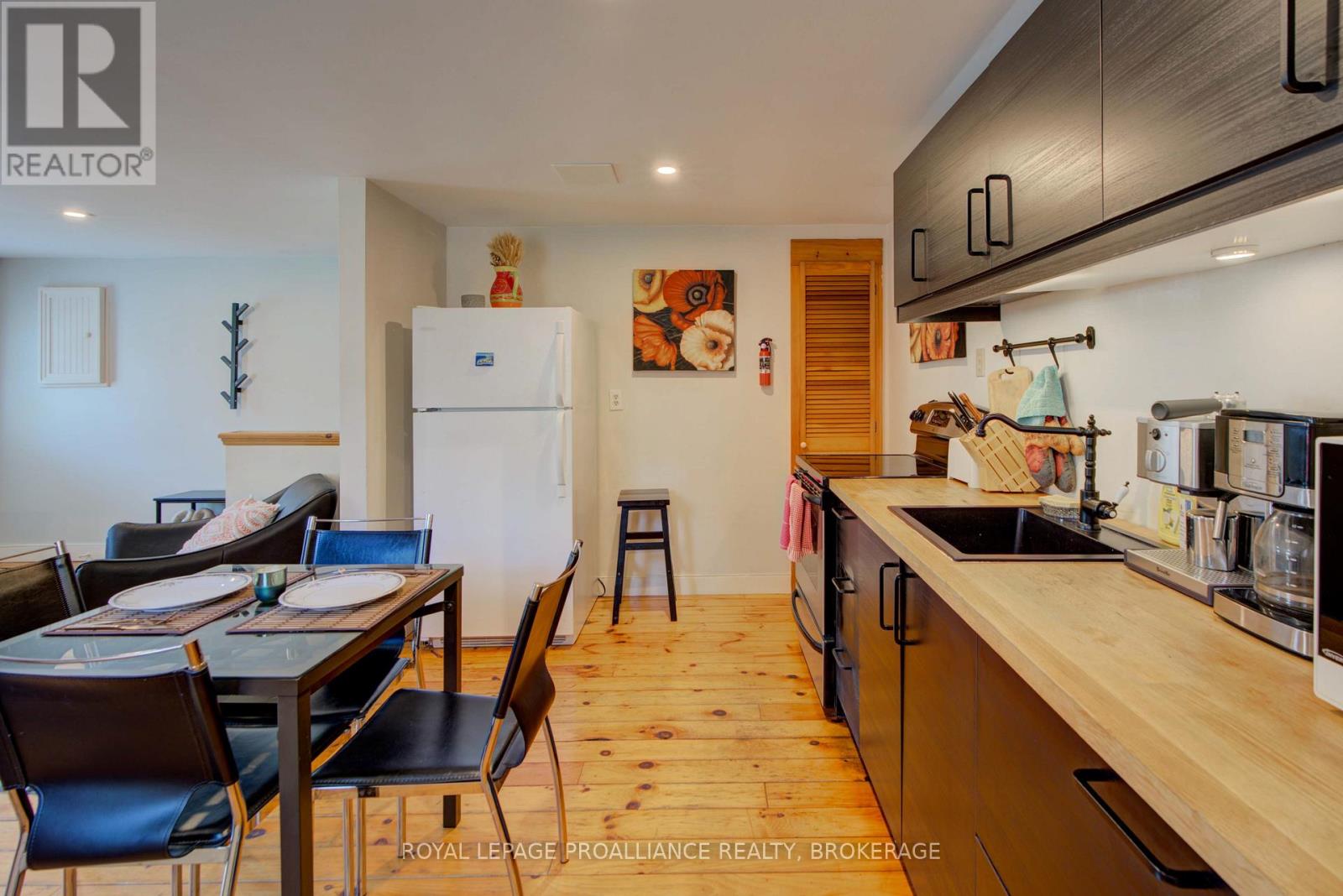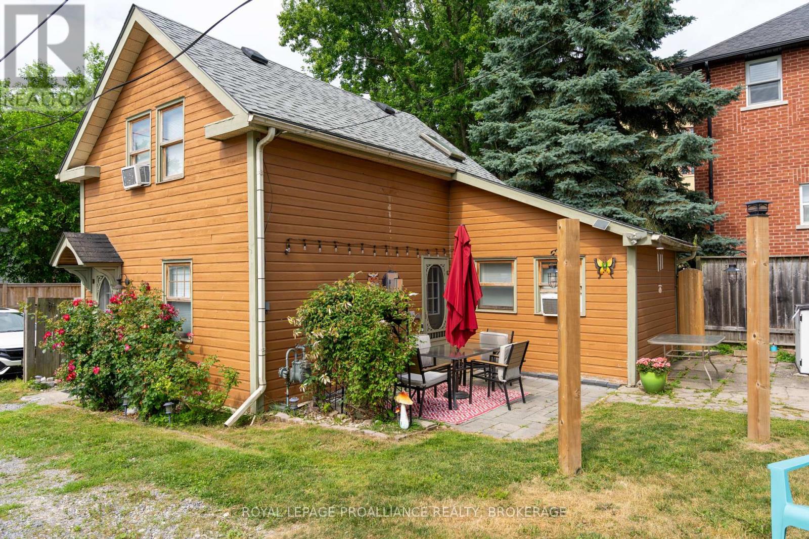Charming two story home in Bagot offering a warm blend of rustic character and modern comfort, tucked away from the street for added privacy while still being just steps from all the action of downtown. This thoughtfully designed 780 sq. ft. residence features 2 bedrooms, 2 bathrooms, and well planned living spaces that maximize functionality and natural light. The 480 sq. ft. main floor includes a welcoming living room with pine flooring, a large wall mounted TV, and comfortable seating. The adjoining kitchen showcases dark cabinetry and wooden countertops, complemented by a bright dining area with a glass top table-an ideal layout for everyday living and entertaining. Upstairs, the 300 sq. ft. second level offers one inviting bedroom. The primary bedroom (180 sq. ft.) features a striking knotty pine accent wall, metal frame bed, geometric lighting, and generous windows. The second bedroom provides a serene, coastal inspired atmosphere perfect for guests or a quiet retreat. The home's bathroom is compact yet efficient, complete with a glass enclosed shower, modern vanity, and a skylight that fills the space with natural light. A dedicated laundry area with full sized appliances adds convenience. Warm wood tones throughout the home pair beautifully with crisp white walls, creating a bright, cozy, and contemporary feel. Hidden quietly behind the historic façade of Bagot Street lies a rare cottage retreat just steps from downtown. Walk to waterfront parks, restaurants, cafés, and boutique shops while enjoying the privacy of a tucked-away setting. A unique opportunity to live in the heart of Kingston without sacrificing tranquility. Walking distance from Hotel Deu, Kingston General, Queen's University. (id:64974)
