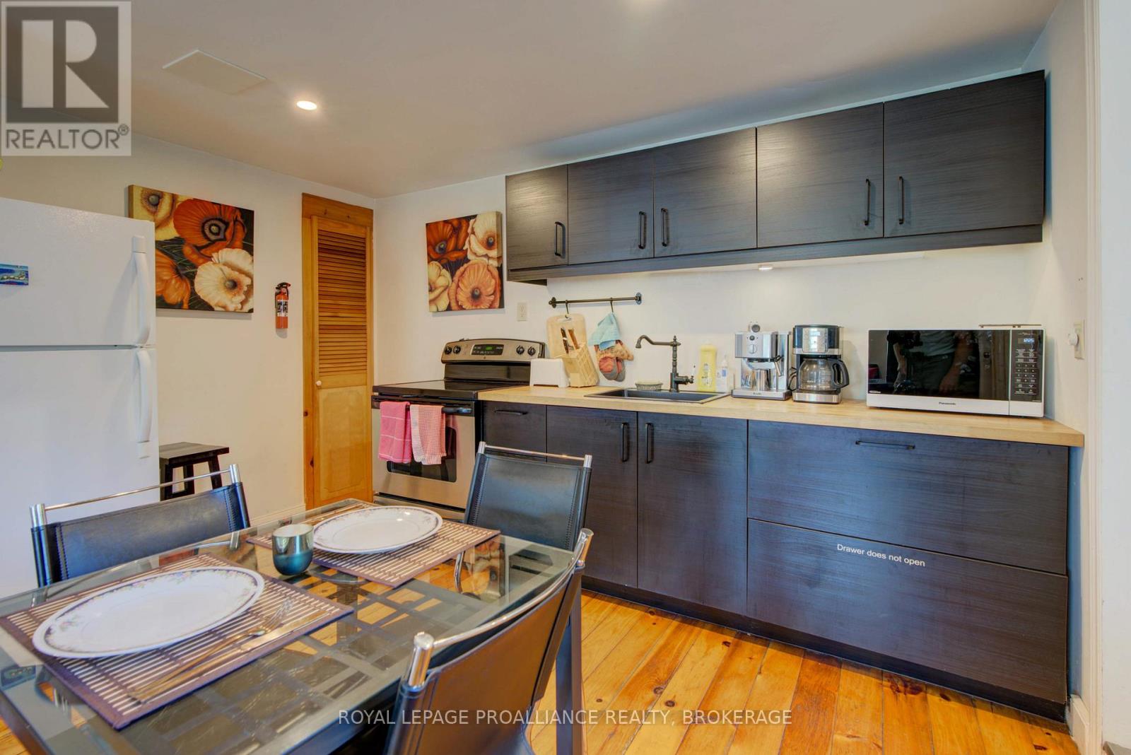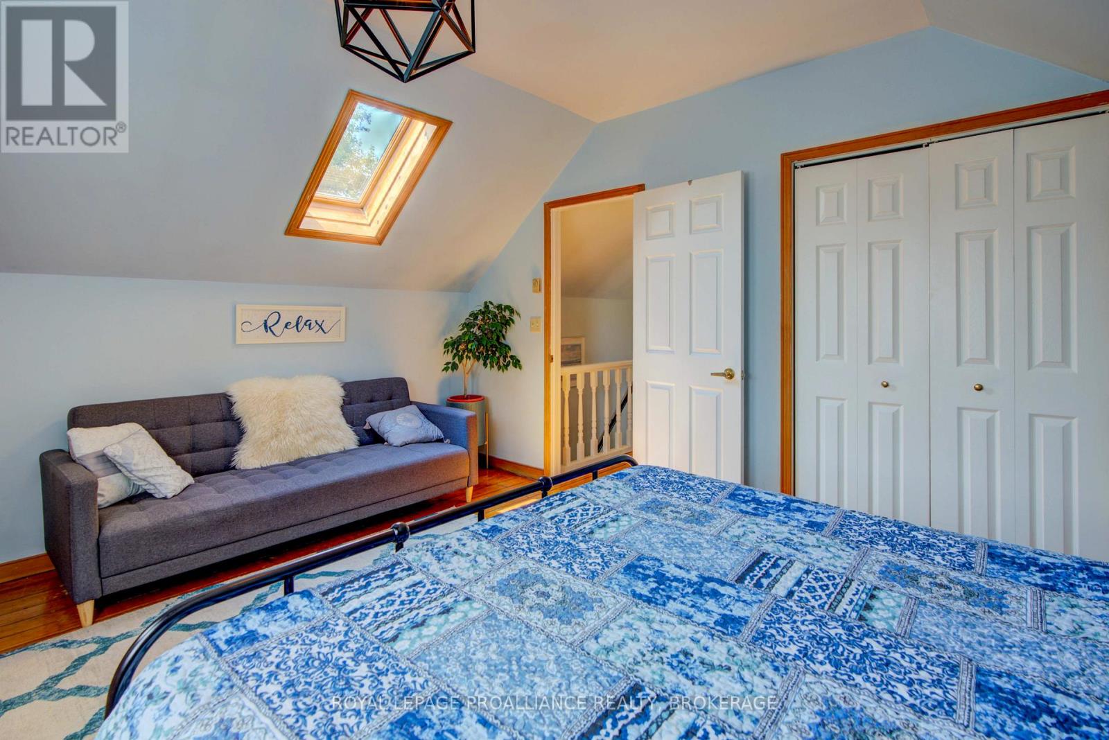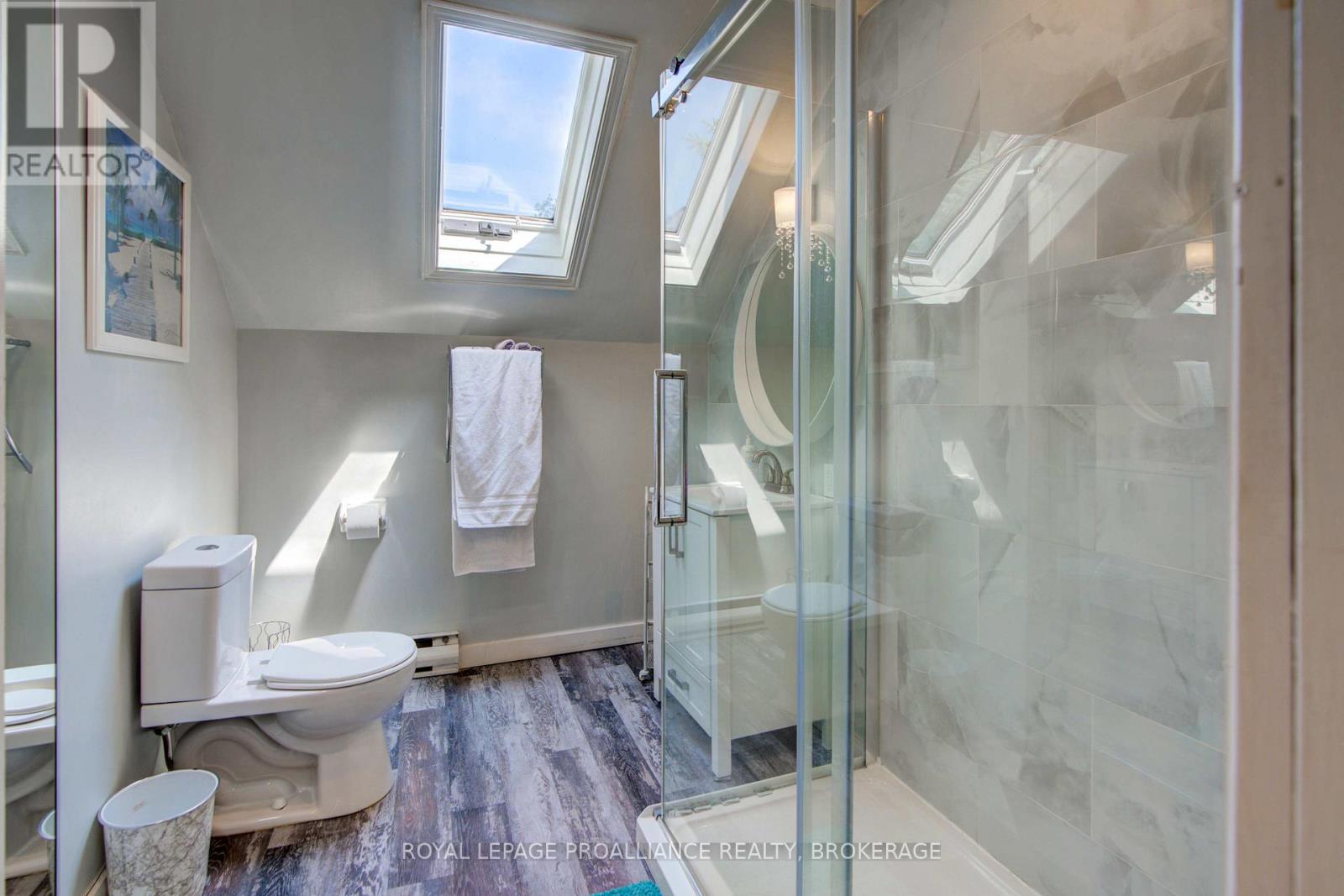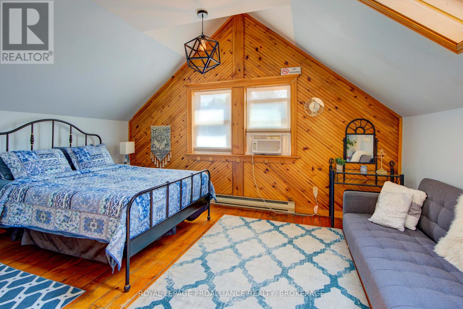 Charming two story home in Bagot offering a warm blend of rustic character and modern comfort, tucked away from the street for added privacy while still being just steps from all the action of downtown. This thoughtfully designed 780 sq. ft. residence features 2 bedrooms, 2 bathrooms, and well planned living spaces that maximize functionality and natural light. The 480 sq. ft. main floor includes a welcoming living room with pine flooring, a large wall mounted TV, and comfortable seating. The adjoining kitchen showcases dark cabinetry and wooden countertops, complemented by a bright dining area with a glass top table-an ideal layout for everyday living and entertaining. Upstairs, the 300 sq. ft. second level offers one inviting bedroom. The primary bedroom (180 sq. ft.) features a striking knotty pine accent wall, metal frame bed, geometric lighting, and generous windows. The second bedroom provides a serene, coastal inspired atmosphere perfect for guests or a quiet retreat. The home's bathroom is compact yet efficient, complete with a glass enclosed shower, modern vanity, and a skylight that fills the space with natural light. A dedicated laundry area with full sized appliances adds convenience. Warm wood tones throughout the home pair beautifully with crisp white walls, creating a bright, cozy, and contemporary feel. Hidden quietly behind the historic façade of Bagot Street lies a rare cottage retreat just steps from downtown. Walk to waterfront parks, restaurants, cafés, and boutique shops while enjoying the privacy of a tucked-away setting. A unique opportunity to live in the heart of Kingston without sacrificing tranquility. Walking distance from Hotel Deu, Kingston General, Queen's University. (id:64974)
