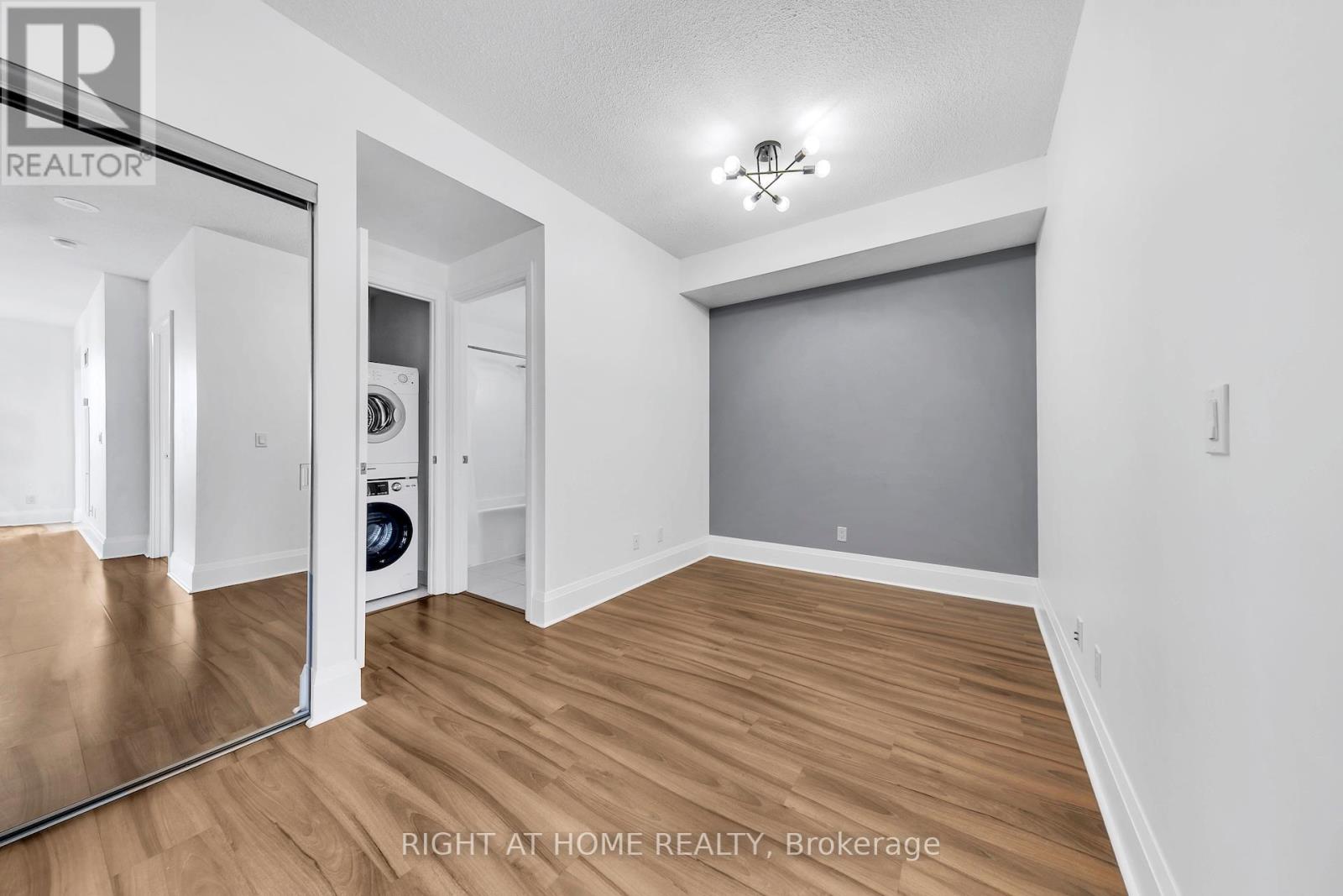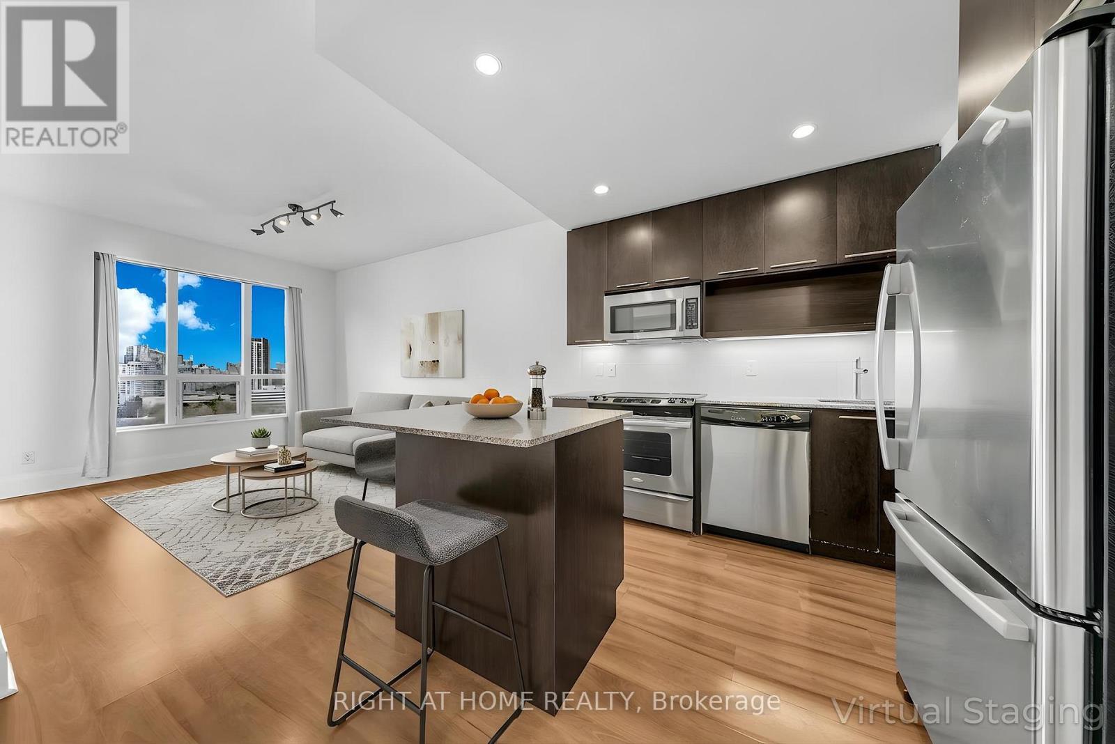 Experience elevated city living in this bright one-bedroom plus den condo featuring spectacular northwest city and park views from a high floor on the quiet side of the building, away from highway noise. Step out onto your private open-air balcony to relax and enjoy sweeping sunset views overlooking the surrounding parks and playgrounds. The thoughtfully designed layout includes a spacious den, large enough to function as a guest room, nursery, dining area, or home office, offering exceptional flexibility to suit your lifestyle. The modern kitchen features full-size stainless steel appliances, including a bottom-freezer fridge, a slide-in electric cooktop and oven, and a microwave oven with range hood. Enjoy the convenience of an ensuite front-load laundry, mirrored sliding closet doors, and window coverings and light fixtures. This meticulously maintained, pet- and smoke-free suite also includes a premium parking space located just steps from the elevator entrance. Ideally located within walking distance to public transit, park, playground, and a nearby elementary school, with quick access to Highways 401 and 404 and the subway line. Don't miss the nearby shopping, local eateries, and everyday conveniences. Residents also enjoy an impressive clubhouse with an indoor pool, fitness centre, sauna, theatre room, library, party and dining rooms, billiards, and guest suites. (id:64974)