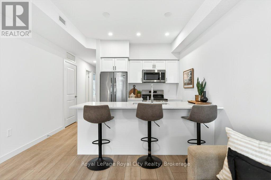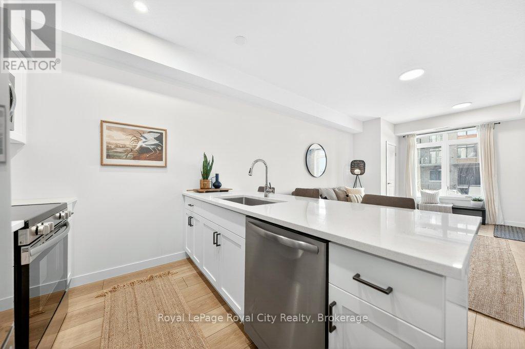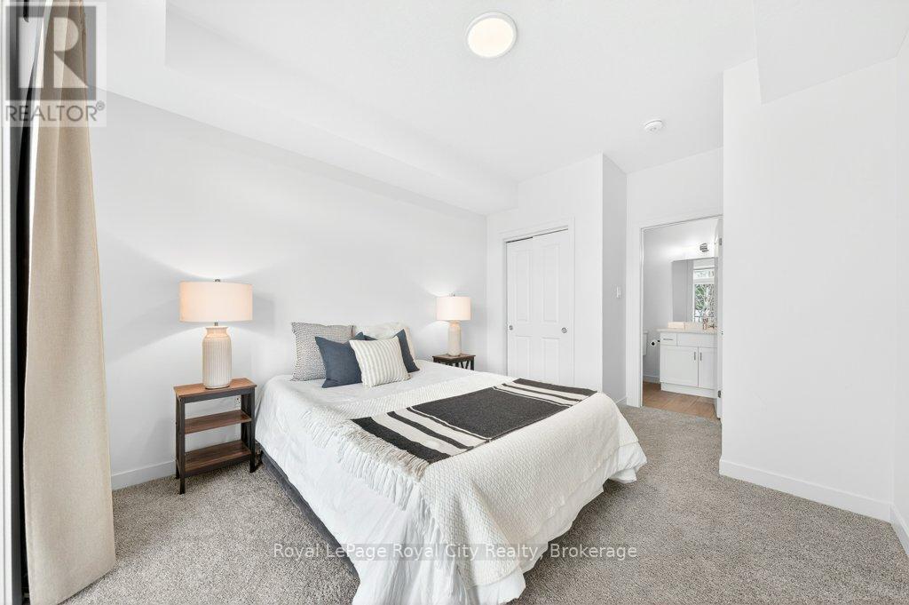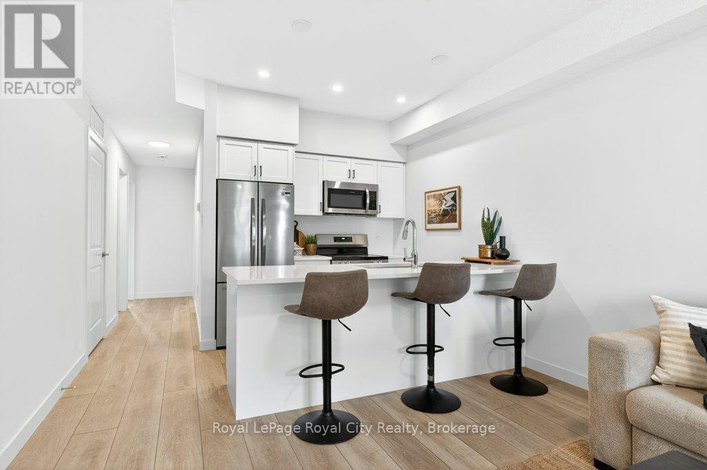 Experience modern living and convenience in this main level unit at Northside! This beautiful stacked townhome offers a single floor, open-concept layout. The spacious living area offers room to lounge and a kitchen complete with custom cabinetry, quartz countertops and stainless steel appliances. The primary bedroom features large windows, a 3-piece ensuite and sliding glass doors leading to a private balcony. The second bedroom has an equally spacious layout and closet, with a main bathroom down the hall. In-suite laundry is located in the large utility closet, allowing for additional storage space. Enjoy premium features and modern finishes in this vibrant community! Conveniently located on the edge of Guelph, between city and green space. Near many amenities, including the SmartCentres plaza, shopping, restaurants, trails, transit and more. (id:64974)