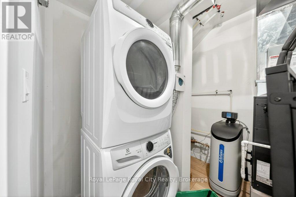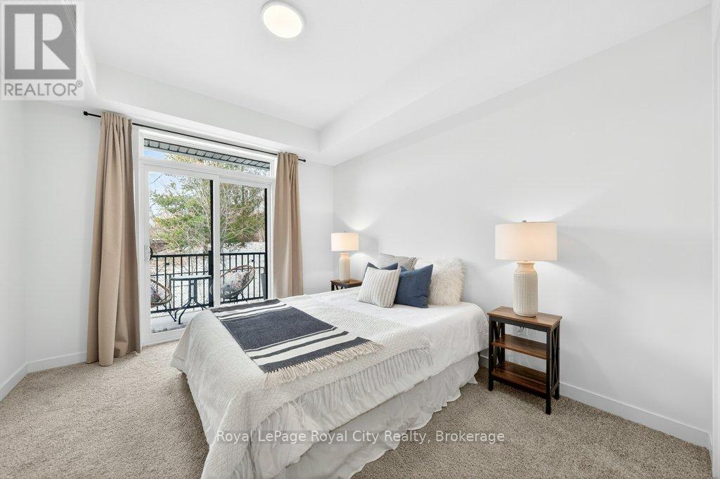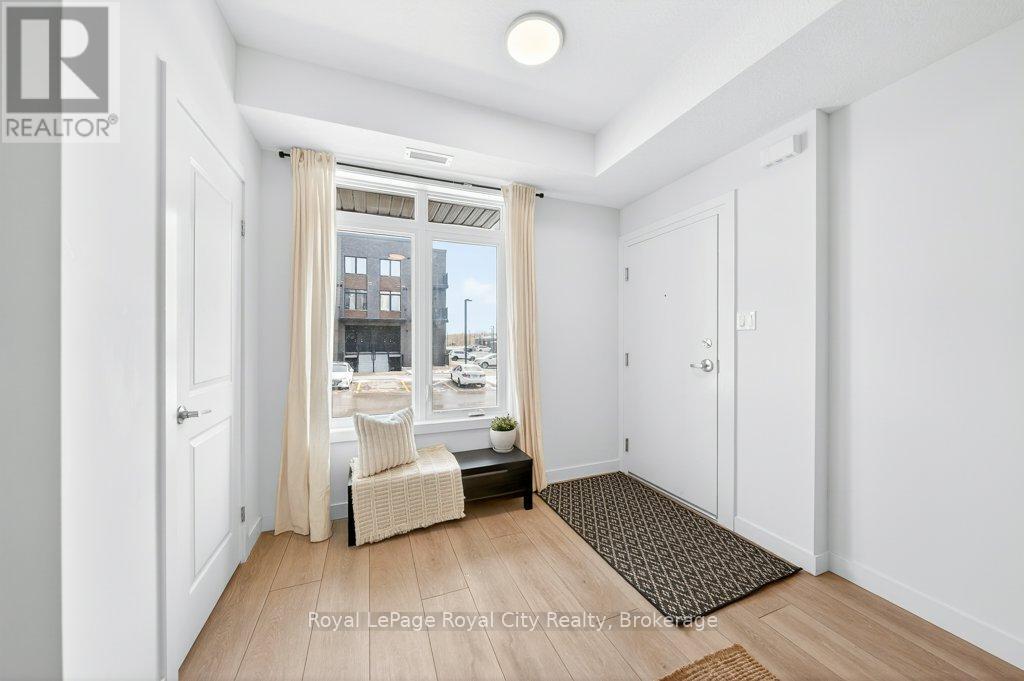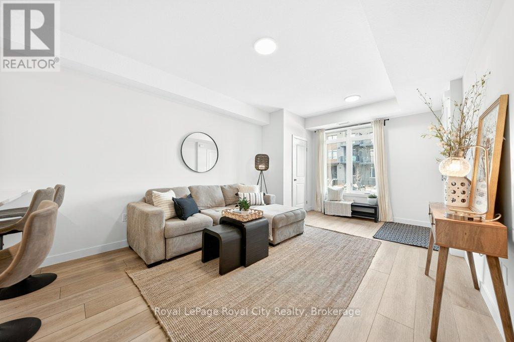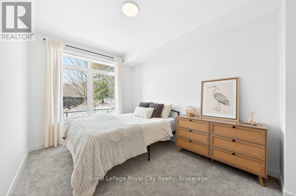 Experience modern living and convenience in this main level unit at Northside! This beautiful stacked townhome offers a single floor, open-concept layout. The spacious living area offers room to lounge and a kitchen complete with custom cabinetry, quartz countertops and stainless steel appliances. The primary bedroom features large windows, a 3-piece ensuite and sliding glass doors leading to a private balcony. The second bedroom has an equally spacious layout and closet, with a main bathroom down the hall. In-suite laundry is located in the large utility closet, allowing for additional storage space. Enjoy premium features and modern finishes in this vibrant community! Conveniently located on the edge of Guelph, between city and green space. Near many amenities, including the SmartCentres plaza, shopping, restaurants, trails, transit and more. (id:64974)
