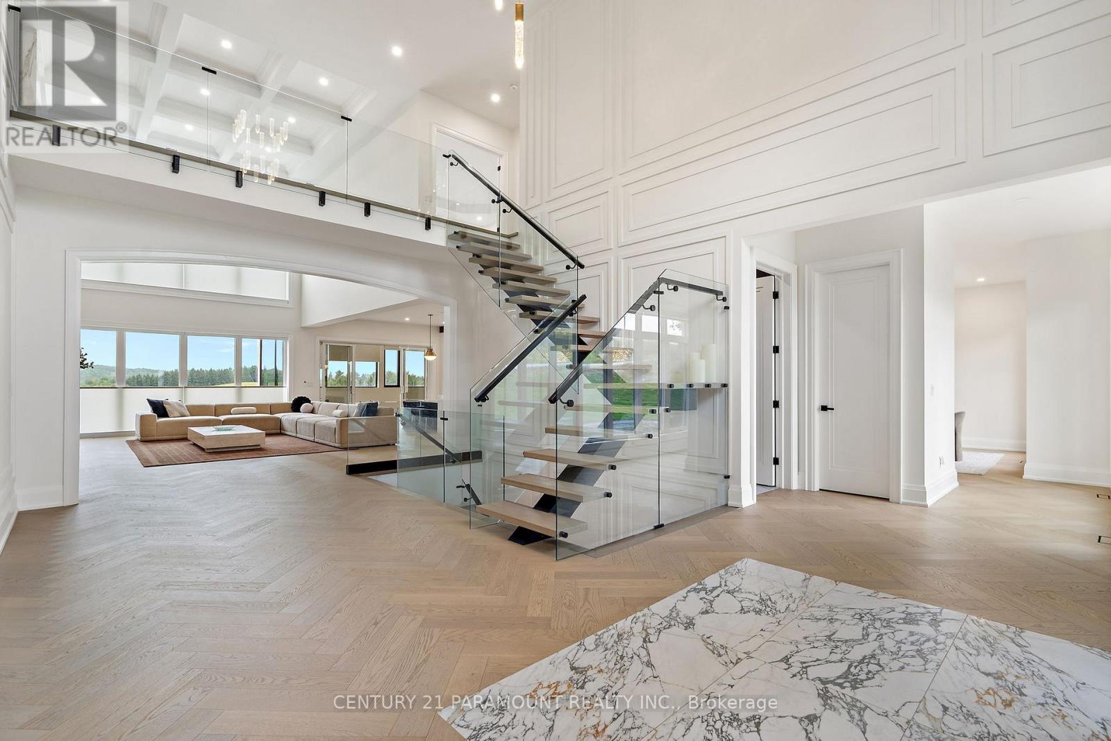 Discover this one-of-a-kind estate on 2.76-acres, nestled in the heart of a multi-million dollar Palgrave community. Providing panoramas of the majestic conservation park,the home spans over 10,000 sqft 7032+3000 sqft fully finished walk out basement. Upon entrance, you are welcomed by a grand foyer, boasting 22 feet ceiling,accompanied by a 23 feet ceiling in the cozy yet elegant family room. Classic hardwoodflooring in a herringbone pattern is complemented by floor to ceiling custom walnut and stonefireplace.With colours and design tastefully chosen to create a luxury atmosphere, while alsoinspiring warmth and comfort, a matching chef gourmet kitchen greets you, complemented byquality appliances, natural stone countertops, and a custom designed kitchen island. A fully functional spice kitchen to align with all your culinary ventures whichextends to a year round, heated and air conditioned deck, with panoramic views of theHills.The main floor features a professional home office, with its own entrance to the house, and two mudrooms boasting elegant carpentry . Access to the second floor is via the state-of-the-art floating staircase, finished with glass railings. Upstairs, the masterbedroom features its own spa-like ensuite, a tasteful walk in closet, and its very own terracewith unmatched views. All bedrooms also come with custom walk-in closets and unique ensuites.Additionally, access to the laundry room, with elegant and practical cabinetry.The lower level is paradise for entertainment and joy, featuring a high quality home theatre,a wet bar,wine cabinet, a home gym, and two bedrooms each with their ensuites. Theestate boasts a fully walk out basement, coupled with a loggia, which ensures seamless outdoor-indoor living,is pre-prepared for a three story elevator and is custom designed to ensure seamless accessibility and comfort.This estate tells a story, and balances warmth, comfort, and luxury with ease, truly making ita home to cherish. (id:64974)
