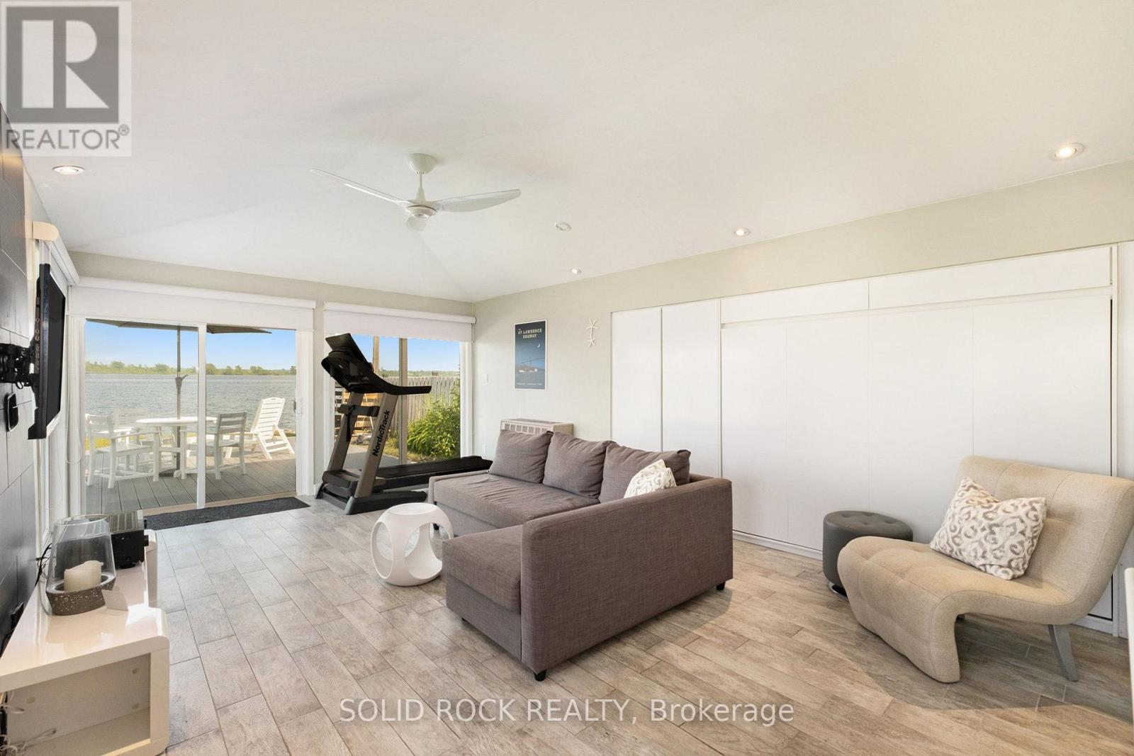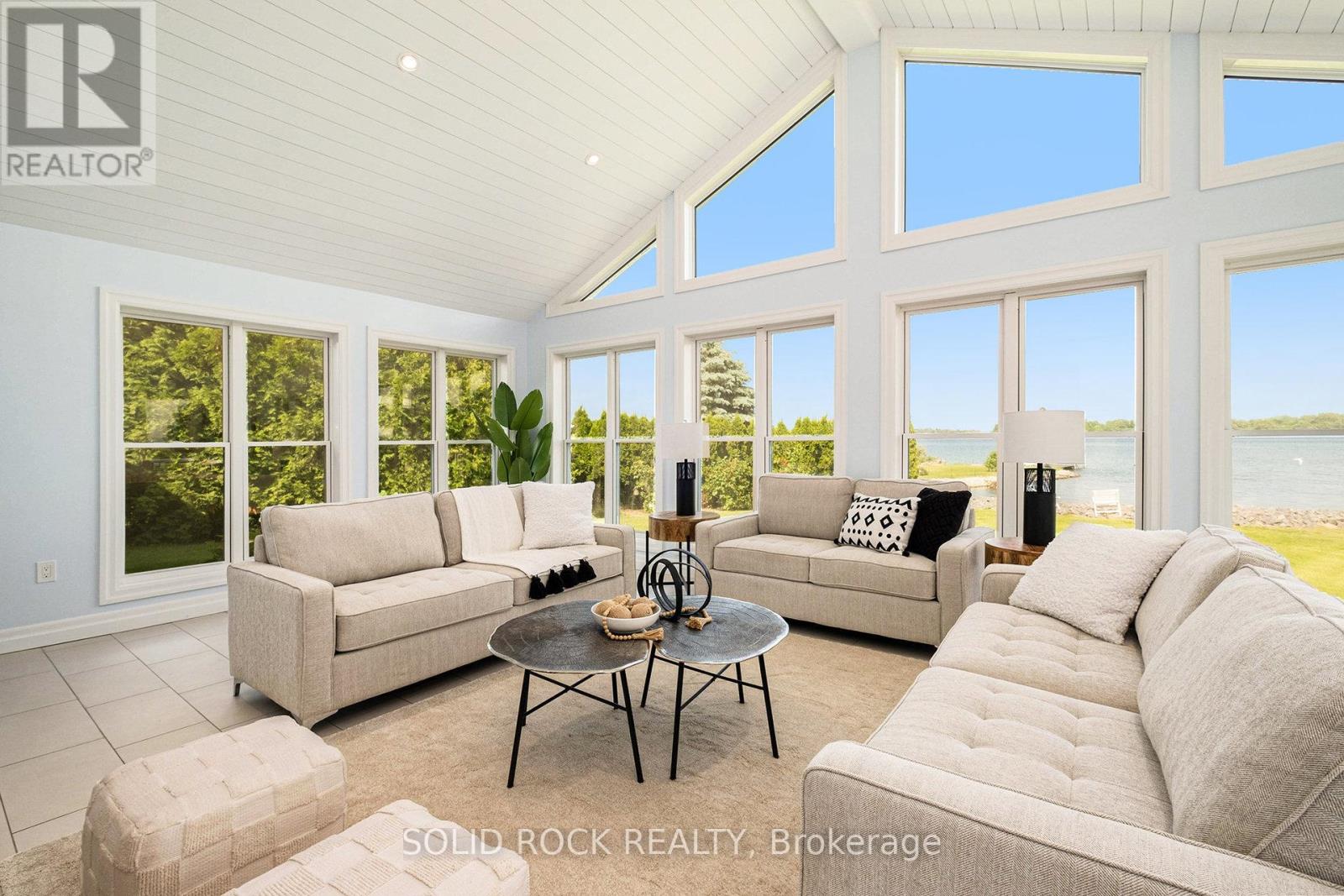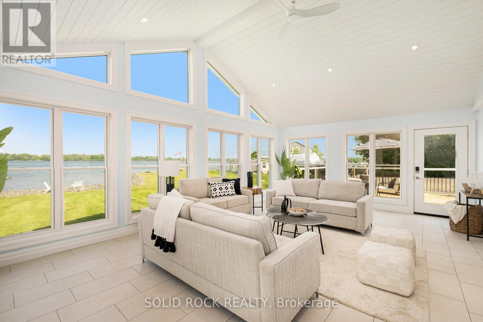 Step into refined waterfront living with this completely renovated 3-bedroom bungalow, blending cozy cottage charm with modern luxury. Nestled on a scenic waterfront of the St Lawrence River, this home offers an open-concept layout designed to make the most of its stunning views and natural light. The heart of the home is the show-stopping kitchen, featuring granite/marble countertops, a large island with a double sink, gleaming stainless steel appliances (2025) including a gas stove and classic white tile backsplash. Adjacent to the kitchen, a spacious galley with matching finishes and an oversized walk-in pantry offers lots of storage. Beamed ceilings run throughout the home, adding warmth and character. The inviting living room, centered around a gas fireplace with built-in shelving and wood accents, flows seamlessly into a striking A-frame sunroom with panoramic water views. Ceramic floors, soaring windows, and direct access to a wooden deck create the perfect space to unwind or entertain. Enjoy your morning coffee or an evening soak under the stars with a hot tub and gazebo just off the back deck. The primary bedroom overlooks the water and includes two generous closets with custom built-ins. A second bedroom enjoys the convenience of its own private powder room, while the main bathroom features elegant ceramic flooring and a rainfall shower. Ideal for hosting or generating income, two stylish bunkies sit close to the water. The larger bunkie boasts its own deck facing the lake, a partial kitchen with quartz counters, country-style sink, stainless steel fridge and vent hood, living space with Murphy bed, and a full 3-piece bath. The smaller bunkie includes a screened-in porch and its own powder room. Whether you're entertaining, relaxing, or hosting guests, every detail has been considered for easy, elegant living by the water. Approx 1 hr from Ottawa, 3 hrs from Toronto and minutes to hwy 401 & 416. (id:64974)