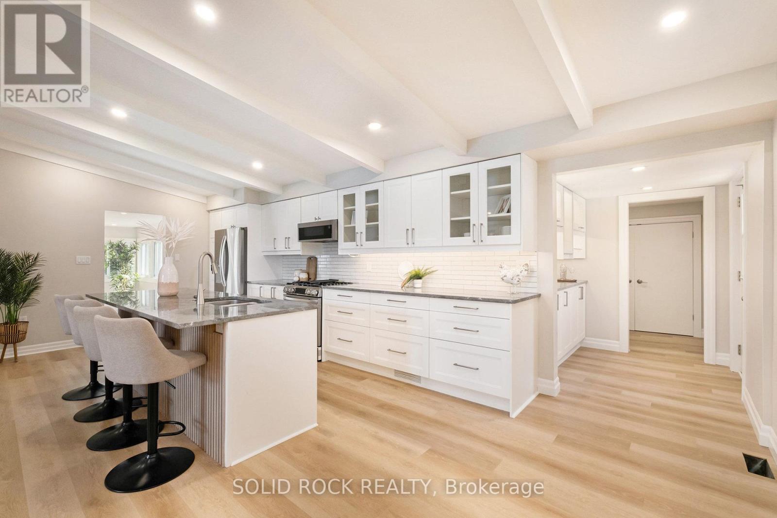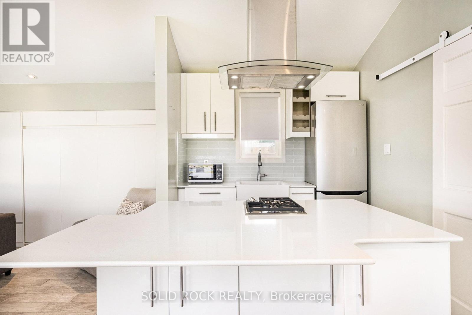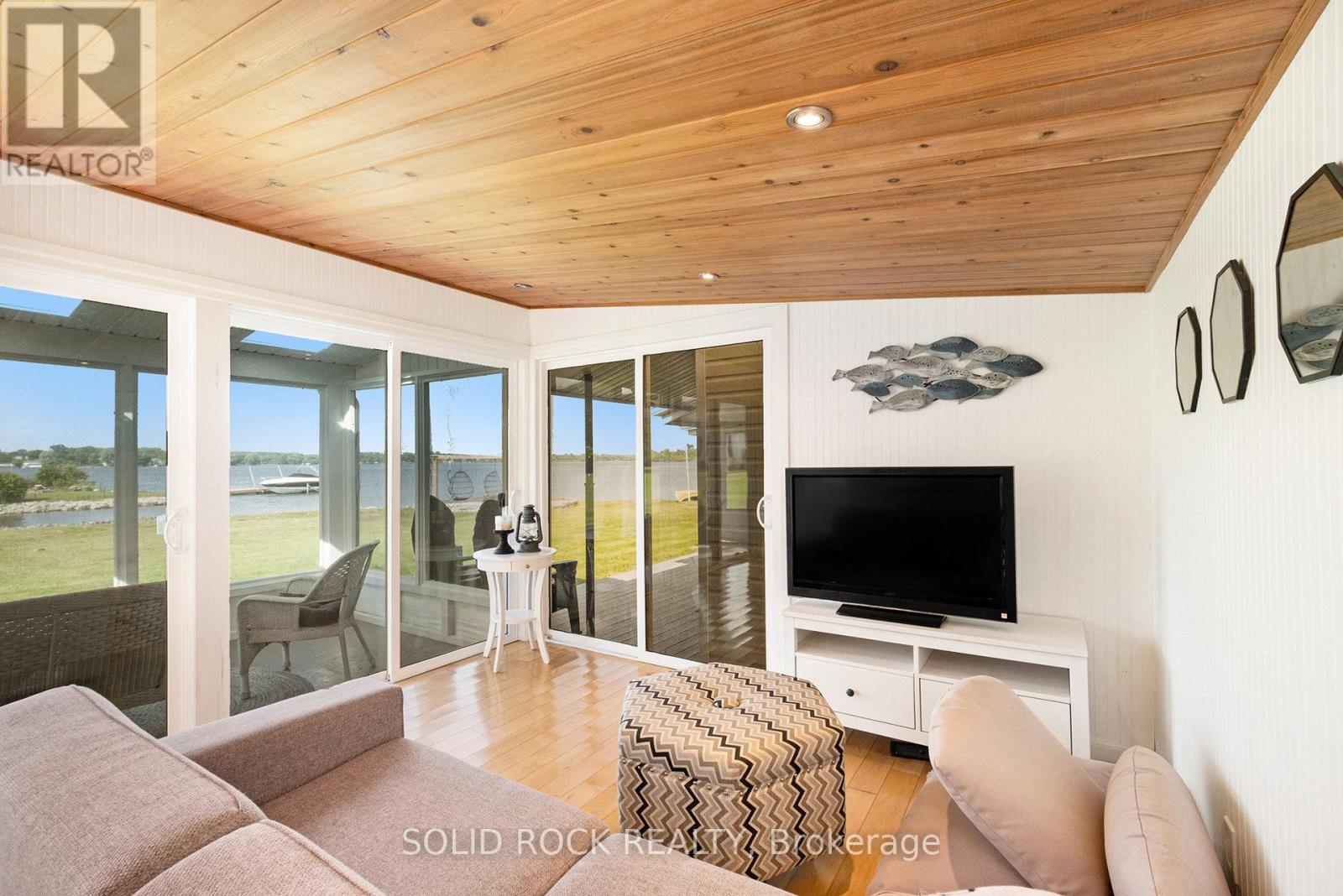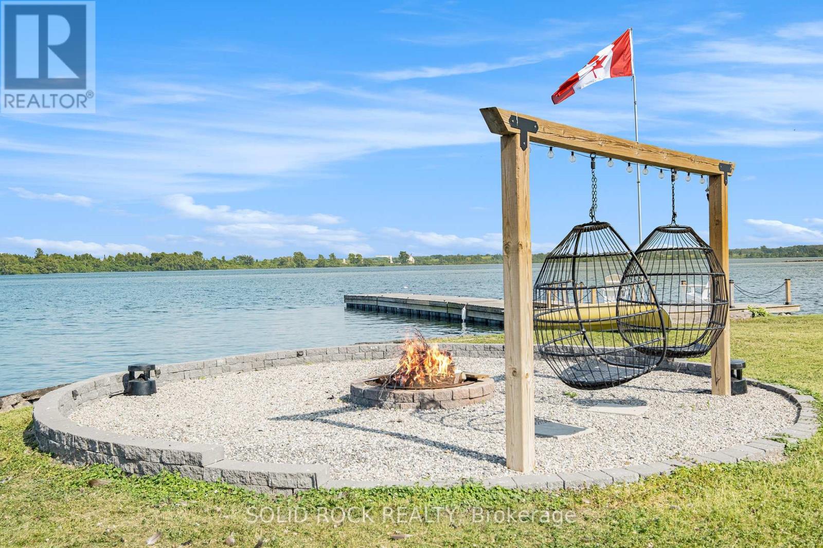 Step into refined waterfront living with this completely renovated 3-bedroom bungalow, blending cozy cottage charm with modern luxury. Nestled on a scenic waterfront of the St Lawrence River, this home offers an open-concept layout designed to make the most of its stunning views and natural light. The heart of the home is the show-stopping kitchen, featuring granite/marble countertops, a large island with a double sink, gleaming stainless steel appliances (2025) including a gas stove and classic white tile backsplash. Adjacent to the kitchen, a spacious galley with matching finishes and an oversized walk-in pantry offers lots of storage. Beamed ceilings run throughout the home, adding warmth and character. The inviting living room, centered around a gas fireplace with built-in shelving and wood accents, flows seamlessly into a striking A-frame sunroom with panoramic water views. Ceramic floors, soaring windows, and direct access to a wooden deck create the perfect space to unwind or entertain. Enjoy your morning coffee or an evening soak under the stars with a hot tub and gazebo just off the back deck. The primary bedroom overlooks the water and includes two generous closets with custom built-ins. A second bedroom enjoys the convenience of its own private powder room, while the main bathroom features elegant ceramic flooring and a rainfall shower. Ideal for hosting or generating income, two stylish bunkies sit close to the water. The larger bunkie boasts its own deck facing the lake, a partial kitchen with quartz counters, country-style sink, stainless steel fridge and vent hood, living space with Murphy bed, and a full 3-piece bath. The smaller bunkie includes a screened-in porch and its own powder room. Whether you're entertaining, relaxing, or hosting guests, every detail has been considered for easy, elegant living by the water. Approx 1 hr from Ottawa, 3 hrs from Toronto and minutes to hwy 401 & 416. (id:64974)
