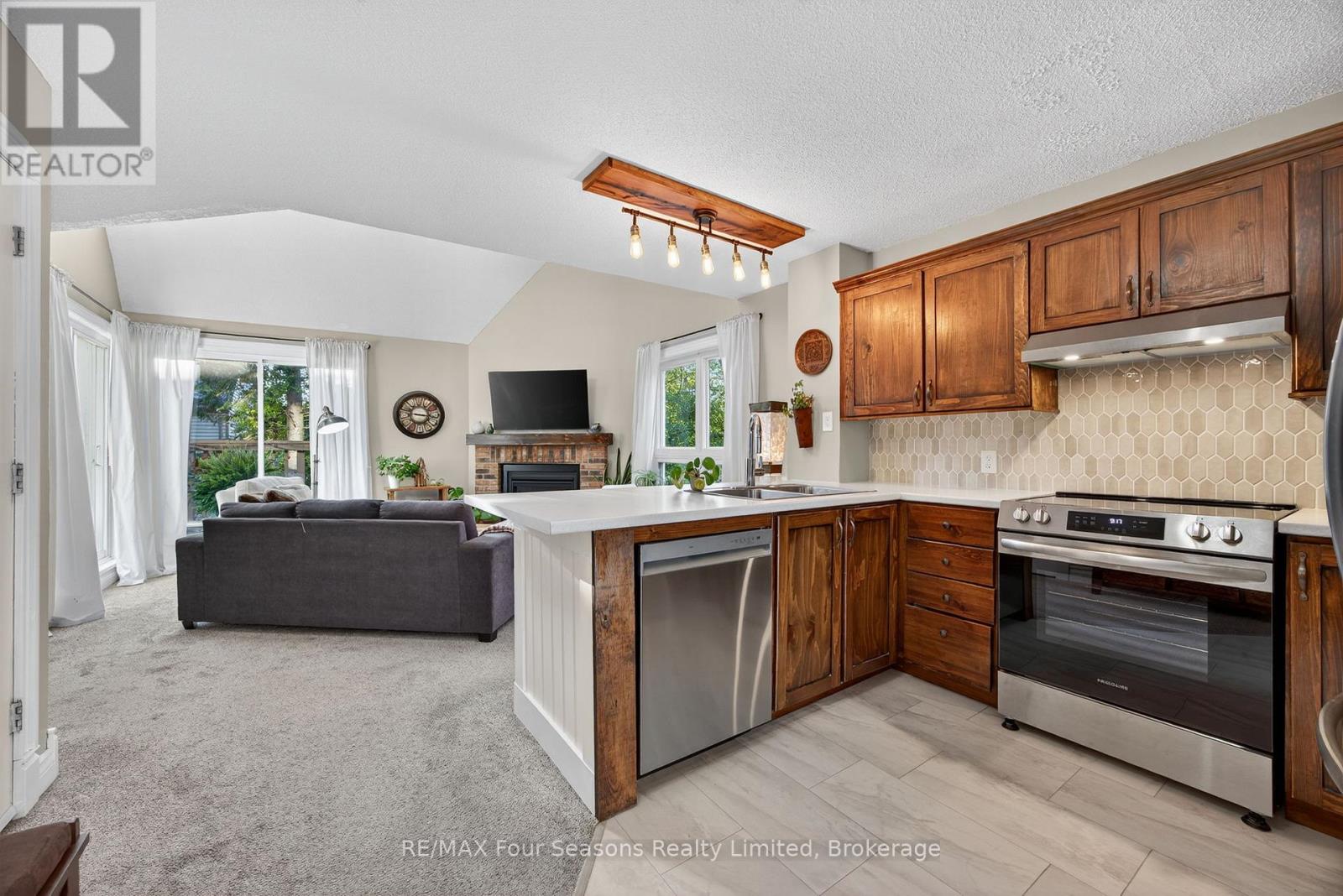 Welcome to Unit 164 at 51 Trott Boulevard - a stylish and thoughtfully designed condo in the heart of Collingwood, offering comfort, convenience and character. This bright residence features 2 spacious bedrooms and 2 full baths, providing an excellent layout for either full-time living or a flexible getaway. The open-concept living area invites you in with a seamless flow from kitchen to dining to living room, ideal for entertaining or relaxed lounging. A cozy gas fireplace anchors the space, while large windows capture natural light and create a warm, inviting ambiance. Step out onto your private balcony and enjoy fresh air. In your kitchen you'll appreciate modern finishes and practical touches: sleek cabinetry, stainless steel appliances, and ample counter space. Both bedrooms provide restful retreats, with the primary suite boasting its own ensuite bath for added privacy and convenience. The second bedroom is generously sized and is served by a full bath - perfect for guests, overnight visitors or a home-office setup. Additional highlights include in-unit laundry, an assigned parking space, and proximity to a variety of amenities - from downtown Collingwood's restaurants and shops to hiking trails, beaches and winter-sport destinations in the region. Whether you're seeking a lock-and-leave second home or a full-time residence with lifestyle appeal, this unit offers an elegant, low-maintenance option in a vibrant community. Don't miss your chance to call Unit 164 at 51 Trott Boulevard your next home-base in Collingwood. (id:64974)
