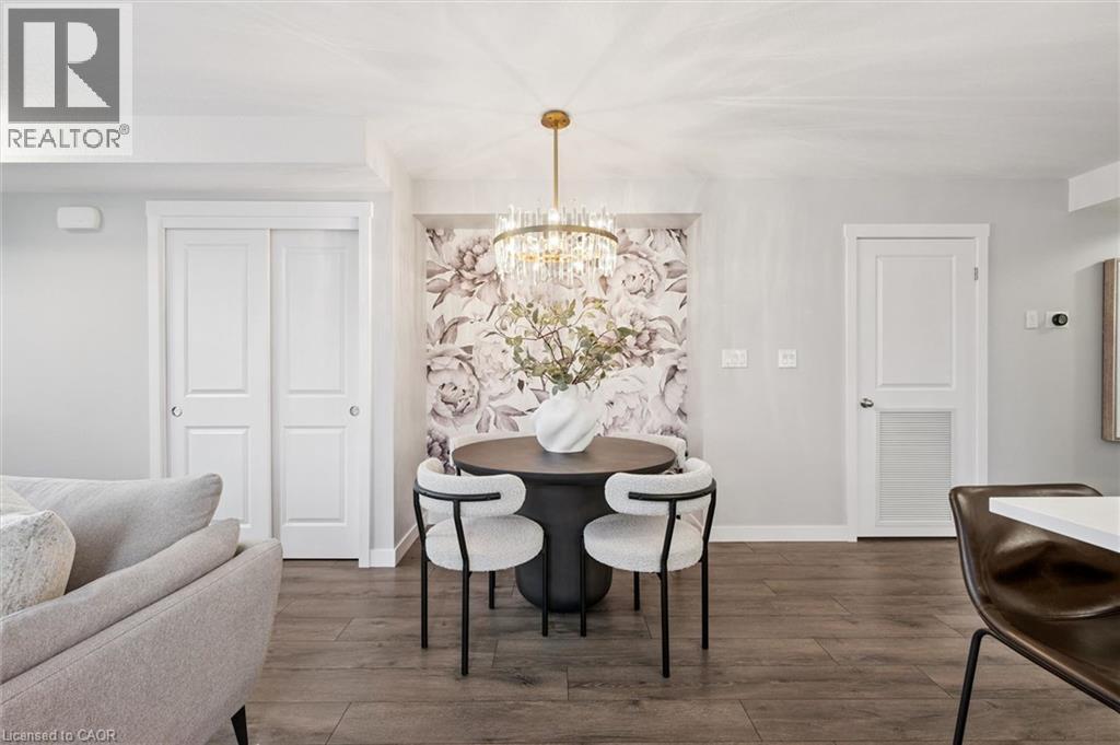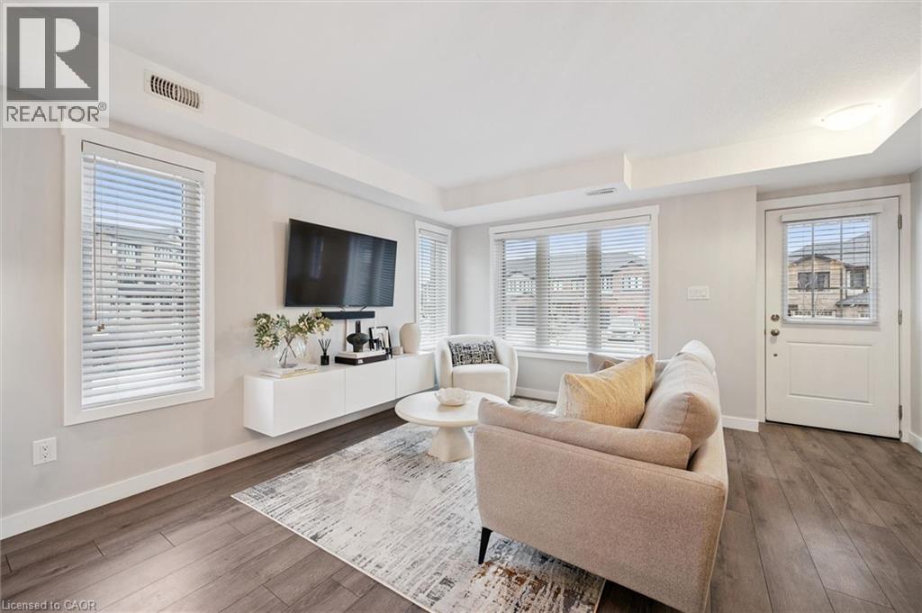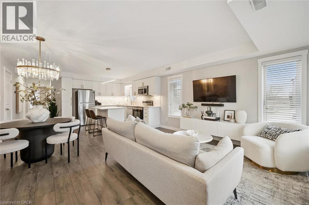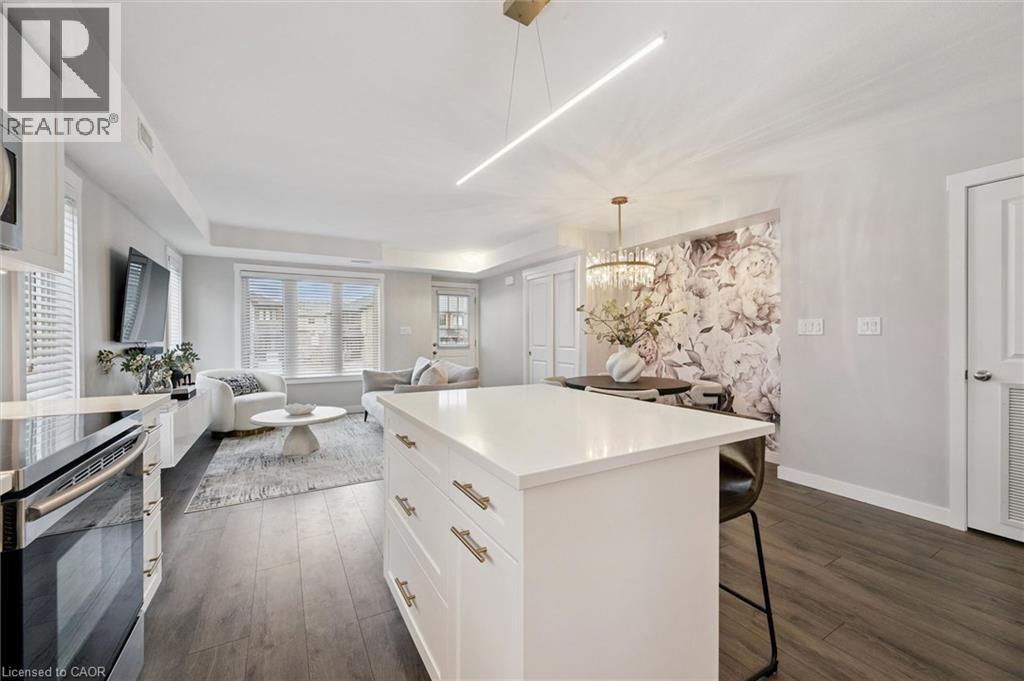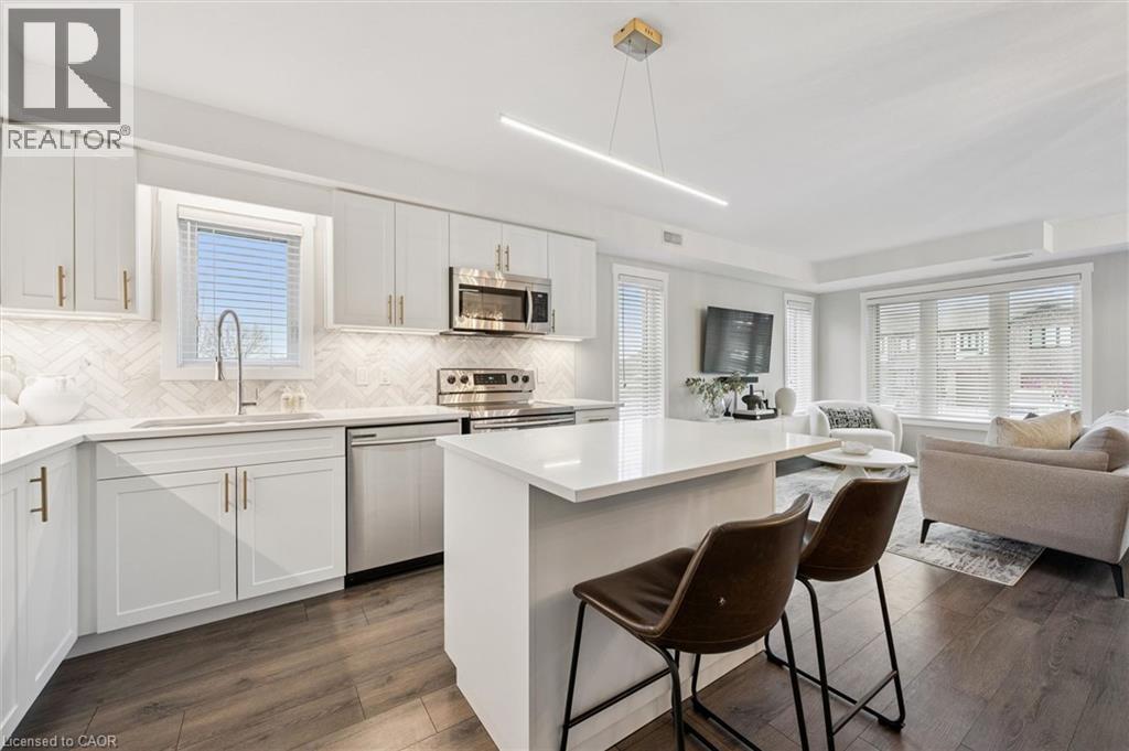 Welcome to this beautifully upgraded 2-bedroom, 2-bathroom corner unit townhouse in the highly sought after Huron Heights community. This single-level home offers a rare blend of designer finishes, functional layout, and everyday convenience. Thoughtfully curated by MC Design Styles, the interior showcases a cohesive, elevated aesthetic throughout. The kitchen features a timeless herringbone Carrera marble backsplash, custom under-cabinet lighting, upgraded fixtures, and brass hardware. The open-concept living space is anchored by a custom built-in media unit and textured accent wall, while Lutron dimmers and a fully integrated Nest system provide seamless smart home living. Enjoy upgraded designer lighting throughout, including a statement LED island feature and modern dining chandelier, complemented by premium custom window treatments that add both privacy and a polished, high-end finish. The spacious primary bedroom offers a spa-inspired ensuite, while the second bedroom and full bath provide flexibility for guests or a home office. As a bright corner unit, the home is filled with natural light and designed for comfortable living. Ideally located close to highway access, Longo’s, RBJ Schlegel Park, walking trails, schools, and more. A standout lease opportunity in a vibrant, family-friendly neighbourhood. (id:64974)