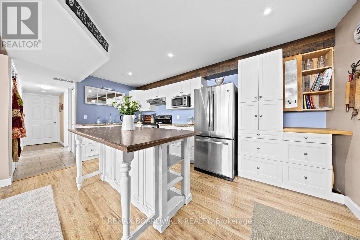 Welcome to your bright country retreat just minutes from Perth and Carleton Place. Set on a sunny 1-acre lot, this beautifully maintained 3-bedroom, 2-bath high-ranch bungalow offers exceptional flexibility for families, entertainers, or multi-generational living. The open-concept main floor is filled with natural light and features solid maple hardwood floors, updated lighting, and a spacious renovated kitchen with new cabinetry, countertops, sink, faucet, dishwasher, and ceramic tile backsplash. Garden doors off the living room lead to a 10' x 19' cedar deck with privacy wall, creating the perfect outdoor extension of the living space. The lower level offers a fully equipped in-law suite with its own entrance through the breezeway between the house and the garage. This level includes a large bedroom, full bathroom, family room, and a second kitchen with a beautiful island-ideal for extended family or flexible living arrangements.Outdoor entertaining truly shines here. Enjoy a 14' x 14' composite deck with pergola, bar area, fire pit with built-in bench seating, raised garden beds, raspberry patches, perennial gardens, a productive Cortland apple tree, and beautiful crabapple trees. A 24-ft heated above-ground saltwater pool with cedar deck adds to the summer fun (liner 2024, heater 2025, salt cell 2026). The insulated and drywalled double garage is ready to be heated and makes an excellent workshop. Two sheds offer additional storage, and seven newer appliances are included. A rare opportunity to enjoy sunshine, space, and incredible entertaining areas while remaining close to Perth, Carleton Place, and easy highway access for commuting. (0.95 acres to be precise.) (id:64974)