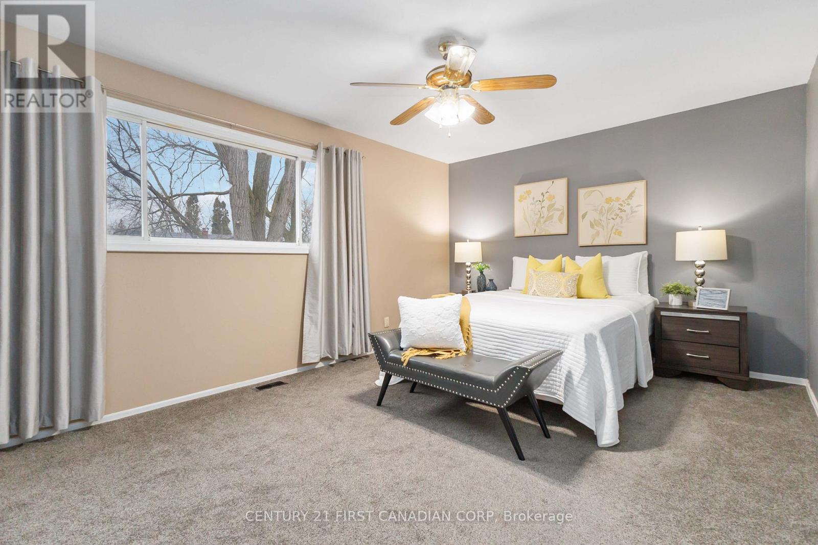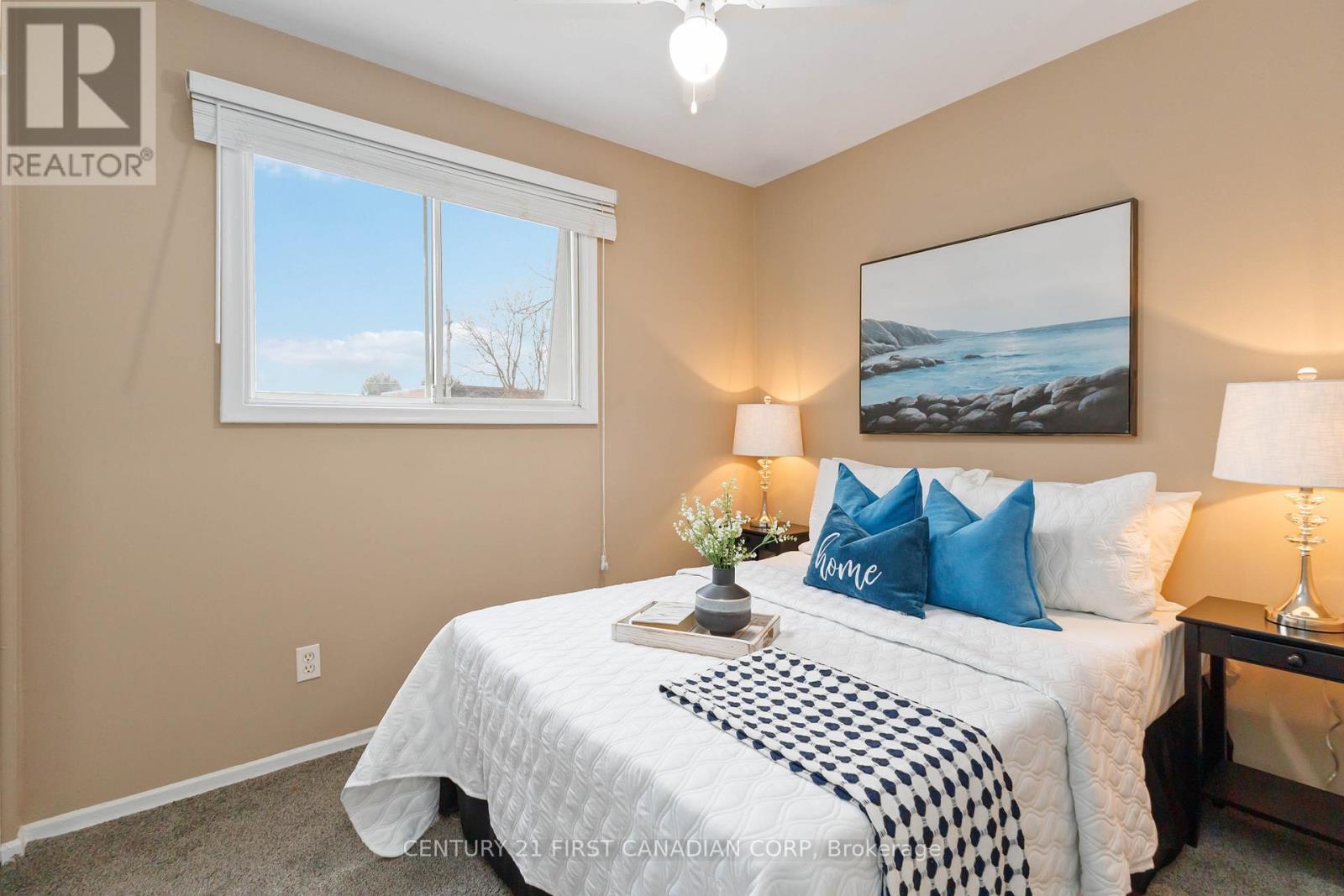 Welcome to this well kept 3 bedroom, 2 storey townhome offering a smart layout and excellent versatility for a wide range of buyers. Featuring forced air gas furnace heating (not electric baseboard) and central air conditioning to keep you comfortable all year round. The upper level features three bedrooms, including an exceptionally large primary bedroom that easily accommodates a king size bed, along with a full bathroom with tub and shower combination. The main floor offers a practical kitchen, dining area, and a spacious living room with sliding patio doors leading to your own private outdoor space. The lower level provides a bonus room with a window, plus a utility area and ample storage. Located close to plenty stores and amenities, Fanshawe College, and Western University, with convenient transit nearby, this home is an excellent option for first time buyers, students, or investors seeking a rent ready property in a strong location. A well maintained unit offering excellent value and long term potential. (id:64974)