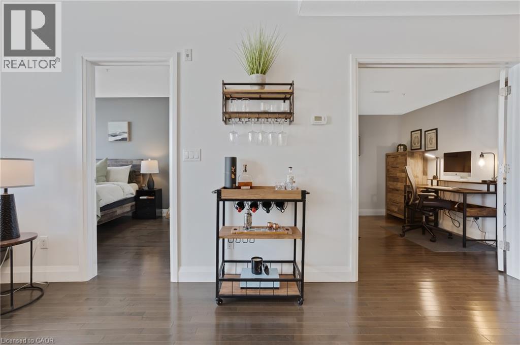 Remarks Public Remarks: Bright. Fresh. Modern. Those brand new condos too small and too tall? You are going to LOVE the MARKET LOFTS one of Kitchener's most sought-after buildings! This expansive and beautifully designed loft blends modern sophistication along with downtown convenience and is the perfect compromise for those wanting condo living but also wanting space. Located conveniently right next to the Kitchener market, restaurants, shops and the LRT! This spacious condo boasts just under 1,000 sq ft of living space (1 BEDROOM +1 DEN), and features a beautiful open concept layout. Your new home immediately welcomes you into the foyer and your open concept living room featuring soaring ceilings, and floor to ceiling window leading to your Juliette balcony. The modern, freshly painted, eat-in kitchen features white shaker style wood cabinetry, new dishwasher (2025) stainless steel appliances and breakfast bar with granite countertops making entertaining with friends a breeze. Completing this unit is a bright large primary bedroom with ample closet space with custom insert, a den perfect for the in-home office or overnight guests, a freshly painted 4 pc bath with new quartz countertop and in suite laundry. Condo fees include heat and water. The unit has one underground secure parking spot and there also may be the opportunity to rent a second spot through the condo board. The amenities include a party/meeting room, private and picturesque courtyard with community BBQ, underground parking and storage locker. Your ideal urban living experience is right here! Book your showing today! (id:64974)