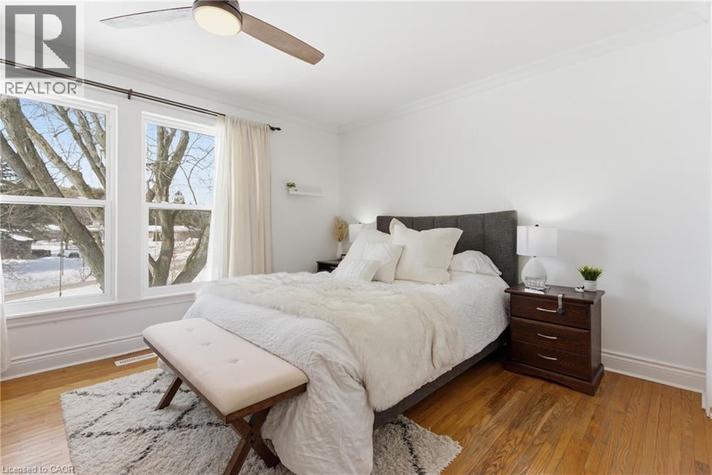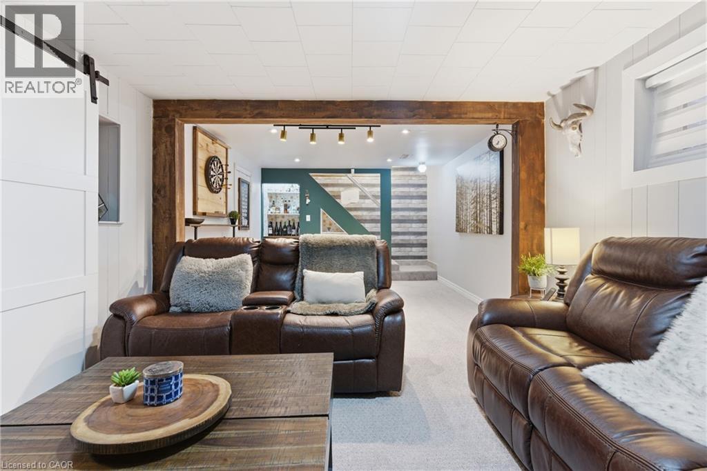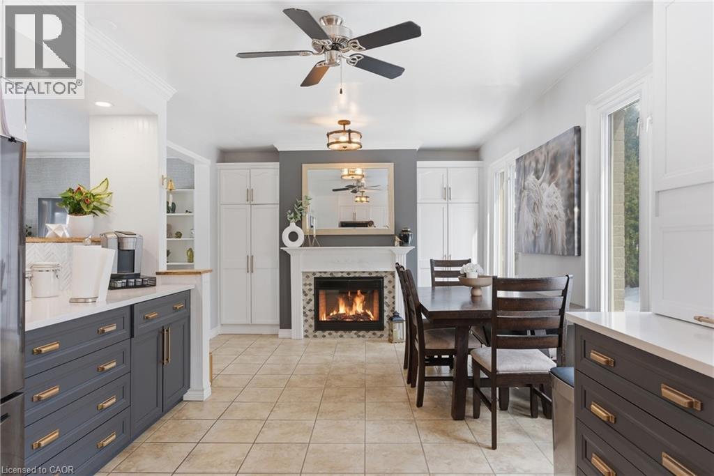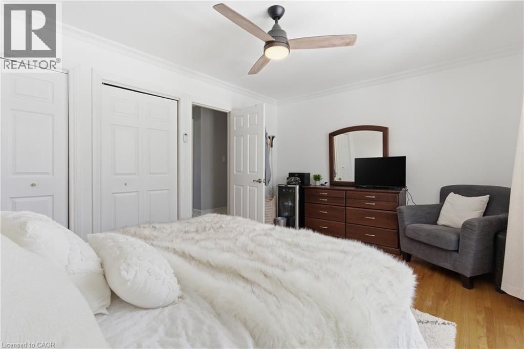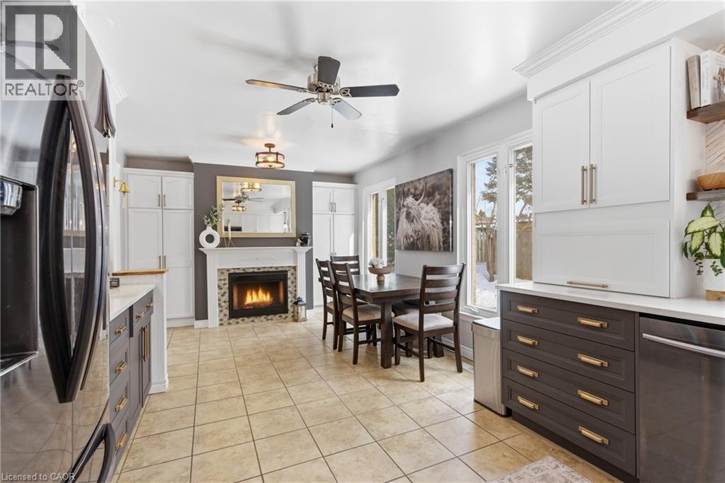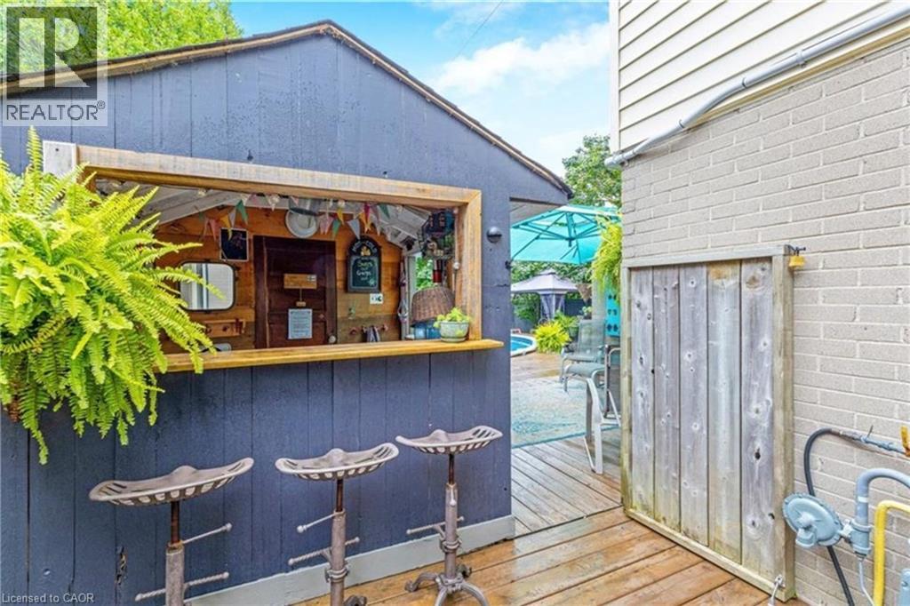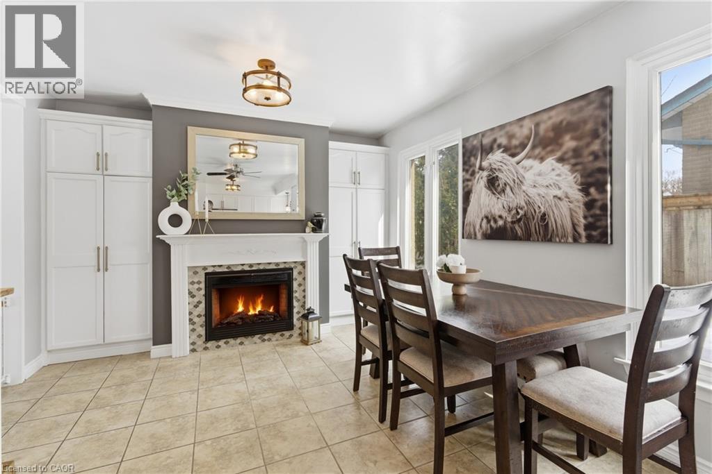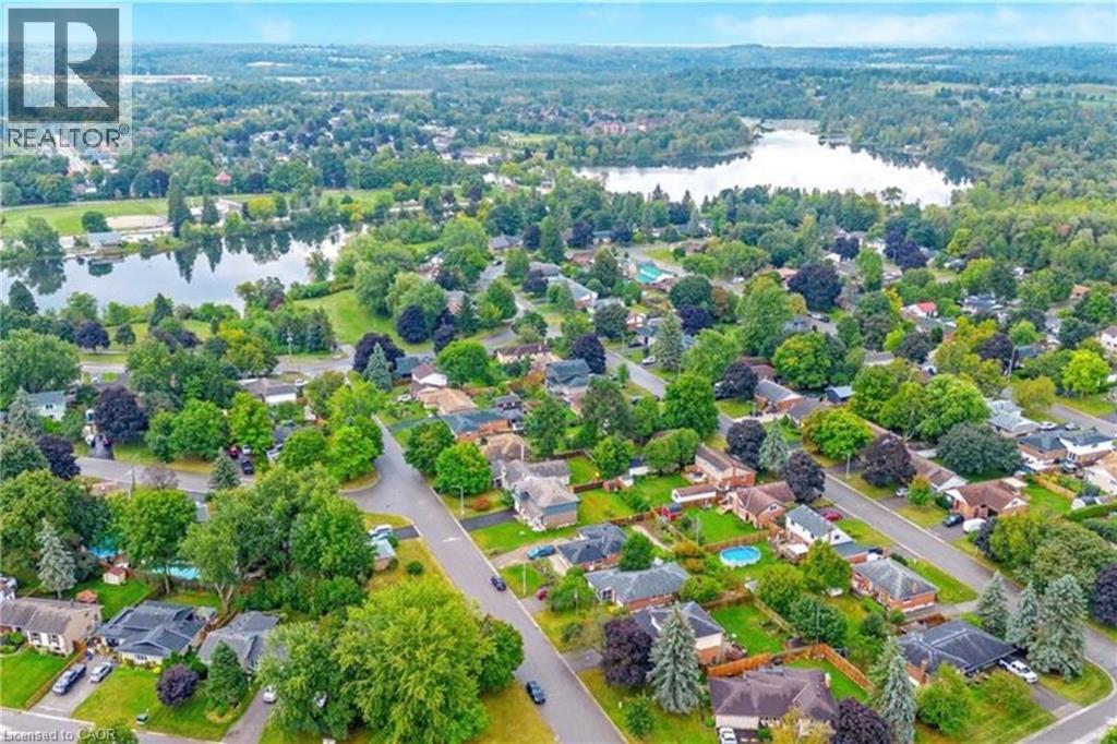 The perfect place to create lasting family memories. This spacious 4+1 bedroom, two-storey home sits on a large corner lot in the highly sought-after Lakeview neighbourhood, just a short stroll from Fairy Lake, local schools, parks, and scenic walking trails. The property offers fantastic curb appeal with a large front lawn, mature trees, and beautifully maintained gardens. A welcoming front porch provides the perfect place to relax while watching the kids play, while the extended driveway offers parking for up to six vehicles. Inside, the main floor is warm and inviting. A bright family room featuring a large bay window flows into the renovated eat-in kitchen, thoughtfully designed with soft-close cabinetry, quartz countertops, black stainless steel appliances, and built-in wall cabinetry with pantry storage. An electric fireplace adds a cozy touch and creates the perfect setting for everyday living and family dinners. The main floor also includes a powder room, convenient garage access, and a walkout to the fully fenced backyard. The backyard is designed for entertaining and relaxation, complete with an above-ground pool, pool cabana, sauna, and a stamped concrete patio that creates your own private outdoor retreat. Upstairs, you will find four spacious bedrooms, including a bright primary bedroom with large windows and double closets. A four-piece bathroom with double sinks makes busy mornings easier for the whole family. A convenient laundry chute connects directly to the basement laundry area for added functionality. The fully finished basement adds even more living space with a fifth bedroom featuring large barn doors, along with a recreation room complete with a dry bar, perfect for movie nights, games, or hosting guests. Located just a short drive from Highway 401, this home offers an ideal balance of peaceful neighbourhood living and easy commuting. (id:64974)