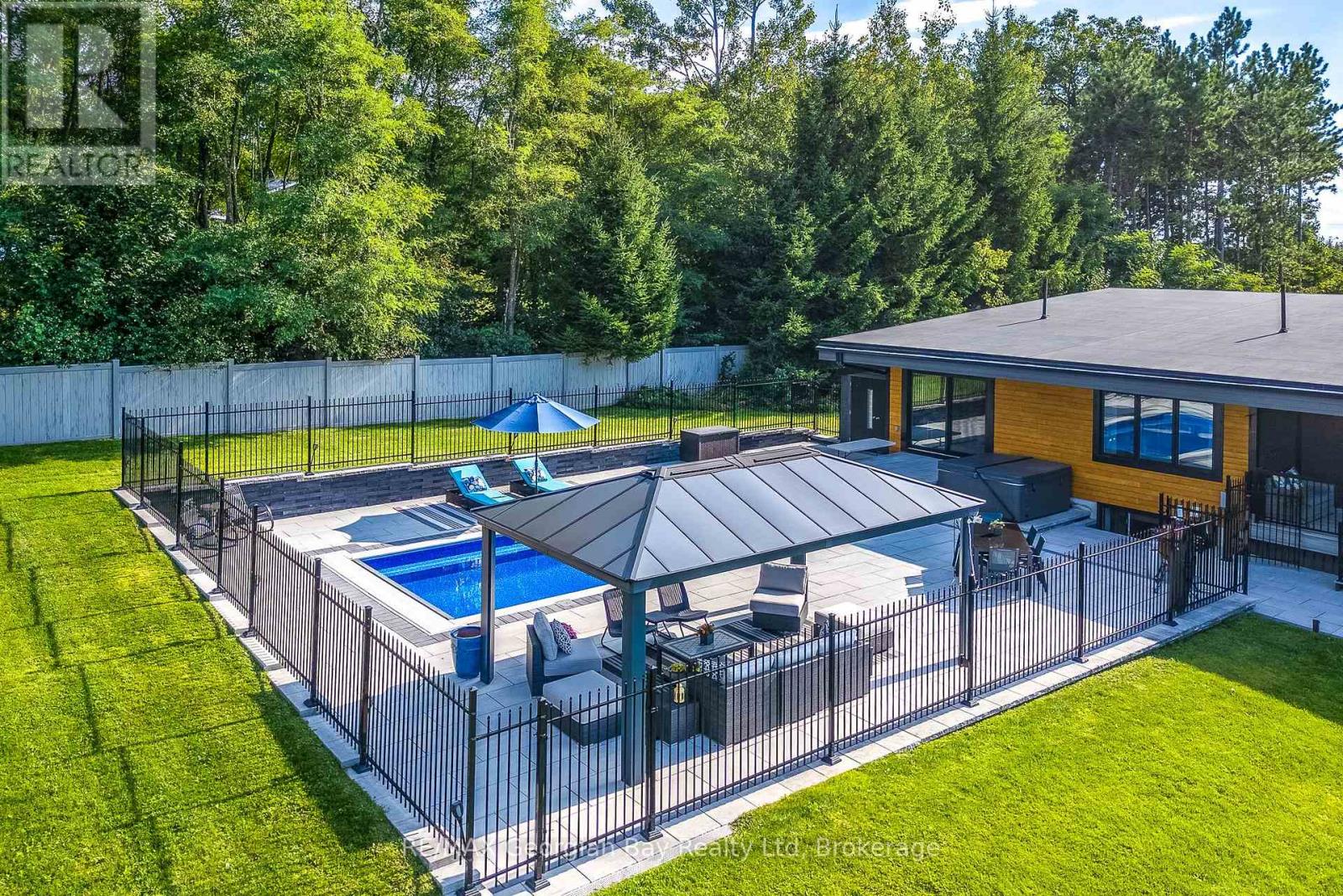 Every Once in awhile a Special Home comes along! This Modern Architectural Custom Built Bungalow Blends All The Current Luxuries You can Dream of In A Warm And Inviting Setting. This is a True Entertainer's Paradise Nestled On a Private 1.5 Acre Lot. The Great Room has Soaring Vaulted Ceilings And A Wall Of Windows Overlooking The Countryside. Open Concept Kitchen/Living/Dining Boasting Custom Framed Cabinetry With a 10' Island & Extra Sink. Top of the Line Appliances. Main Floor Primary Suite With A Huge Walk In Closet & Beautiful Ensuite. This Resort Style Oasis Boasts a 16 x 30 ft Heated Salt Water Pool, Outdoor Pergola, Hot Tub with Multiple Seating Areas To Enjoy The All Day Sun! Plenty Of Room For Extended Family Or Large Gatherings With Almost 5000 Square Feet with a Professionally Finished Basement. 3 Bedrooms On Main Level (Or Main Floor Office) Plus 2 Bedrooms & Huge Family Room in Basement with 2 more Bedrooms. Inside Entry from Garage to Main & Lower Floors. 38 x 37 Ft Garage/Shop That Accommodates 3+ Cars, Driveway Parking For Approx. 15+ Vehicles or Turn it into your own Pickleball Court. Far Too Many Features To List - Be Sure To Watch Virtual Tour. (id:64974)