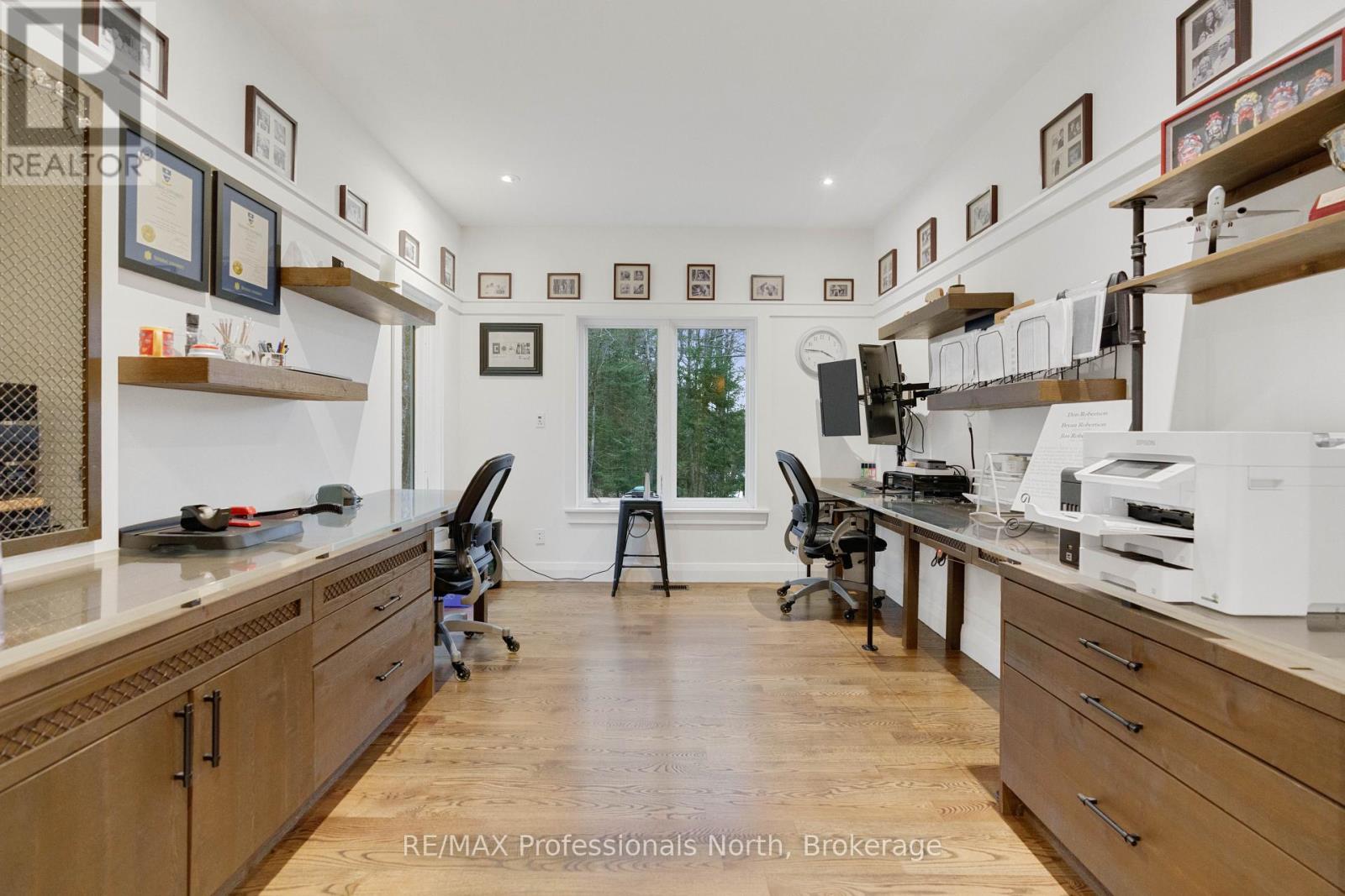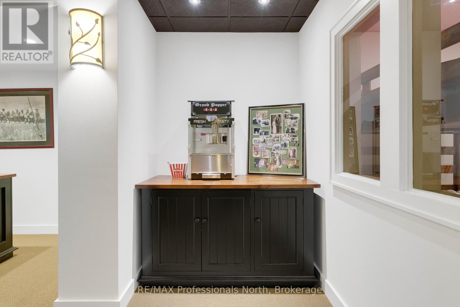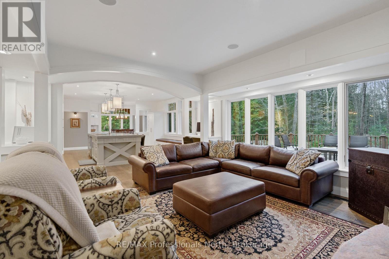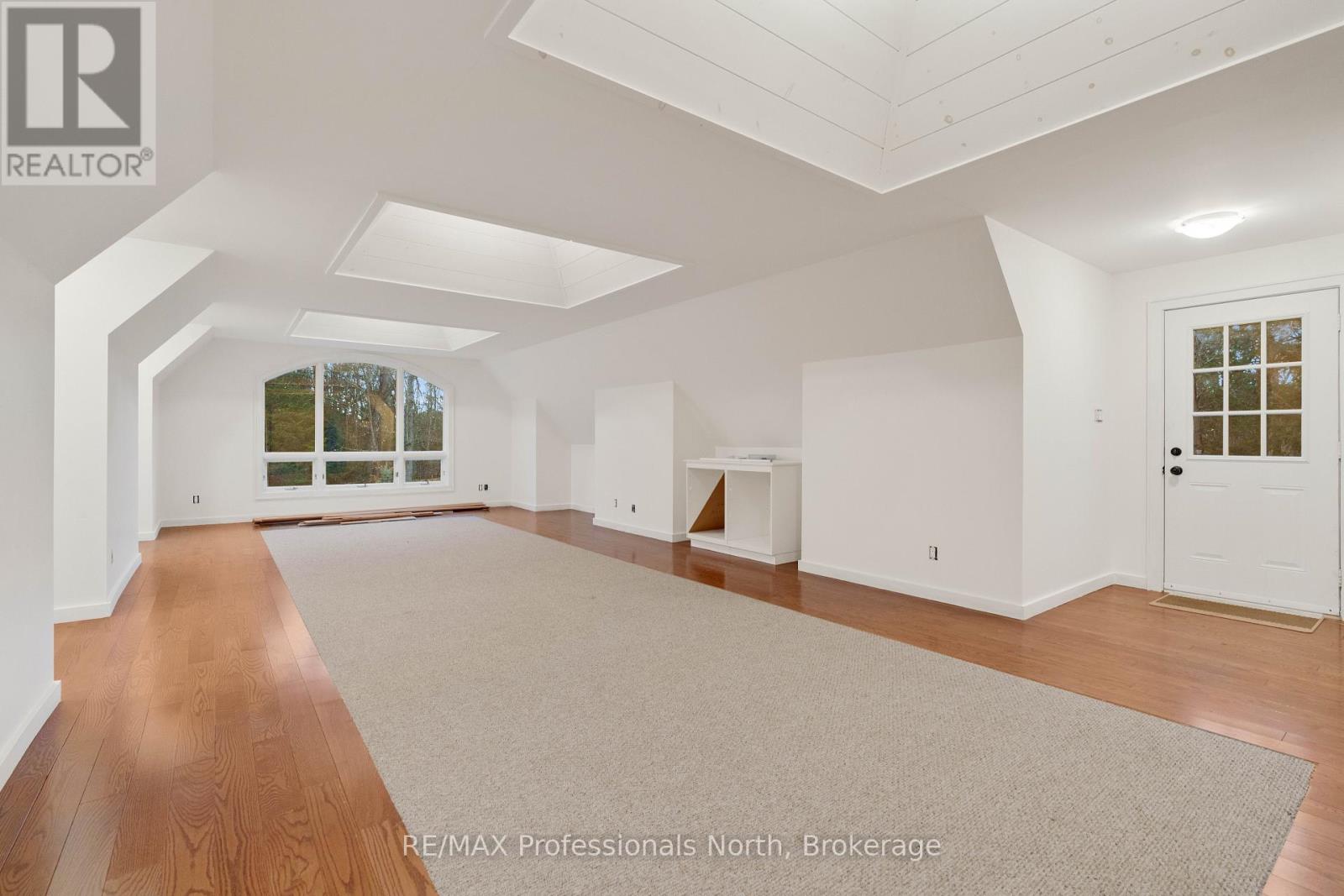 Welcome to an extraordinary private estate in the heart of Muskoka, where refined design meets the natural beauty of the surrounding landscape. Offering over 7000 square feet of thoughtfully crafted living space, this impressive property includes a 1000 square foot heated garage with floor drains and a finished loft above, along with three fully finished levels designed for elevated everyday living. At the centre of the home is a custom kitchen with premium appliances and exceptional attention to detail, seamlessly opening into the main living area where a stunning custom stone wood burning fireplace creates a striking focal point. Just beyond, the Muskoka room offers a peaceful escape surrounded by windows that draw the outdoors in, complete with a wood burning fireplace for year round comfort. A dedicated main floor office provides the perfect balance of productivity and connection. The second level hosts three spacious bedrooms, each with vaulted ceilings, walk in closets, and private ensuites with heated floors, while a fourth bedroom with its own bathroom is located on the lower level. The fully soundproofed lower level is designed for entertainment, featuring an eight seat tiered theatre, wet bar, and versatile bonus space ideal for a studio, gym, or playroom. Set on 16.74 acres of private land, the property features approximately half a kilometre of professionally built trails, three serene ponds for paddling or skating, and an invisible dog fence covering five acres. An automatic Kohler generator powers the entire home for added peace of mind. Located along Muskoka Beach Road, one of the region's most iconic drives known for its stunning fall colours, this property offers a rare blend of privacy and convenience just minutes to Bracebridge and Gravenhurst and close to several renowned golf courses. Floor plans and feature sheet available. (id:64974)
