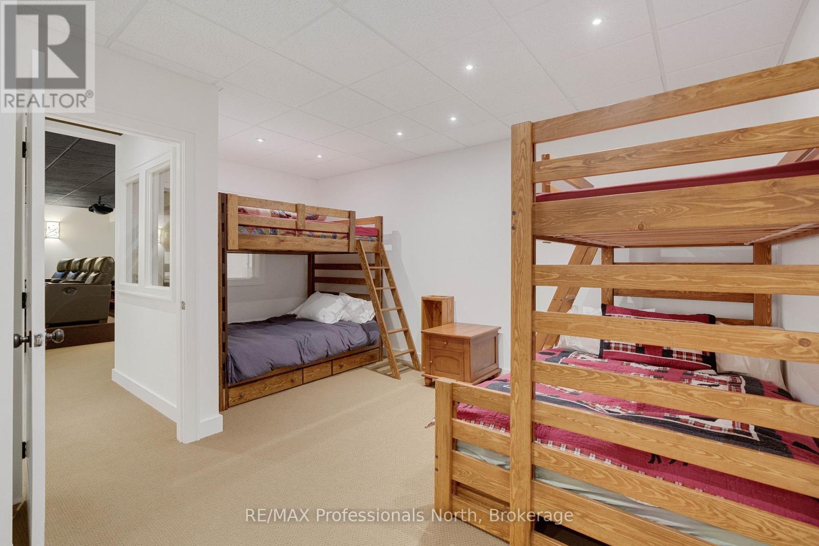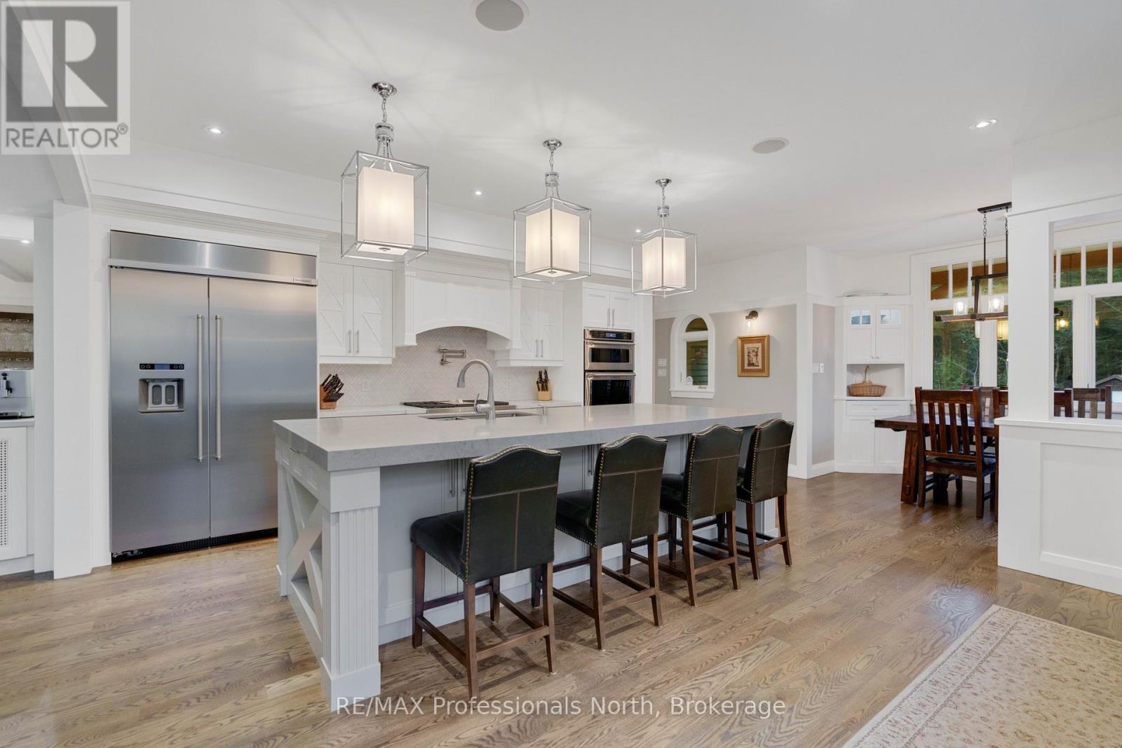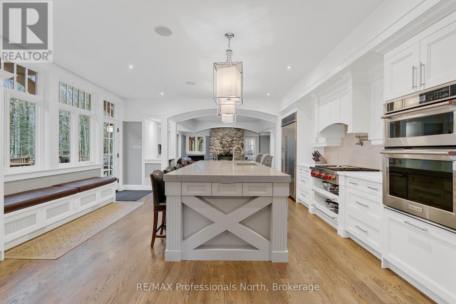 Welcome to an extraordinary private estate in the heart of Muskoka, where refined design meets the natural beauty of the surrounding landscape. Offering over 7000 square feet of thoughtfully crafted living space, this impressive property includes a 1000 square foot heated garage with floor drains and a finished loft above, along with three fully finished levels designed for elevated everyday living. At the centre of the home is a custom kitchen with premium appliances and exceptional attention to detail, seamlessly opening into the main living area where a stunning custom stone wood burning fireplace creates a striking focal point. Just beyond, the Muskoka room offers a peaceful escape surrounded by windows that draw the outdoors in, complete with a wood burning fireplace for year round comfort. A dedicated main floor office provides the perfect balance of productivity and connection. The second level hosts three spacious bedrooms, each with vaulted ceilings, walk in closets, and private ensuites with heated floors, while a fourth bedroom with its own bathroom is located on the lower level. The fully soundproofed lower level is designed for entertainment, featuring an eight seat tiered theatre, wet bar, and versatile bonus space ideal for a studio, gym, or playroom. Set on 16.74 acres of private land, the property features approximately half a kilometre of professionally built trails, three serene ponds for paddling or skating, and an invisible dog fence covering five acres. An automatic Kohler generator powers the entire home for added peace of mind. Located along Muskoka Beach Road, one of the region's most iconic drives known for its stunning fall colours, this property offers a rare blend of privacy and convenience just minutes to Bracebridge and Gravenhurst and close to several renowned golf courses. Floor plans and feature sheet available. (id:64974)