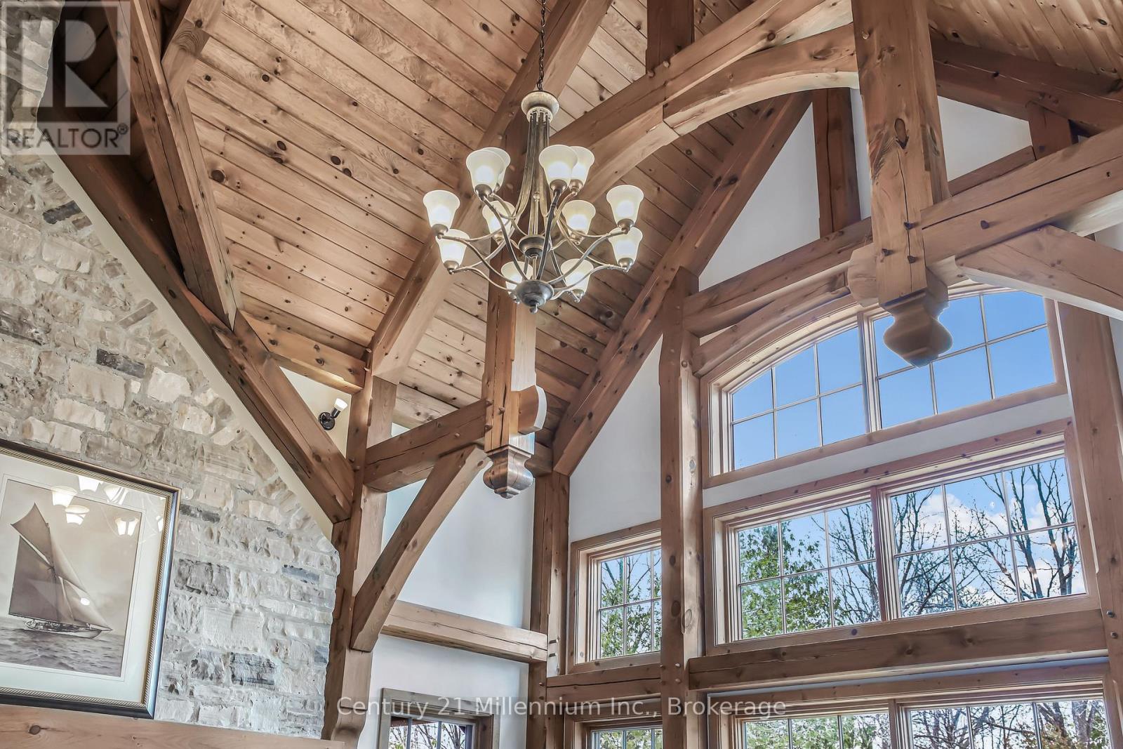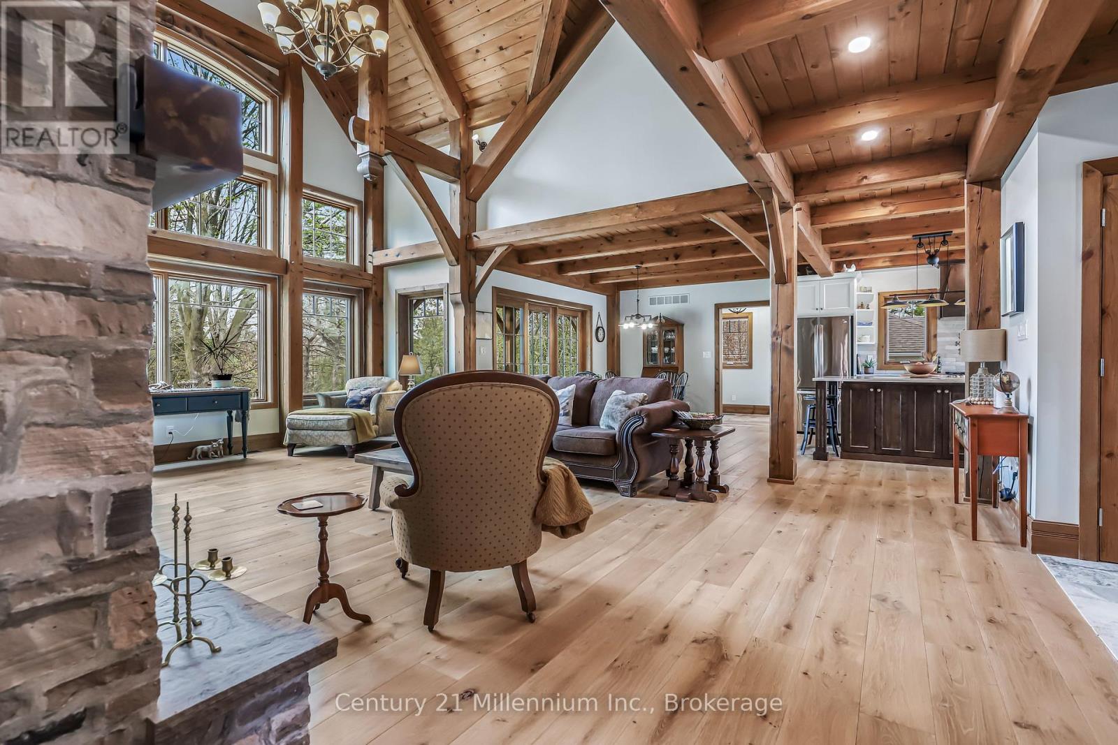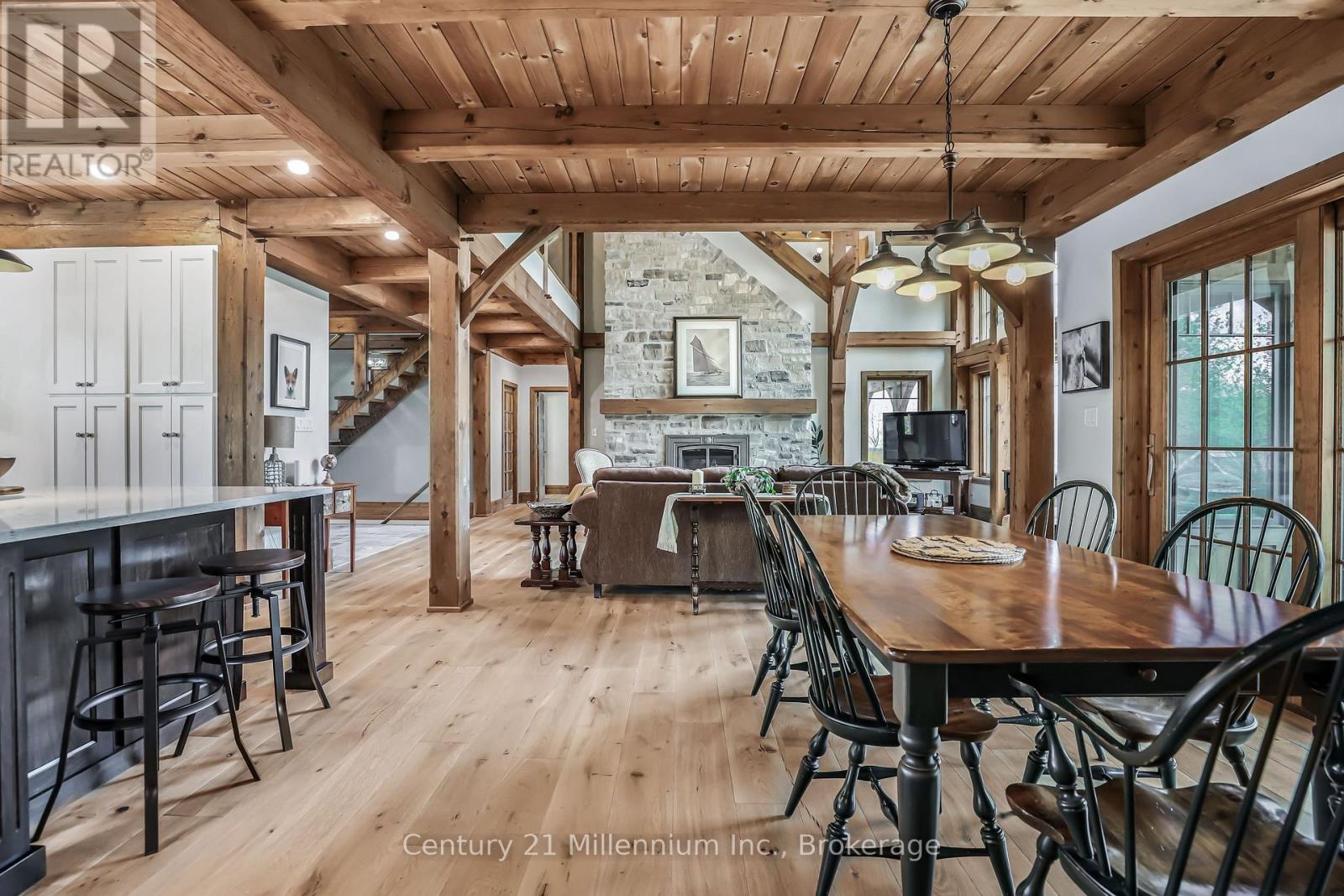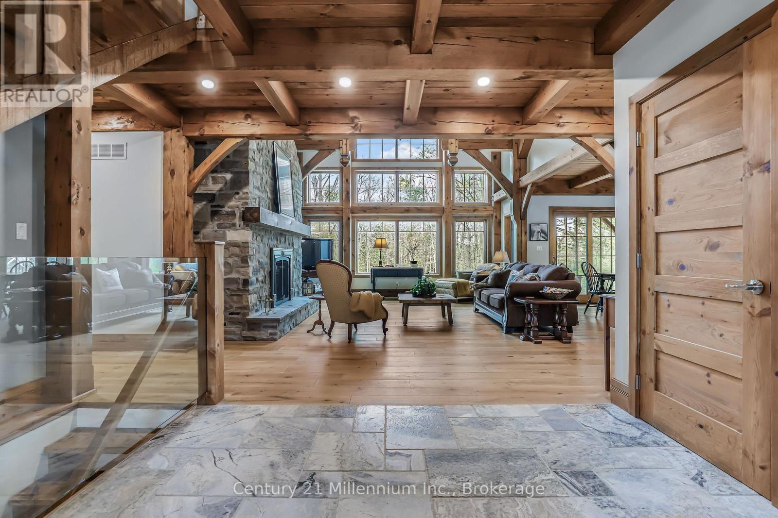 A Rare Riverfront Retreat in Southampton. Welcome to a one-of-a-kind timber frame masterpiece nestled on the banks of the Saugeen River, just steps from the shores of Lake Huron. This extraordinary home blends artisan craftsmanship with refined luxury in one of Ontario's most coveted locations. From the moment you step into the grand foyer, you're greeted by a stunning interplay of natural elements rich timber beams, elegant tile, and soaring glass. The dramatic living room is the heart of the home, where cathedral ceilings and exposed hammerbeam trusses frame a floor-to-ceiling stone fireplace. Sunlight floods the space through expansive windows, creating a warm and inviting ambiance. The chefs kitchen is an entertainers dream, with a generous central island that seats five, gleaming quartz countertops, and exquisite cabinetry with custom pot drawers and glazed uppers. Host elegant dinners in the dining room, or step onto the raised balcony to dine alfresco with views of your private, treed backyard. The main floor primary suite is a tranquil escape featuring its own secluded balcony, a lavish 5-piece spa-inspired ensuite with freestanding soaker tub, glass walk-in shower, double vanity, and a generous walk-in closet. Upstairs, a glass-railed loft overlooks the living room, flanked by two private bedrooms and a luxurious central bath. The fully finished lower level offers even more indulgence: a radiant-heated family room with stone hearth wood stove, wet bar, walk-out patio access, a spacious bedroom, full bath, exercise room, and a wine-lovers dream cold room. Just steps from Pioneer Park, the riverfront harbour, and Southampton's charming downtown, this home offers an unparalleled lifestyle of beauty, privacy, and prestige. (id:64974)