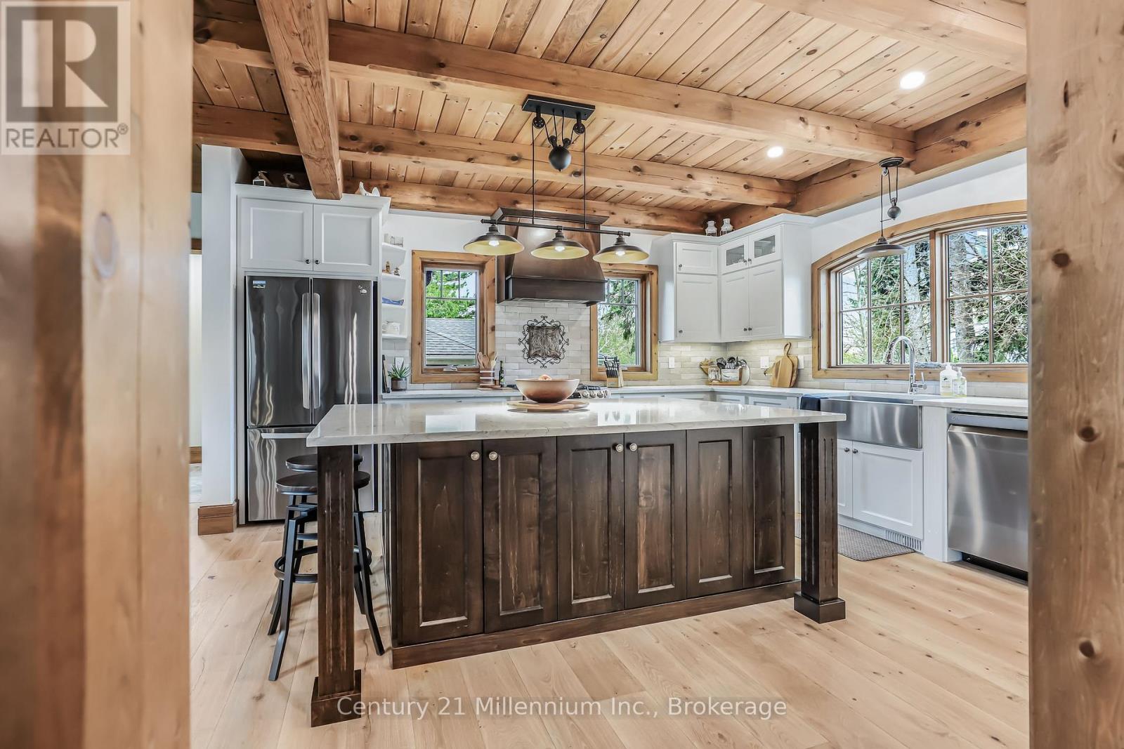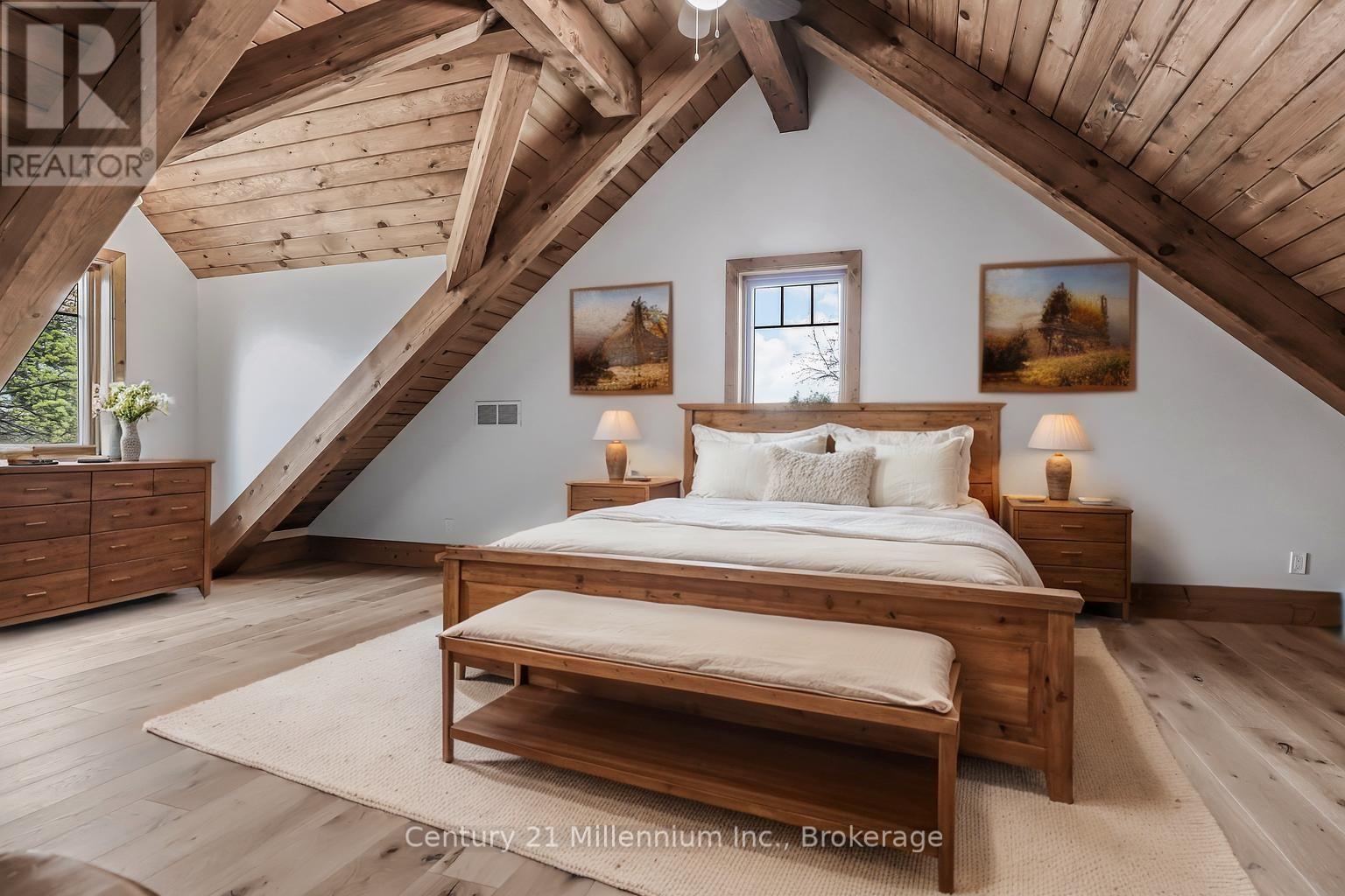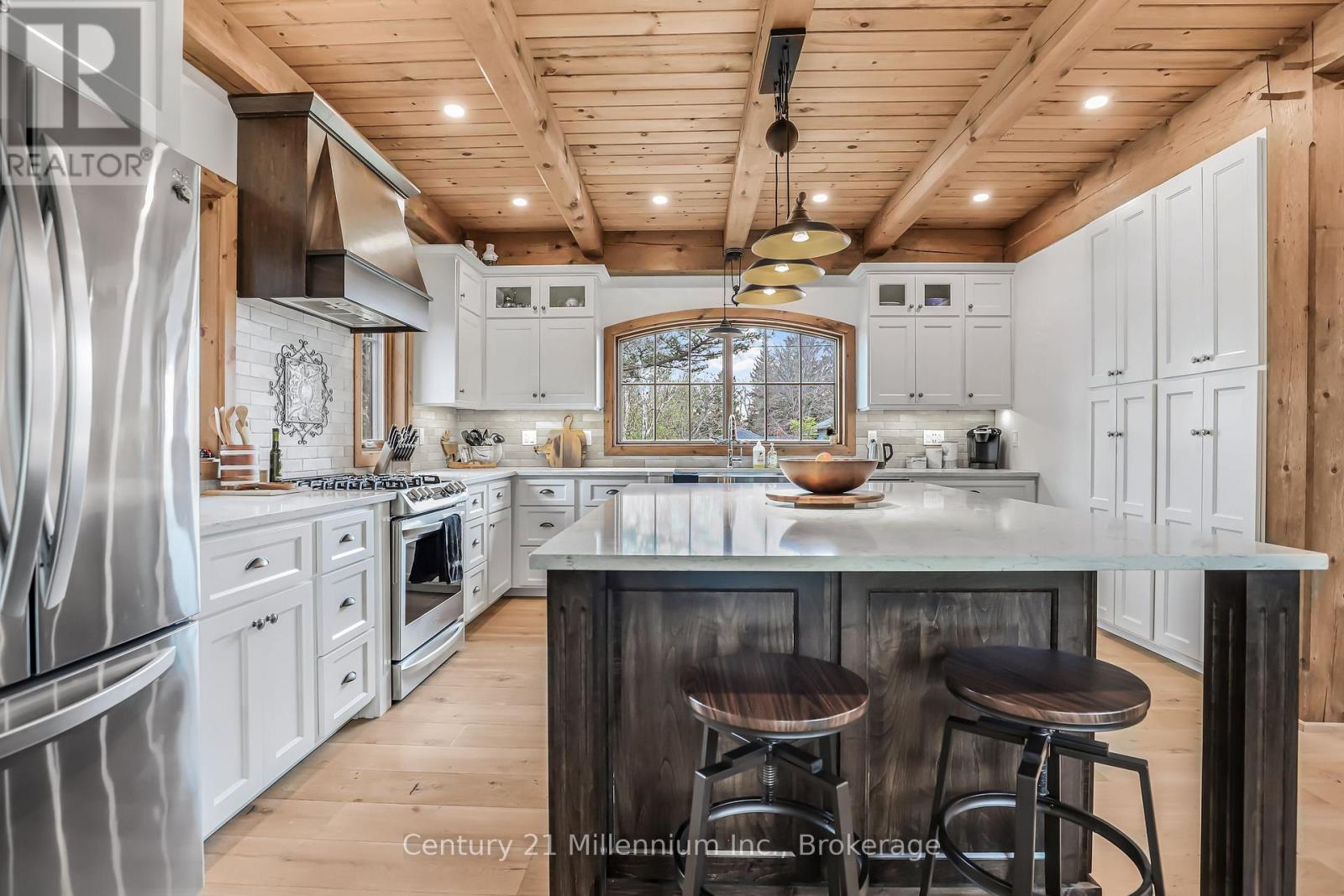 A Rare Riverfront Retreat in Southampton. Welcome to a one-of-a-kind timber frame masterpiece nestled on the banks of the Saugeen River, just steps from the shores of Lake Huron. This extraordinary home blends artisan craftsmanship with refined luxury in one of Ontario's most coveted locations. From the moment you step into the grand foyer, you're greeted by a stunning interplay of natural elements rich timber beams, elegant tile, and soaring glass. The dramatic living room is the heart of the home, where cathedral ceilings and exposed hammerbeam trusses frame a floor-to-ceiling stone fireplace. Sunlight floods the space through expansive windows, creating a warm and inviting ambiance. The chefs kitchen is an entertainers dream, with a generous central island that seats five, gleaming quartz countertops, and exquisite cabinetry with custom pot drawers and glazed uppers. Host elegant dinners in the dining room, or step onto the raised balcony to dine alfresco with views of your private, treed backyard. The main floor primary suite is a tranquil escape featuring its own secluded balcony, a lavish 5-piece spa-inspired ensuite with freestanding soaker tub, glass walk-in shower, double vanity, and a generous walk-in closet. Upstairs, a glass-railed loft overlooks the living room, flanked by two private bedrooms and a luxurious central bath. The fully finished lower level offers even more indulgence: a radiant-heated family room with stone hearth wood stove, wet bar, walk-out patio access, a spacious bedroom, full bath, exercise room, and a wine-lovers dream cold room. Just steps from Pioneer Park, the riverfront harbour, and Southampton's charming downtown, this home offers an unparalleled lifestyle of beauty, privacy, and prestige. (id:64974)