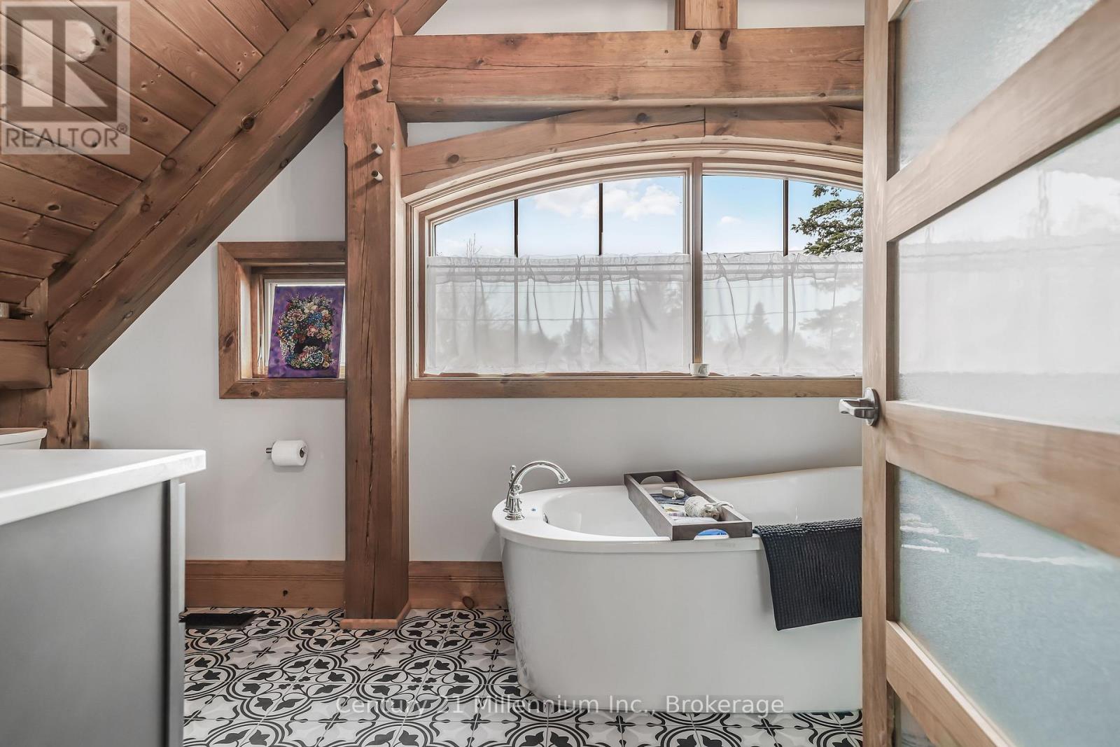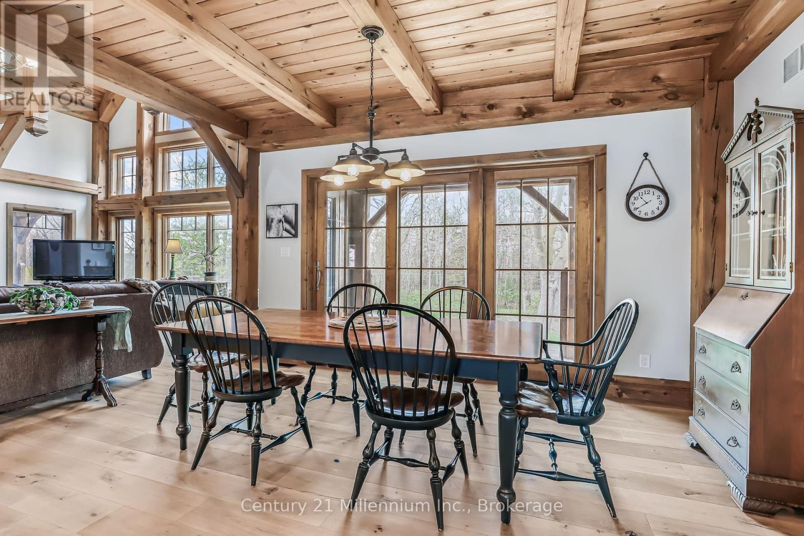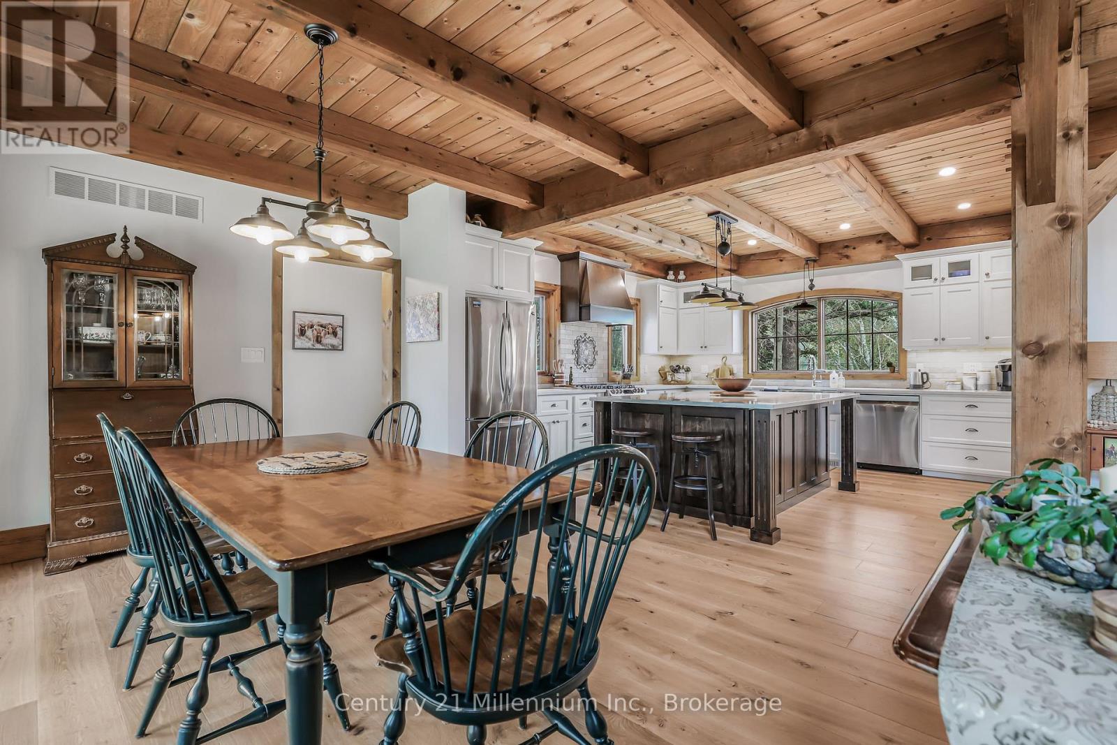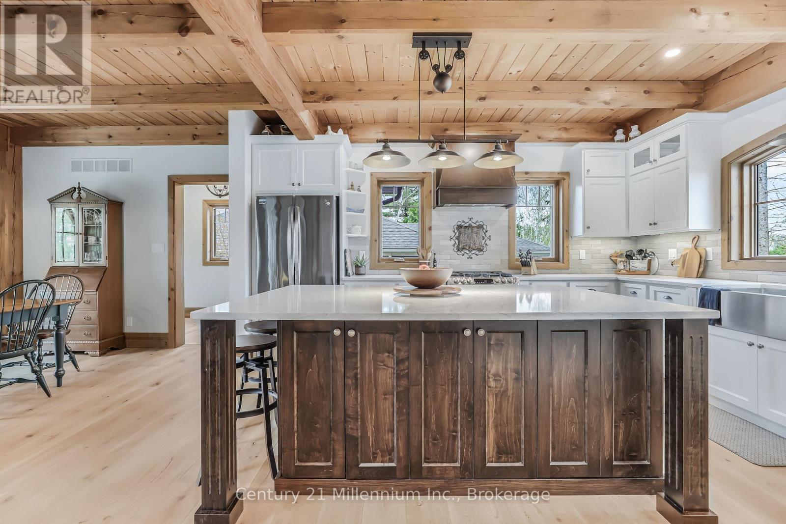 A Rare Riverfront Retreat in Southampton. Welcome to a one-of-a-kind timber frame masterpiece nestled on the banks of the Saugeen River, just steps from the shores of Lake Huron. This extraordinary home blends artisan craftsmanship with refined luxury in one of Ontario's most coveted locations. From the moment you step into the grand foyer, you're greeted by a stunning interplay of natural elements rich timber beams, elegant tile, and soaring glass. The dramatic living room is the heart of the home, where cathedral ceilings and exposed hammerbeam trusses frame a floor-to-ceiling stone fireplace. Sunlight floods the space through expansive windows, creating a warm and inviting ambiance. The chefs kitchen is an entertainers dream, with a generous central island that seats five, gleaming quartz countertops, and exquisite cabinetry with custom pot drawers and glazed uppers. Host elegant dinners in the dining room, or step onto the raised balcony to dine alfresco with views of your private, treed backyard. The main floor primary suite is a tranquil escape featuring its own secluded balcony, a lavish 5-piece spa-inspired ensuite with freestanding soaker tub, glass walk-in shower, double vanity, and a generous walk-in closet. Upstairs, a glass-railed loft overlooks the living room, flanked by two private bedrooms and a luxurious central bath. The fully finished lower level offers even more indulgence: a radiant-heated family room with stone hearth wood stove, wet bar, walk-out patio access, a spacious bedroom, full bath, exercise room, and a wine-lovers dream cold room. Just steps from Pioneer Park, the riverfront harbour, and Southampton's charming downtown, this home offers an unparalleled lifestyle of beauty, privacy, and prestige. (id:64974)
