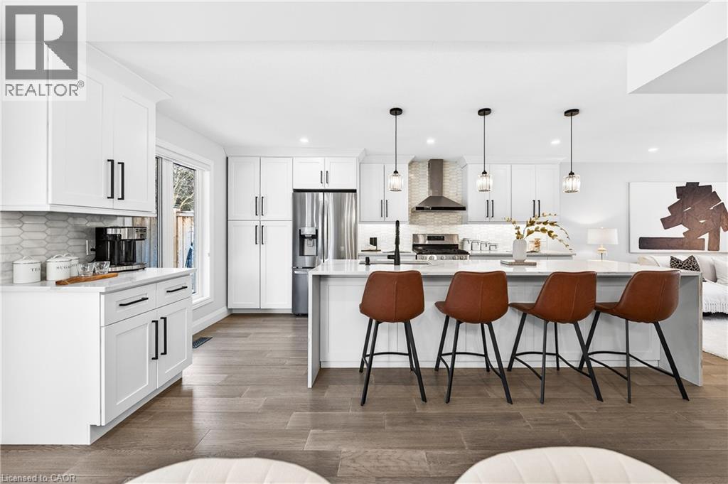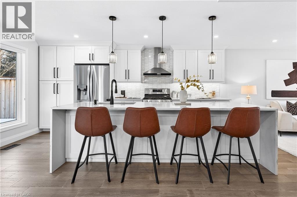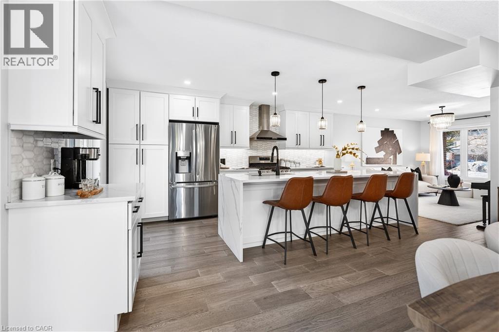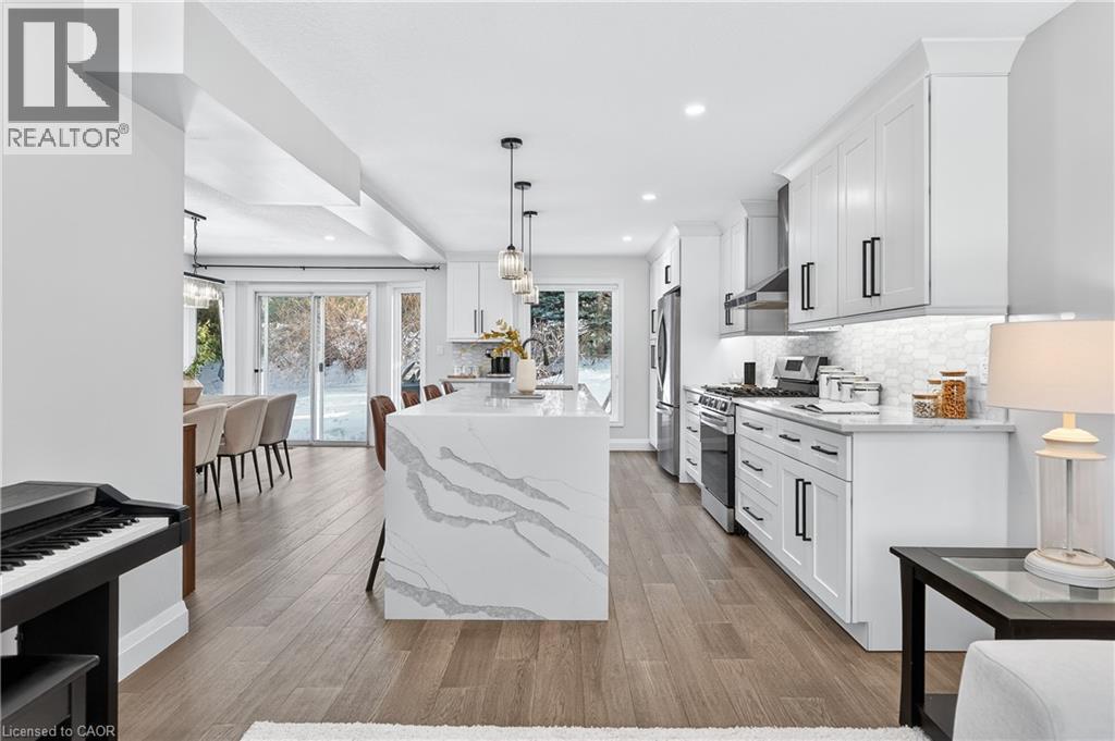 This is the Westvale home you’ve been waiting for. Stunning & fully transformed through $300,000+ in professional renovations (2022-engineered & permitted) & thoughtfully enhanced since, 166 Westvale Drive offers 3,300+ SF of refined, move-in ready living space in one of Waterloo’s most established & family-oriented neighbourhoods. Designed for modern family living, the bright open-concept main level balances sophistication & everyday function. A grand 2-storey foyer creates a strong first impression, while a formal living rm overlooking the mature streetscape adds elegant front-of-home presence. The heart of the home is a stunning chef’s kitchen featuring a dramatic 10' quartz waterfall island, dedicated coffee bar, marble backsplash, under-cabinet lighting & premium appliances, seamlessly connected to the integrated dining area & great rm with gas fireplace & dual backyard access. A spacious mudrm/laundry with garage/side-yard access & a 2-pc bath complete the main level. Upstairs offers 4 generous bedrms, including a spacious primary retreat with walk-in closet & spa-like 4-pc ensuite with dual sinks & tiled glass shower. A 4-pc updated main bath serves the additional bedrms, while a bonus upper-level family rm with vaulted ceilings adds flexibility for a 5th bedrm, office, gym, or playroom/teen lounge. The finished basement extends the home’s versatility with a lrg rec rm, kitchenette, office/den & full bath-ideal for multi-gen living/long-term flexibility. Beyond the cosmetic transformation, major systems were updated, including electrical (ESA certified), plumbing, ductwork, A/C, windows & doors. Set on a mature, tree-lined street with timeless curb appeal, covered front porch & private backyard with deck, this home blends executive presence & established neighbourhood charm. Prime location: walk to parks & schools, mins to shopping at The Beechwood Centre, The Boardwalk Shops & amenities, Costco, universities, Uptown Waterloo, & Westmount Golf & Country Club. (id:64974)
