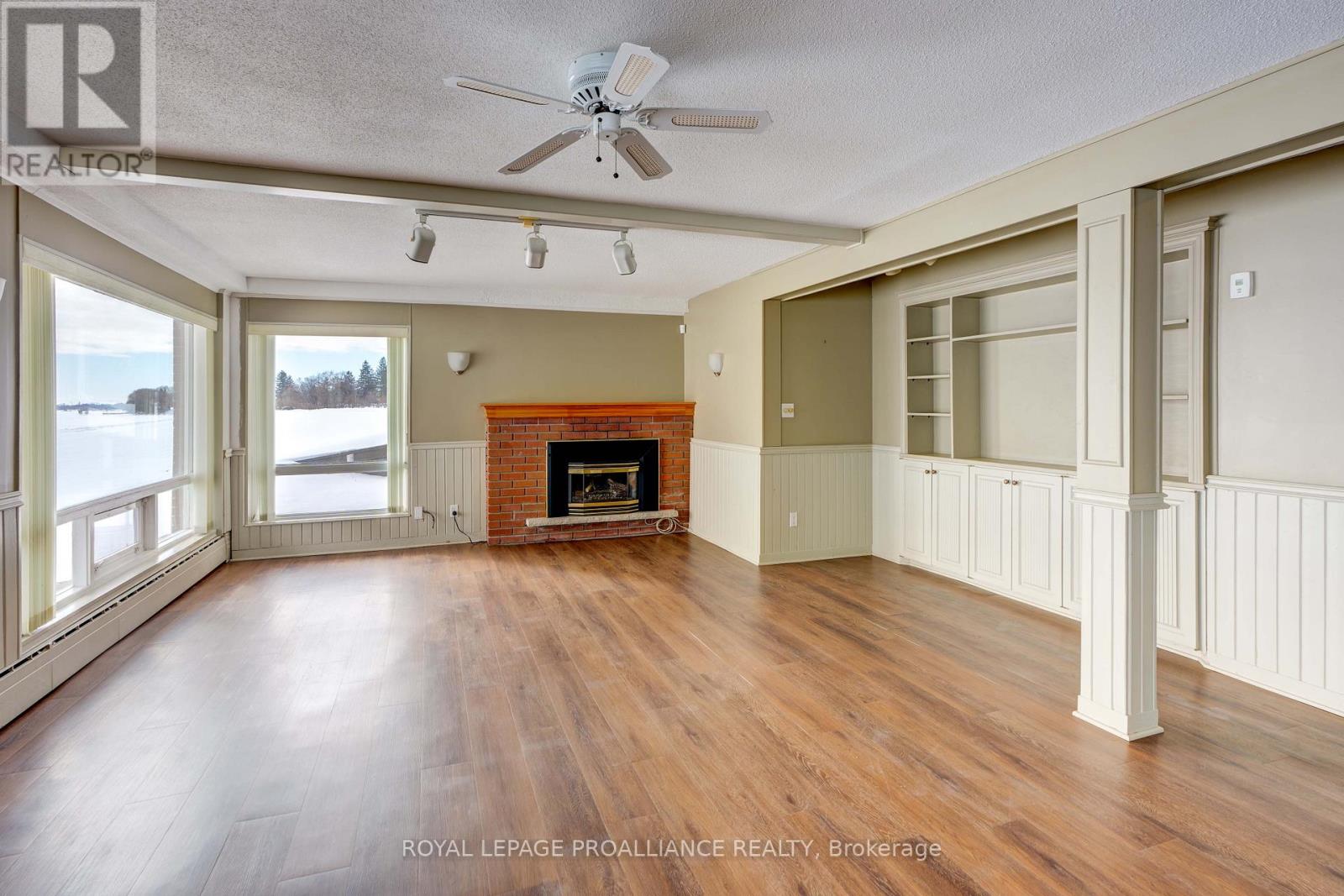 If you've been dreaming of owning a waterfront property that is still considered "in town," your wish has been granted.Located on the west end of Prescott and positioned along the banks of the majestic St. Lawrence River, this 3-bedroom (2+1) brick bungalow with attached garage was designed and built circa 1961 by Prescott's D.C. Snelling. One of the most distinctive features is the impressive 1.17-acre lot (90 ft. frontage x 566 ft. depth as per MPAC), which includes underwater ownership extending into the St. Lawrence River. This rare feature provides added flexibility for dock installation (permits required) and perhaps the potential for a future boathouse (see Realtor remarks), enhancing both lifestyle and long-term value.The home offers approximately 1,632 sq. ft. on the main level and an additional 1,100 sq. ft. of finished living space on the ground level, plus dedicated utility and storage areas.The main floor showcases a spacious open-concept living and dining area anchored by a cozy gas fireplace and breathtaking, unobstructed river views - a spectacular backdrop in every season. The large kitchen offers ample cabinetry and counter space and leads to a composite deck spanning the entire length of the home, ideal for entertaining or relaxing while overlooking the water.Also on the main level: a generous primary bedroom, second bedroom, newer 4-piece bath, and convenient laundry. Hardwood flooring runs throughout most of this level, complemented by new luxury vinyl plank flooring in the bedrooms and hallway for added durability and modern appeal.The ground-level lower floor features a third bedroom, office/den, newer bathroom, and a massive family room with a second gas fireplace and new vinyl flooring. A workshop, utility room, abundant storage, and a second exterior-access garage complete this level.A rare opportunity to enjoy expansive riverfront living - without leaving town. Check out the video ..... https://www.youtube.com/watch?v=HGhe1dCrsDQ (id:64974)