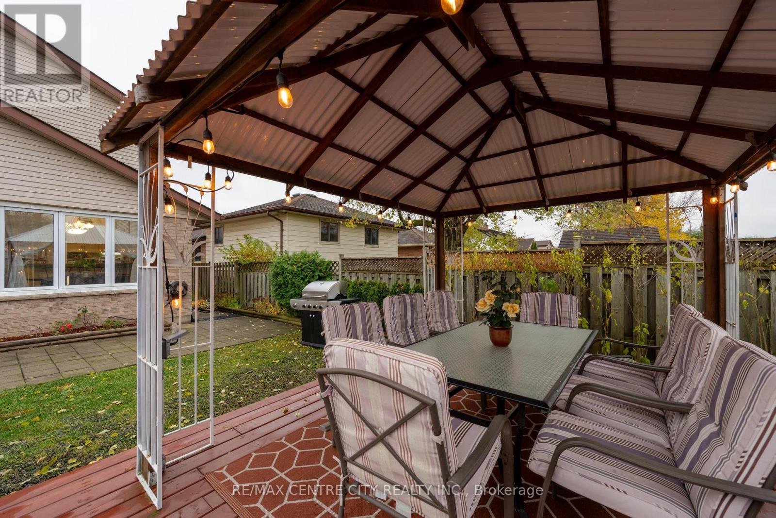 Welcome to 168 Clara Crescent-bright, easy-living, and move-in ready. ~1,781 sq.ft. finished (per plan) with the layout everyone wants: a sun-splashed living room with a wall-wide patio slider to a party-size deck + gazebo inside a fully fenced yard. The kitchen works hard-ample cabinetry, tile backsplash, stone-look counters and a breakfast bar that keeps everyone connected to the dining area. Main-floor laundry and a proper powder room keep the day-to-day simple. Upstairs, a relaxing primary with WIC, two additional bedrooms and a spotless 4-pc bath. Downstairs delivers a massive 22'6" x 23'9" rec room-home theatre, gym, play space or all three-plus a 3-pc bath and great storage. Covered front porch, inside-entry garage, and a double drive for four. Quiet crescent close to parks, shopping and transit. A smart, low-maintenance home with room to grow-see it today. (id:64974)