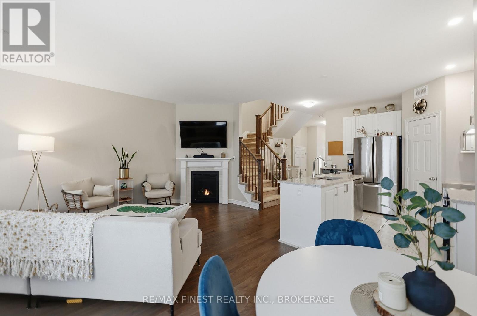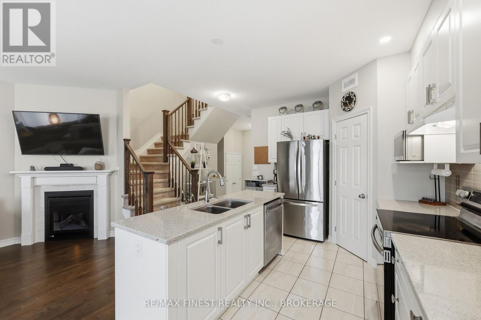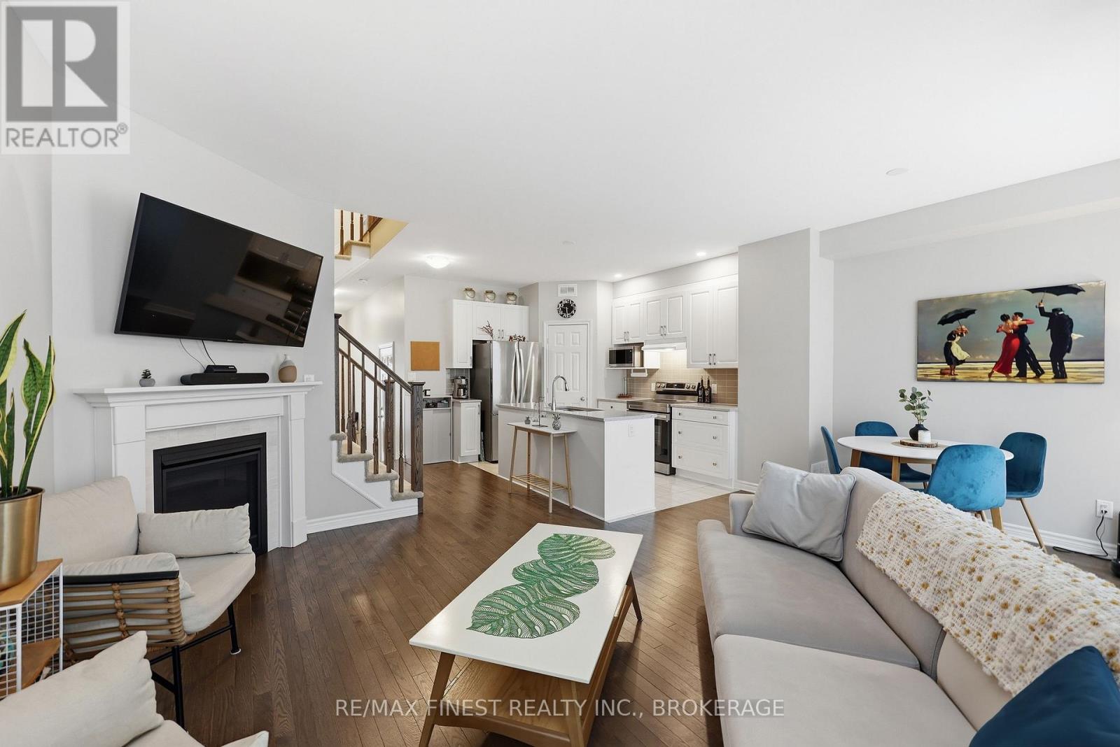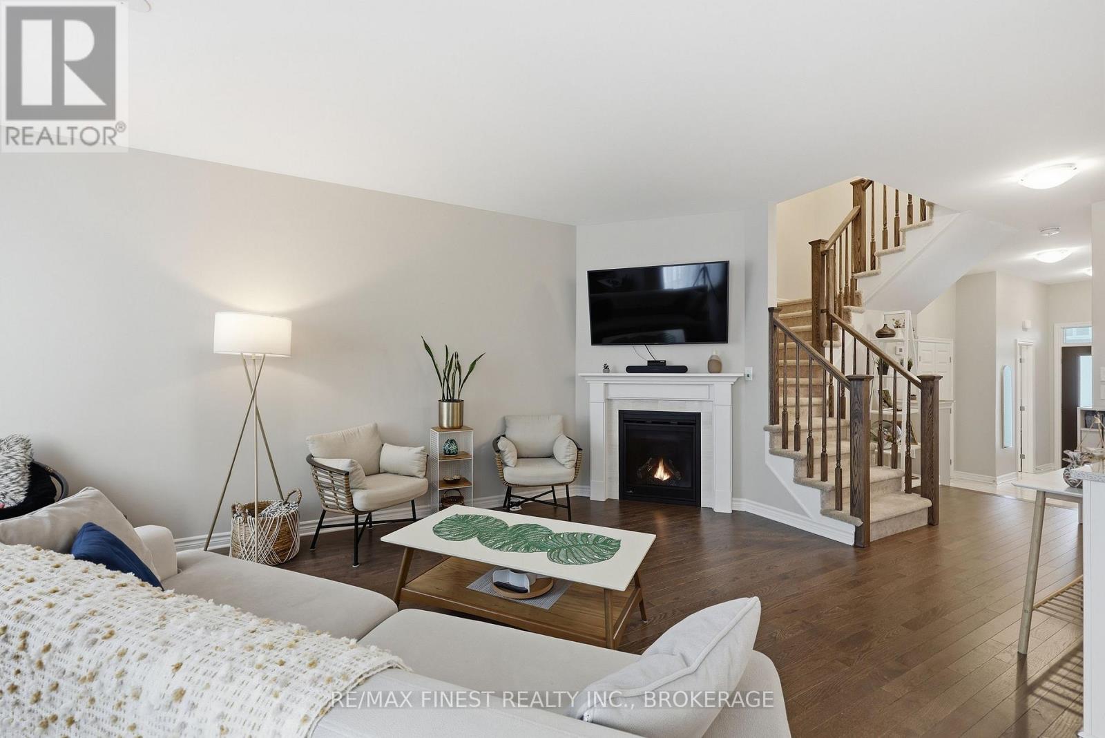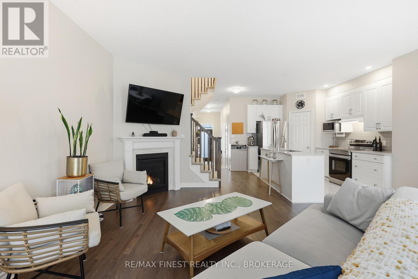 Welcome to this beautifully appointed 3-bedroom, 3-bathroom townhouse located in Kingston's west end. Designed with modern living in mind, this home offers high ceilings and an open-concept layout that's both spacious and inviting. The kitchen features quartz countertops, stainless steel appliances, and a stylish tile backsplash - perfect for everyday cooking or entertaining guests. Hardwood flooring spans the main level, while ceramic tile in all wet areas adds durability and easy maintenance. Relax by the cozy fireplace in the living room, framed by large transom windows and a patio door that flood the space with natural light. Upstairs, you'll find three comfortable bedrooms, including the primary bedroom with 4-piece ensuite, plus you'll enjoy the convenience of upper-level laundry. The finished rec room in the lower level provides added living space ideal for a family room, home gym, or office. Located close to schools, walking paths, west-end shops, and everyday amenities, this home combines comfort, style, and an excellent location. (id:64974)