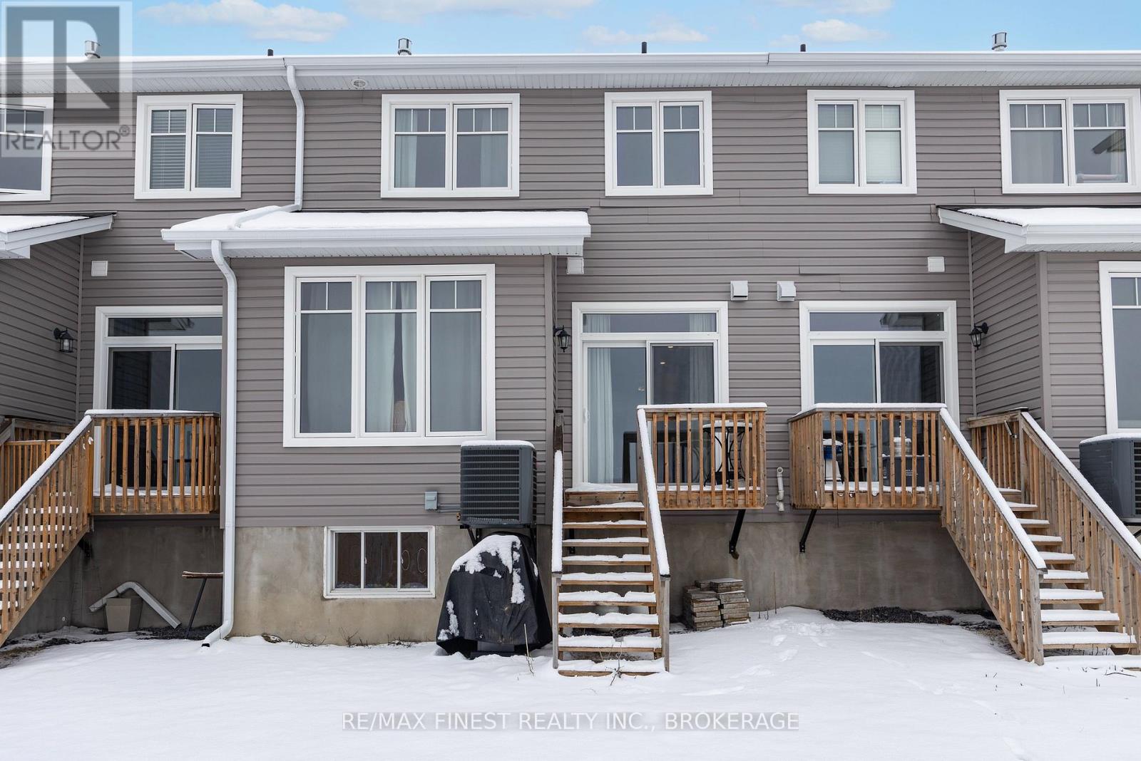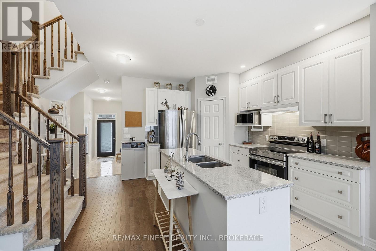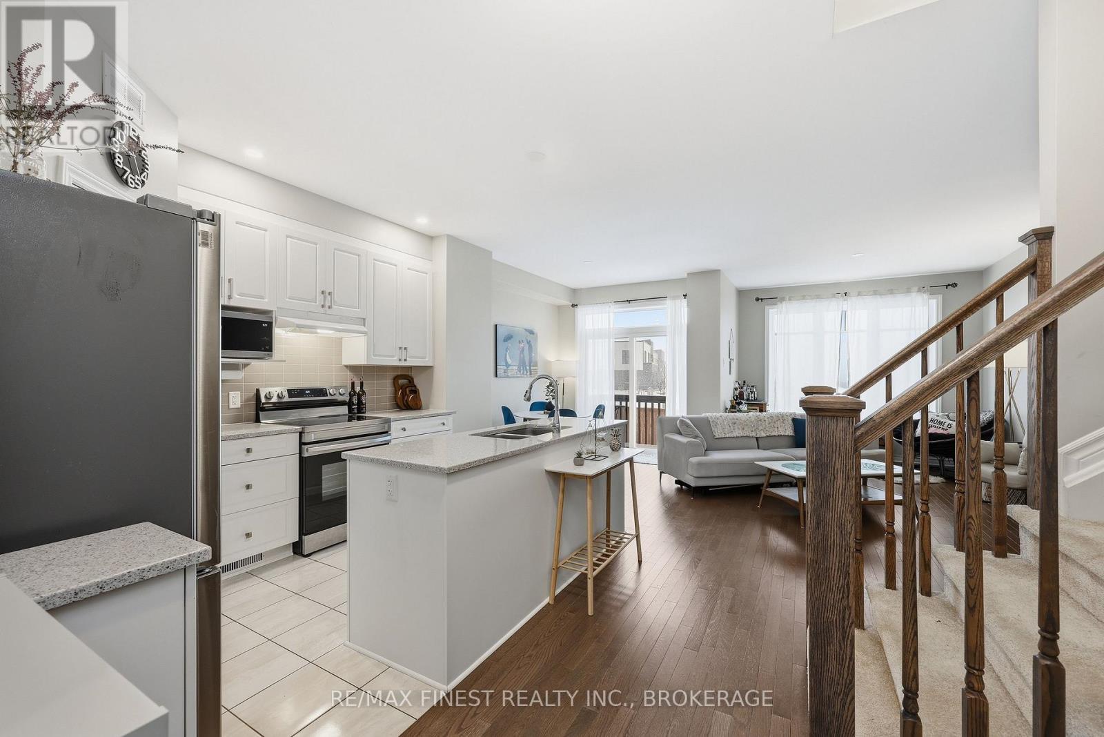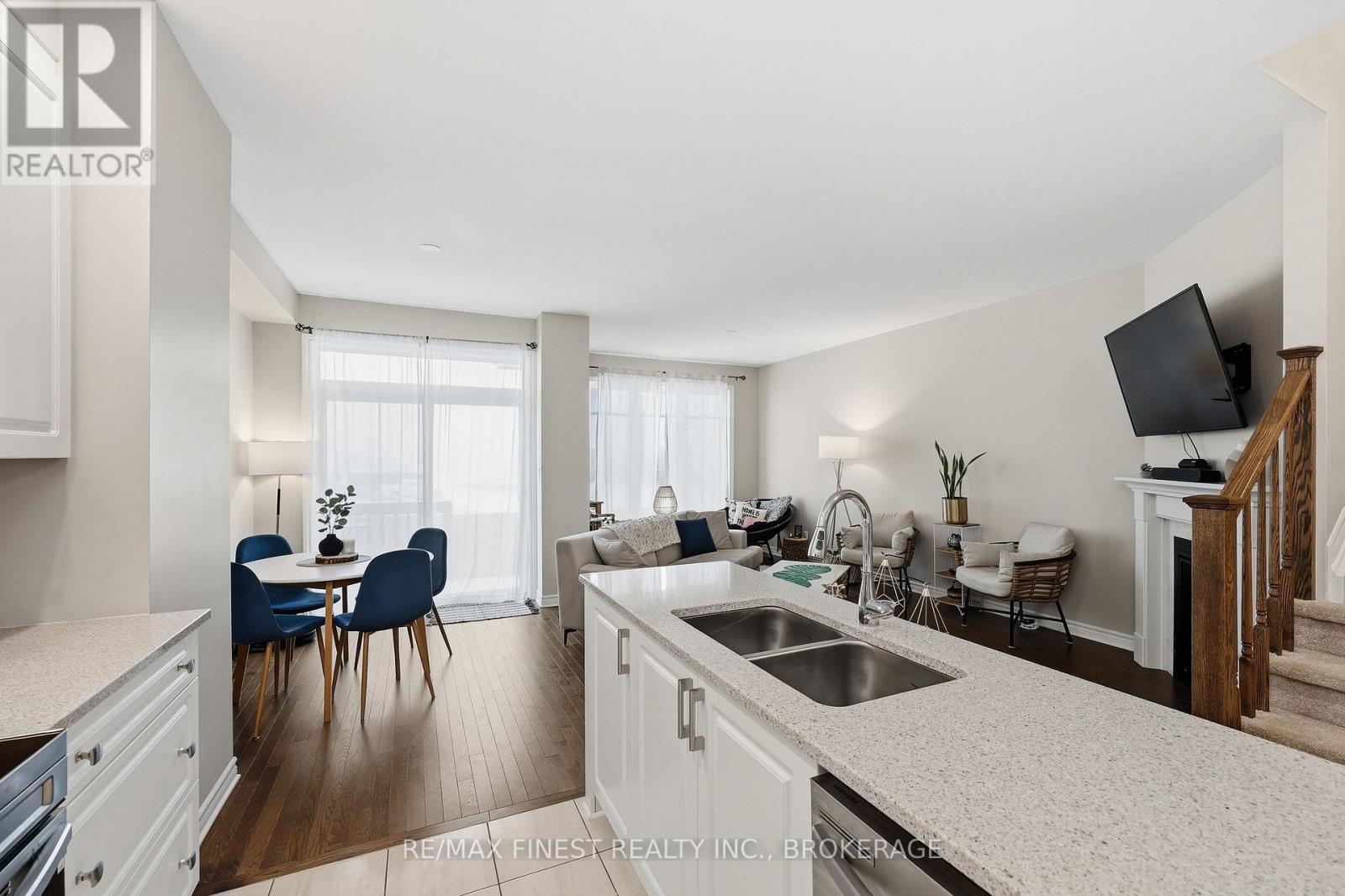 Welcome to this beautifully appointed 3-bedroom, 3-bathroom townhouse located in Kingston's west end. Designed with modern living in mind, this home offers high ceilings and an open-concept layout that's both spacious and inviting. The kitchen features quartz countertops, stainless steel appliances, and a stylish tile backsplash - perfect for everyday cooking or entertaining guests. Hardwood flooring spans the main level, while ceramic tile in all wet areas adds durability and easy maintenance. Relax by the cozy fireplace in the living room, framed by large transom windows and a patio door that flood the space with natural light. Upstairs, you'll find three comfortable bedrooms, including the primary bedroom with 4-piece ensuite, plus you'll enjoy the convenience of upper-level laundry. The finished rec room in the lower level provides added living space ideal for a family room, home gym, or office. Located close to schools, walking paths, west-end shops, and everyday amenities, this home combines comfort, style, and an excellent location. (id:64974)