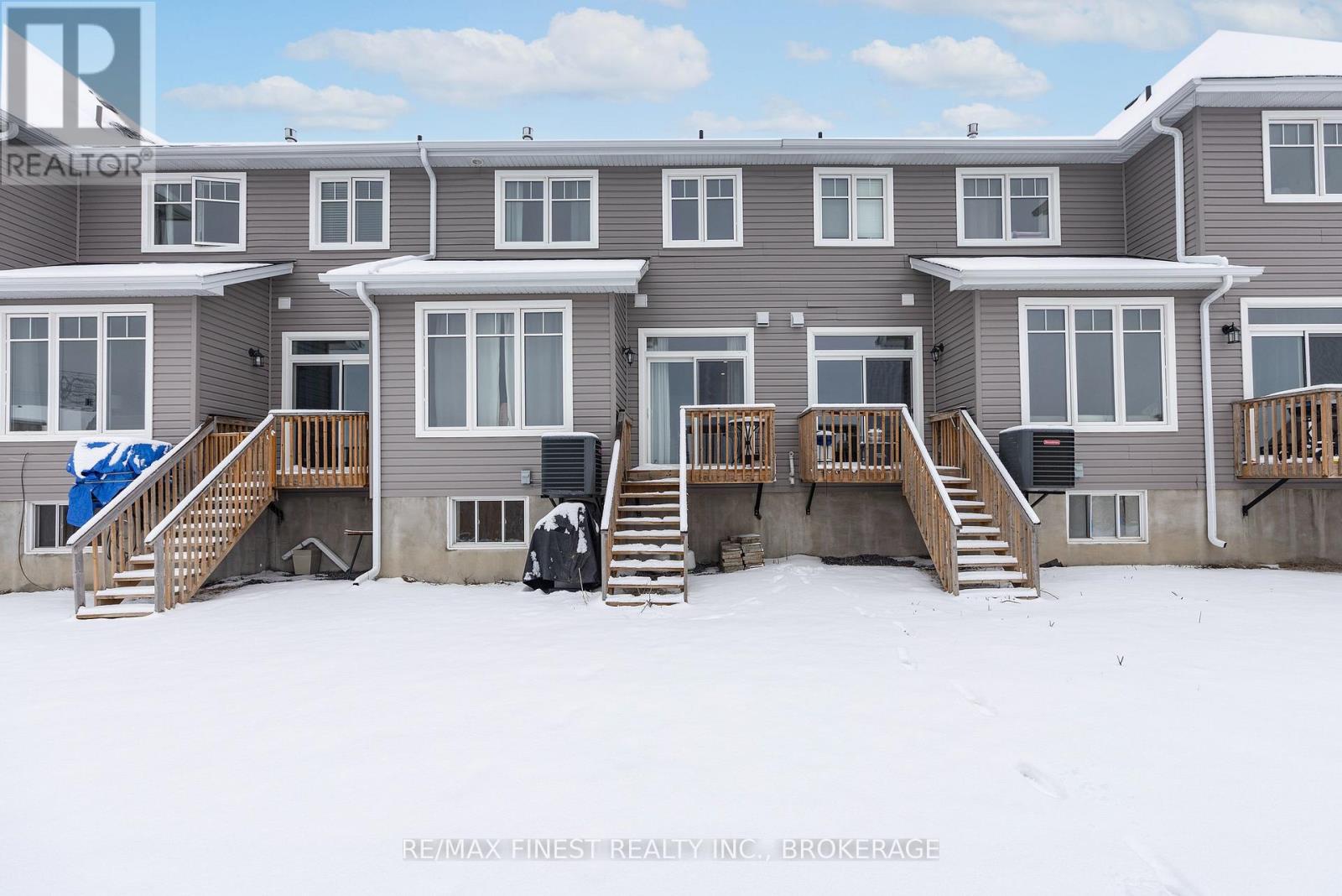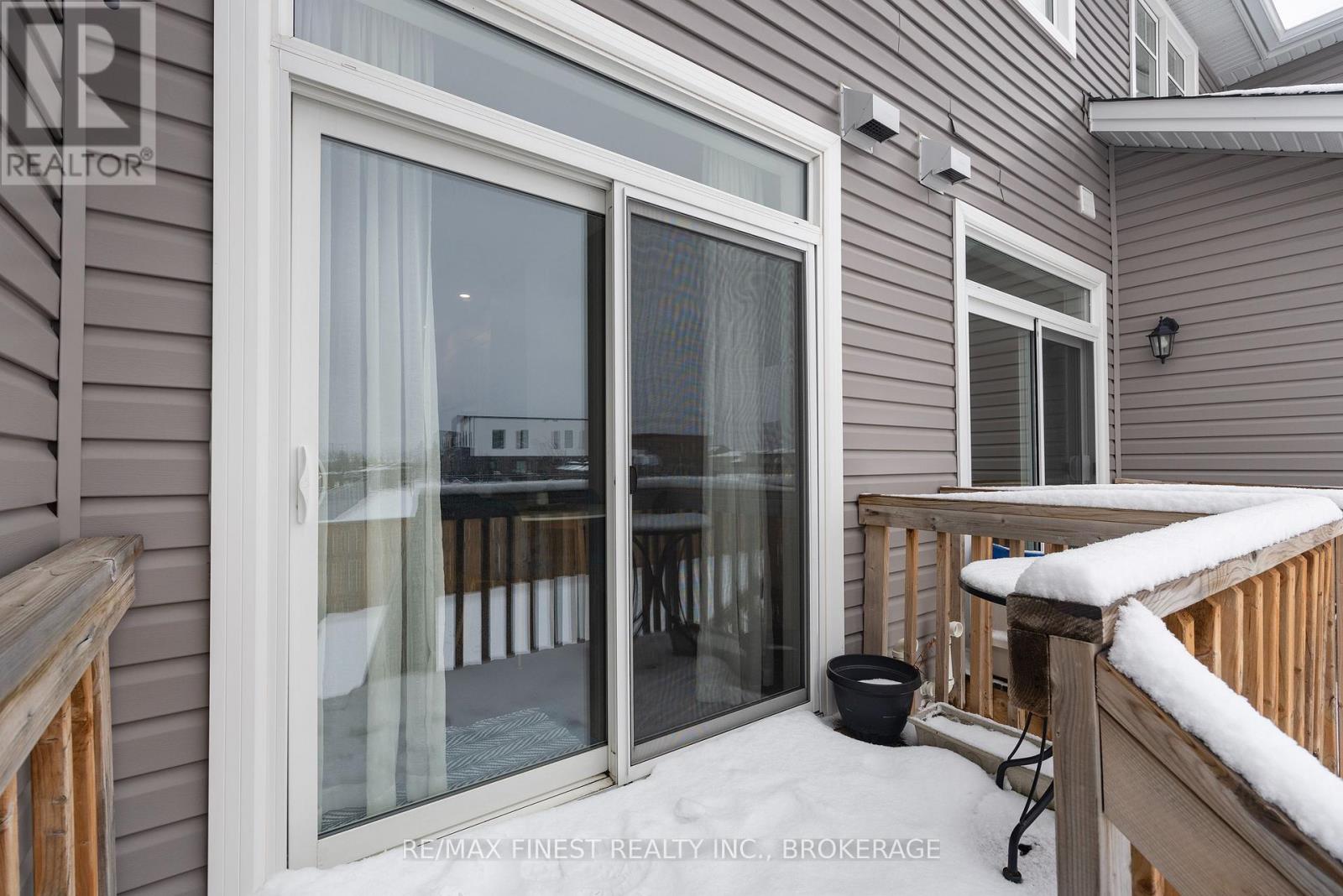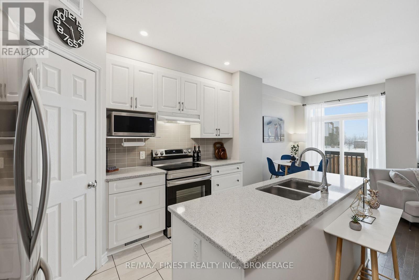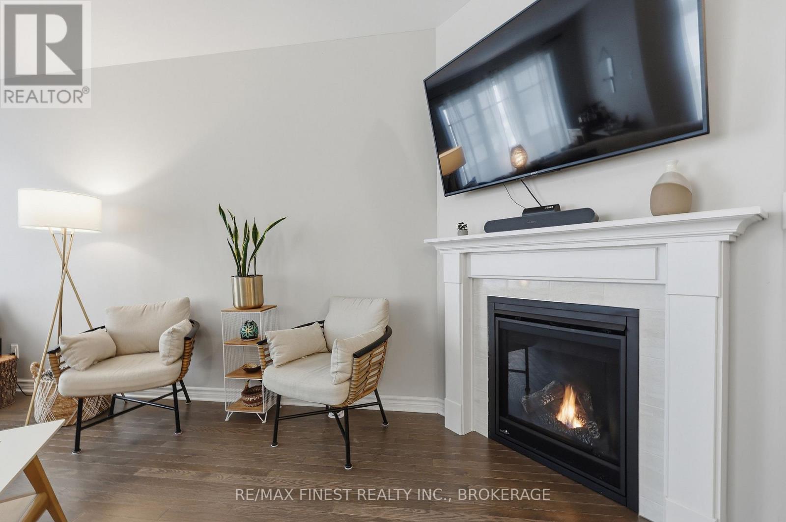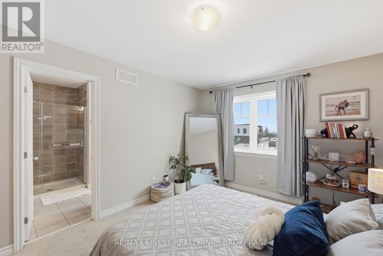Welcome to this beautifully appointed 3-bedroom, 3-bathroom townhouse located in Kingston's west end. Designed with modern living in mind, this home offers high ceilings and an open-concept layout that's both spacious and inviting. The kitchen features quartz countertops, stainless steel appliances, and a stylish tile backsplash - perfect for everyday cooking or entertaining guests. Hardwood flooring spans the main level, while ceramic tile in all wet areas adds durability and easy maintenance. Relax by the cozy fireplace in the living room, framed by large transom windows and a patio door that flood the space with natural light. Upstairs, you'll find three comfortable bedrooms, including the primary bedroom with 4-piece ensuite, plus you'll enjoy the convenience of upper-level laundry. The finished rec room in the lower level provides added living space ideal for a family room, home gym, or office. Located close to schools, walking paths, west-end shops, and everyday amenities, this home combines comfort, style, and an excellent location. (id:64974)