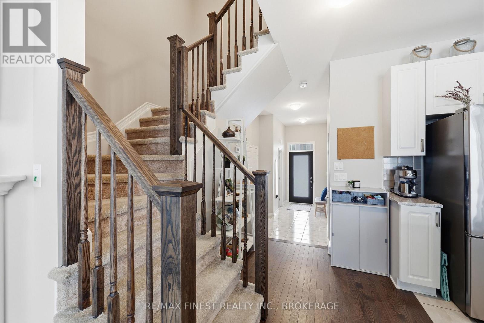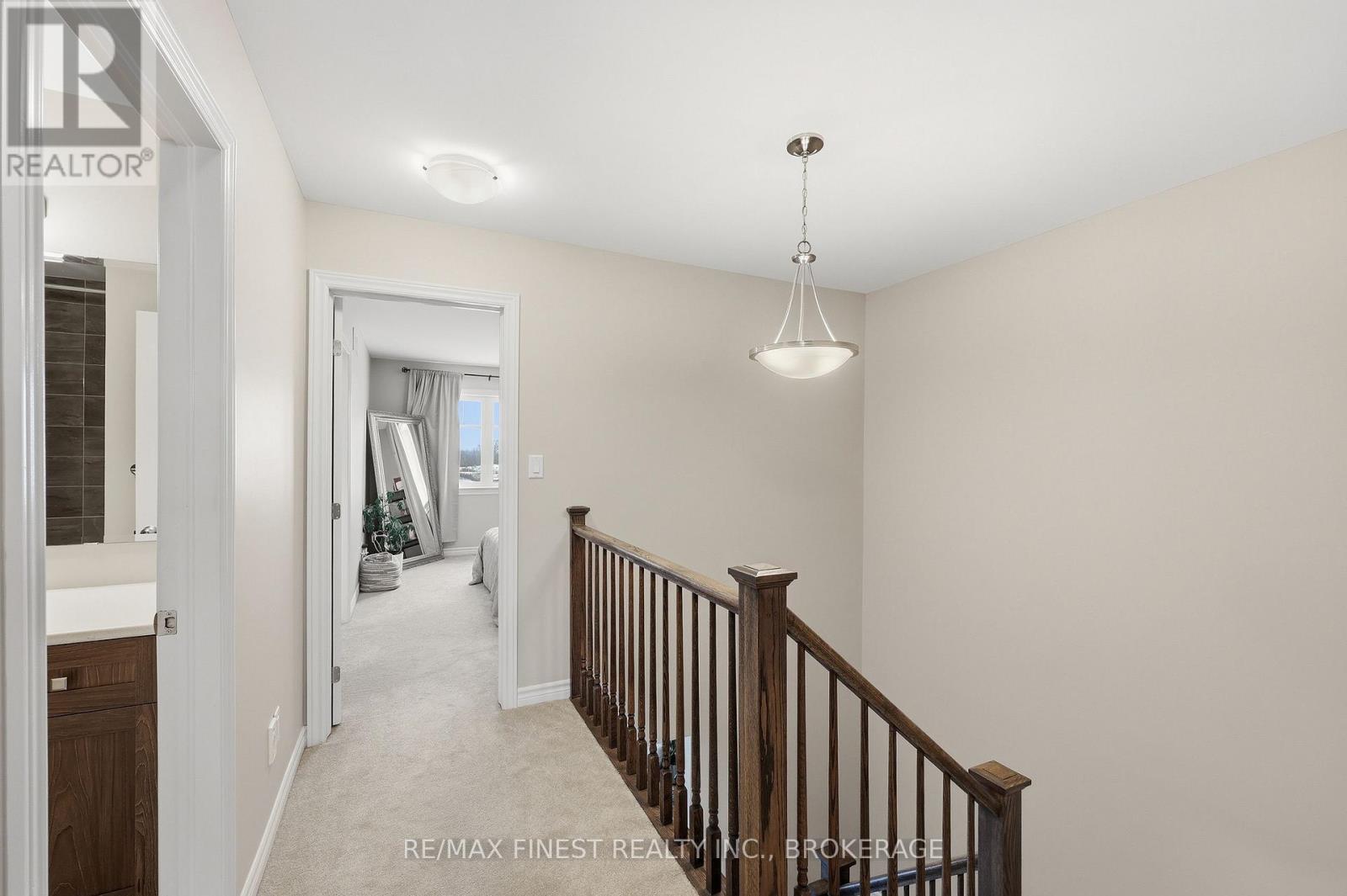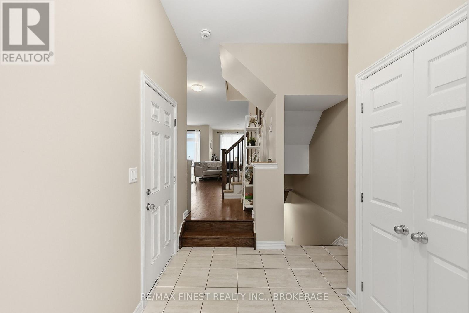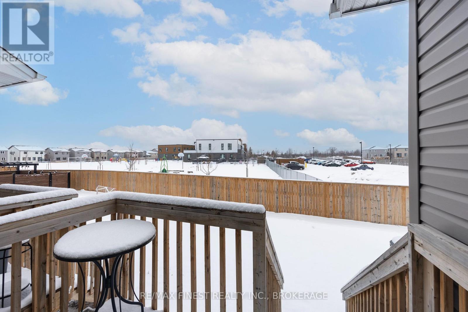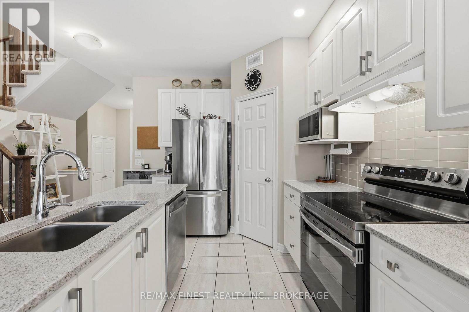 Welcome to this beautifully appointed 3-bedroom, 3-bathroom townhouse located in Kingston's west end. Designed with modern living in mind, this home offers high ceilings and an open-concept layout that's both spacious and inviting. The kitchen features quartz countertops, stainless steel appliances, and a stylish tile backsplash - perfect for everyday cooking or entertaining guests. Hardwood flooring spans the main level, while ceramic tile in all wet areas adds durability and easy maintenance. Relax by the cozy fireplace in the living room, framed by large transom windows and a patio door that flood the space with natural light. Upstairs, you'll find three comfortable bedrooms, including the primary bedroom with 4-piece ensuite, plus you'll enjoy the convenience of upper-level laundry. The finished rec room in the lower level provides added living space ideal for a family room, home gym, or office. Located close to schools, walking paths, west-end shops, and everyday amenities, this home combines comfort, style, and an excellent location. (id:64974)