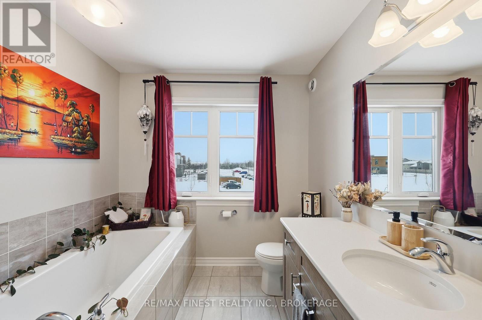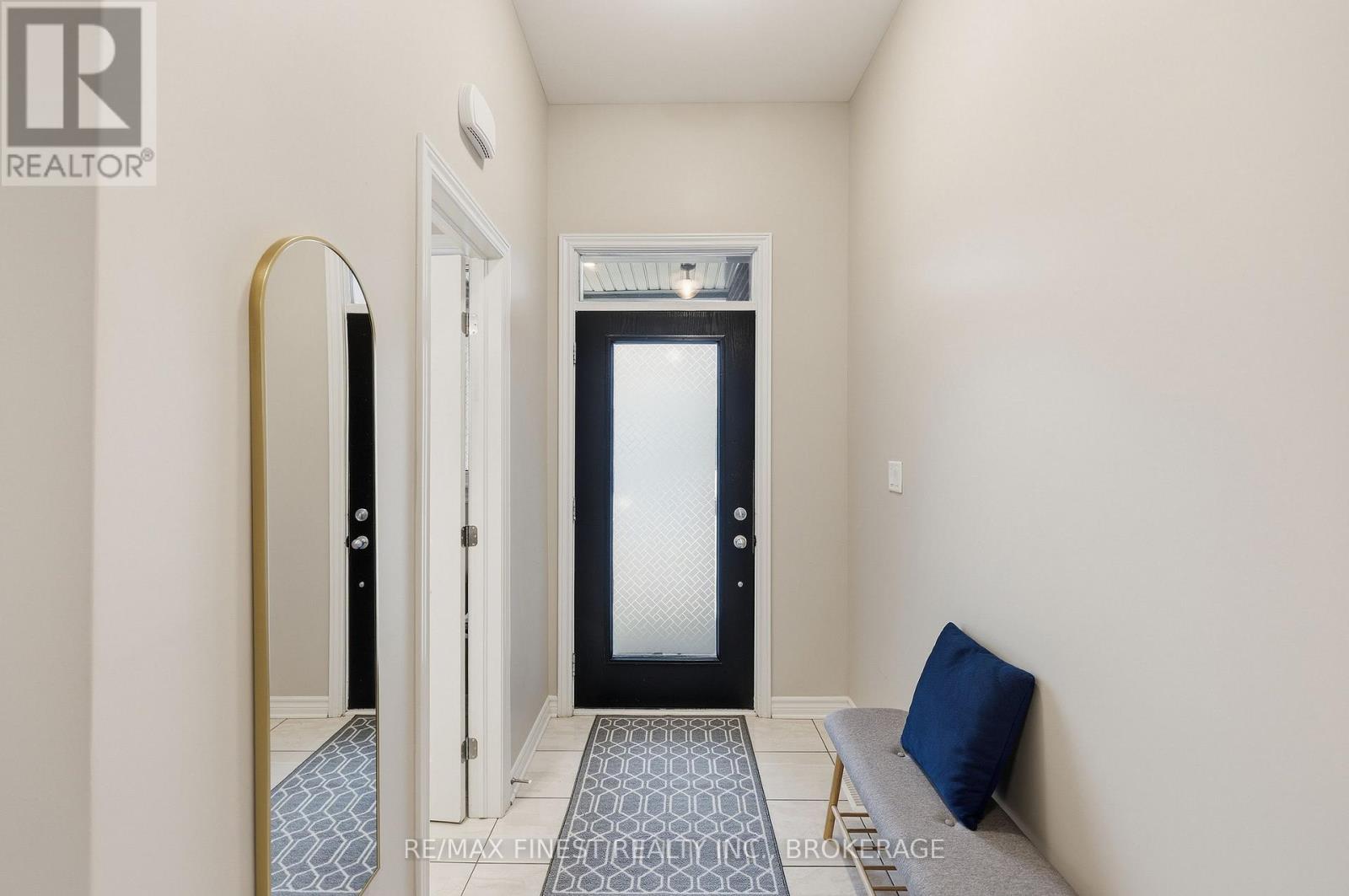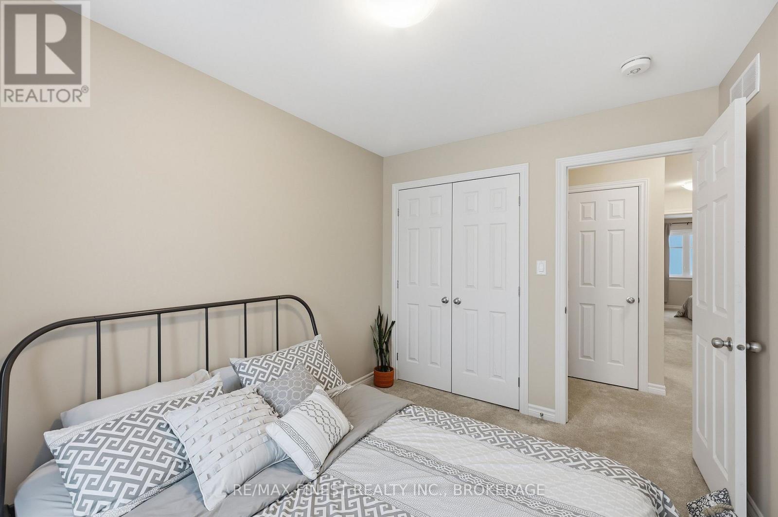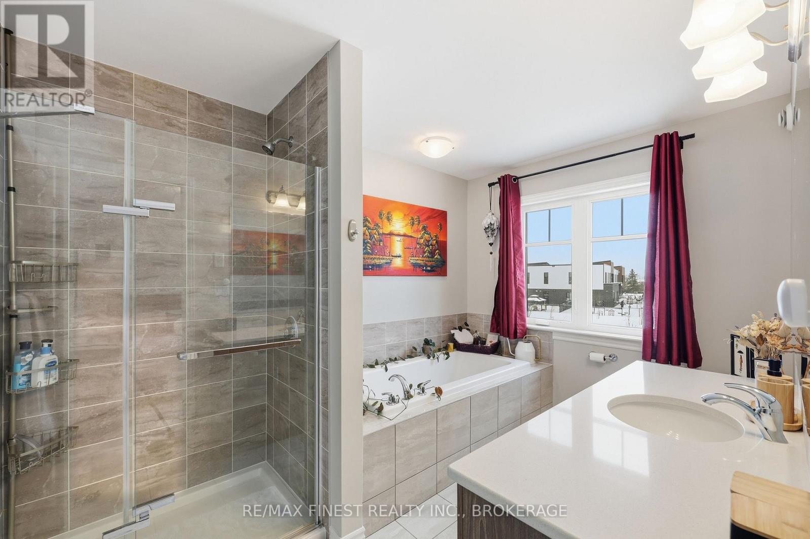 Welcome to this beautifully appointed 3-bedroom, 3-bathroom townhouse located in Kingston's west end. Designed with modern living in mind, this home offers high ceilings and an open-concept layout that's both spacious and inviting. The kitchen features quartz countertops, stainless steel appliances, and a stylish tile backsplash - perfect for everyday cooking or entertaining guests. Hardwood flooring spans the main level, while ceramic tile in all wet areas adds durability and easy maintenance. Relax by the cozy fireplace in the living room, framed by large transom windows and a patio door that flood the space with natural light. Upstairs, you'll find three comfortable bedrooms, including the primary bedroom with 4-piece ensuite, plus you'll enjoy the convenience of upper-level laundry. The finished rec room in the lower level provides added living space ideal for a family room, home gym, or office. Located close to schools, walking paths, west-end shops, and everyday amenities, this home combines comfort, style, and an excellent location. (id:64974)