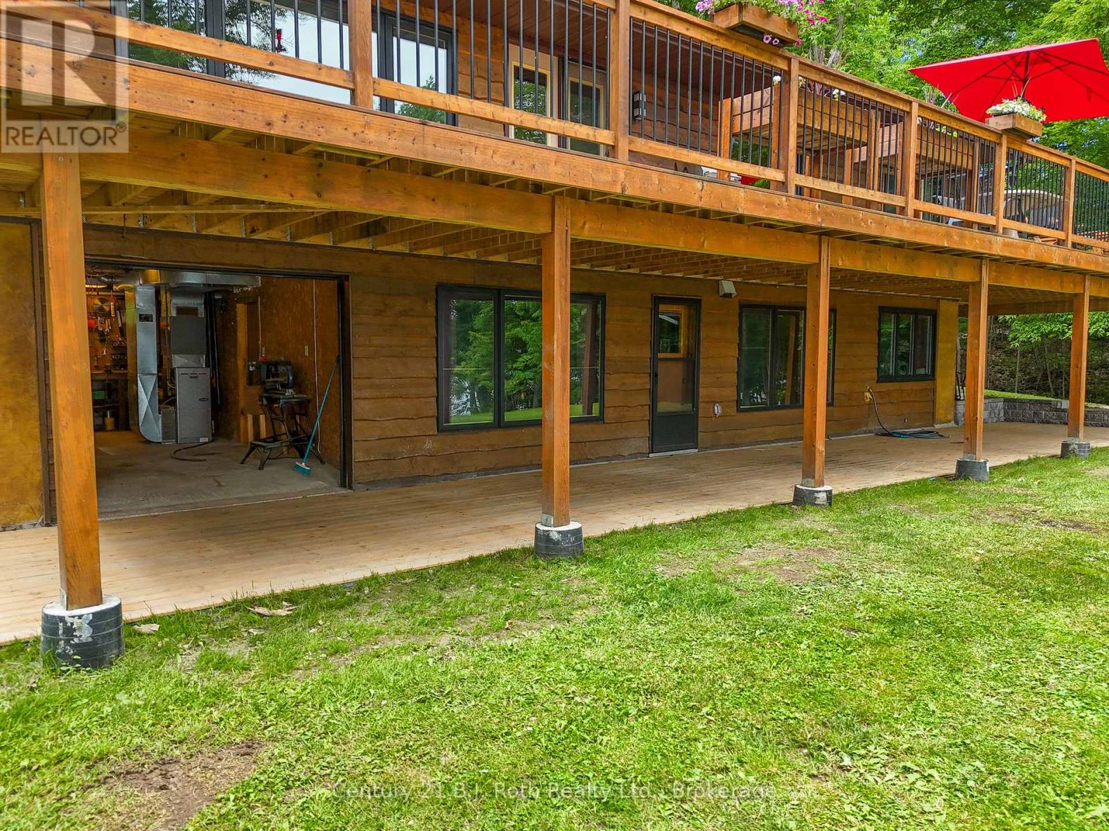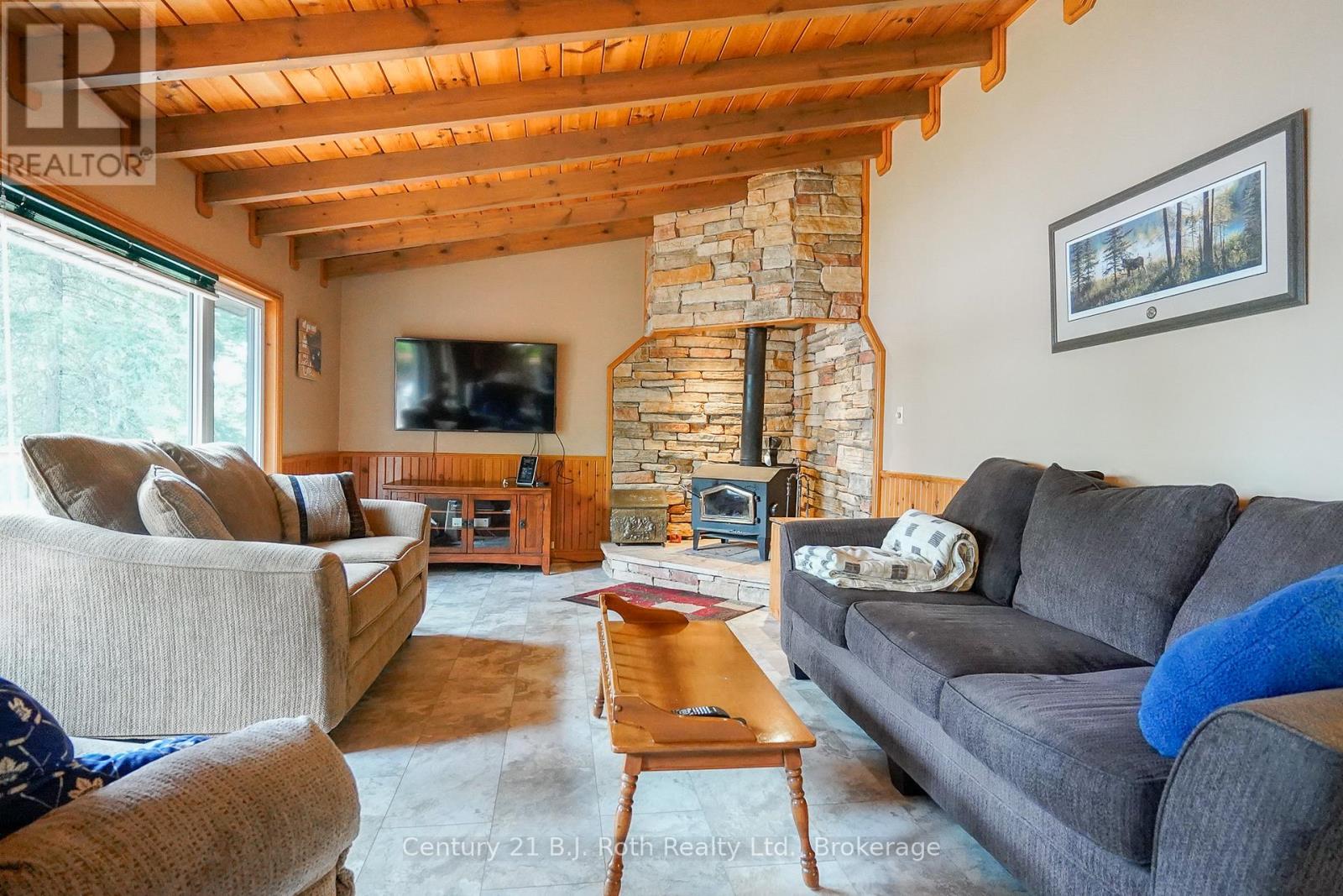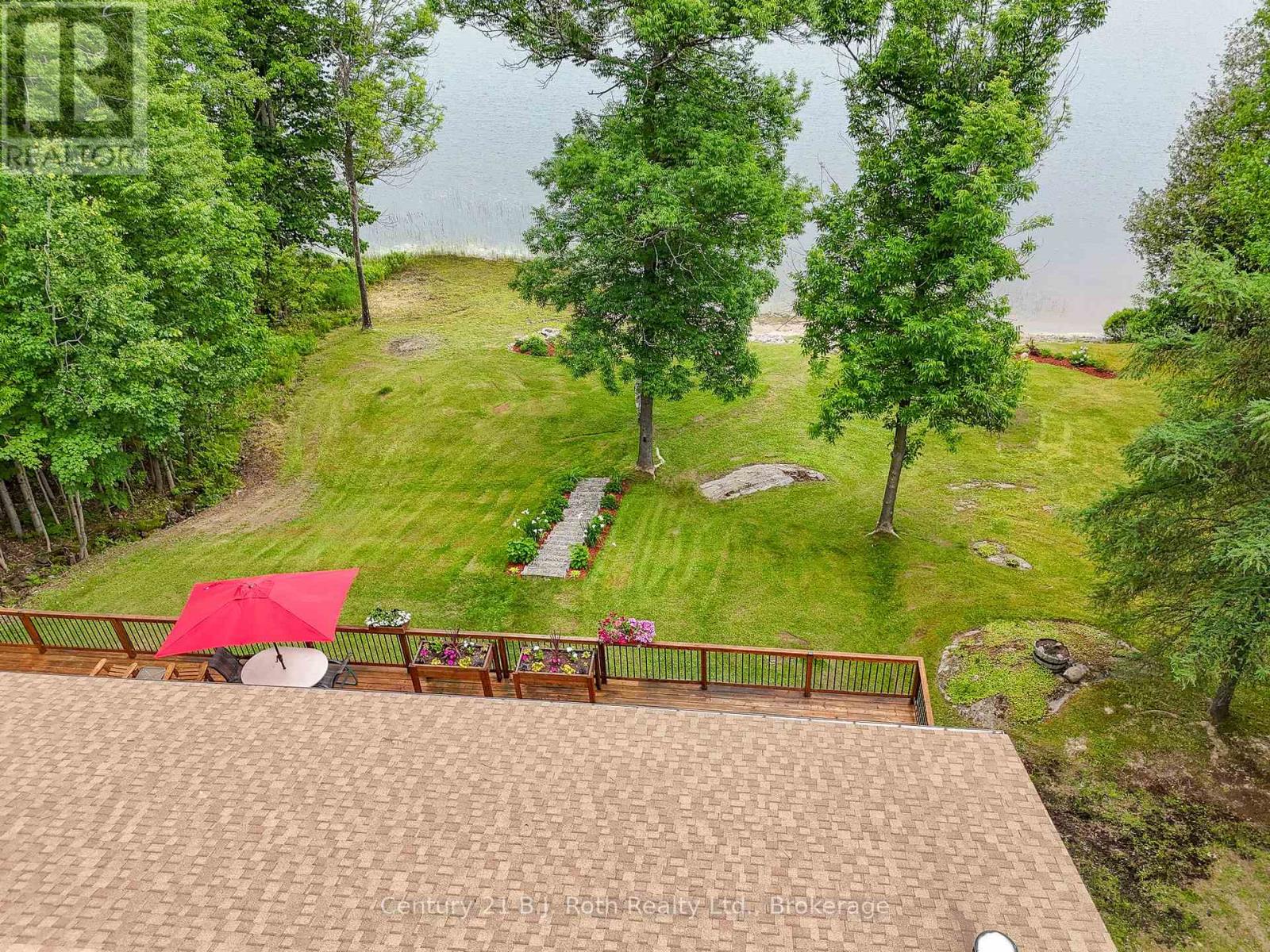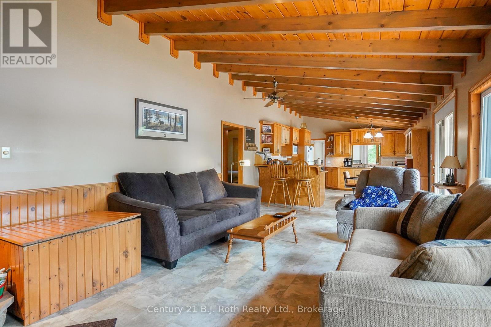 Welcome to this beautifully maintained year-round waterfront home on Restoule Lake, cherished by the same family for decades. Situated on over an acre of landscaped grounds, the property features mature trees, stunning rock outcroppings, a manicured lawn, and a gentle slope to approximately 200 ft of shoreline on the highly sought-after 14 km long Restoule Lake. Offering approximately 2,300 sq ft of finished living space, this home includes 4 bedrooms and 2 bathrooms. The main floor features a bright open-concept layout designed to capture lake views, with an eat-in kitchen, dining room (or office) with walkout, and a living room with walkout to the full-length elevated deck-perfect for entertaining or relaxing while enjoying the waterfront scenery. A woodstove adds warmth and charm for cozy winter evenings. Two bedrooms (one with walk-in closet), a 3-piece bath, and ample storage complete the main level. The finished walkout lower level offers a spacious family room, laundry area, office nook, two additional bedrooms, and a second 3-piece bathroom. A workshop/utility room with overhead door provides easy access for storage and recreational equipment. Additional features include a detached 32'3" x 24'3" insulated and heated garage/shop with 60-amp panel and a finished loft above with new flooring, ideal for guests or studio space. The home is serviced by 200-amp electrical, forced-air propane furnace (new 2026), central air, central vacuum, septic system, and lake water with UV system. Updated flooring and eavestroughs with gutter guards. High-speed internet and Bell Satellite available. Restoule Lake offers excellent swimming, boating, and fishing including Pike, Bass, Pickerel, Lake Trout, and world-class Muskie. Close to ATV and OFSC trails, Restoule Provincial Park, and acres of Crown land. Located on a quiet private road ($200/year maintenance) with friendly neighbours. Quick closing available. Excellent short-term rental opportunity. (id:64974)