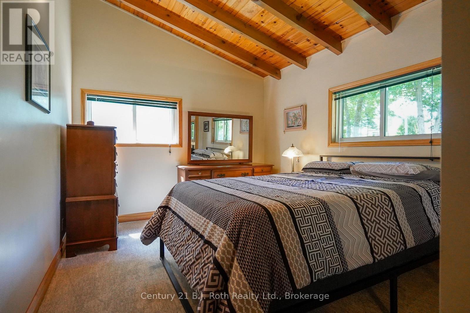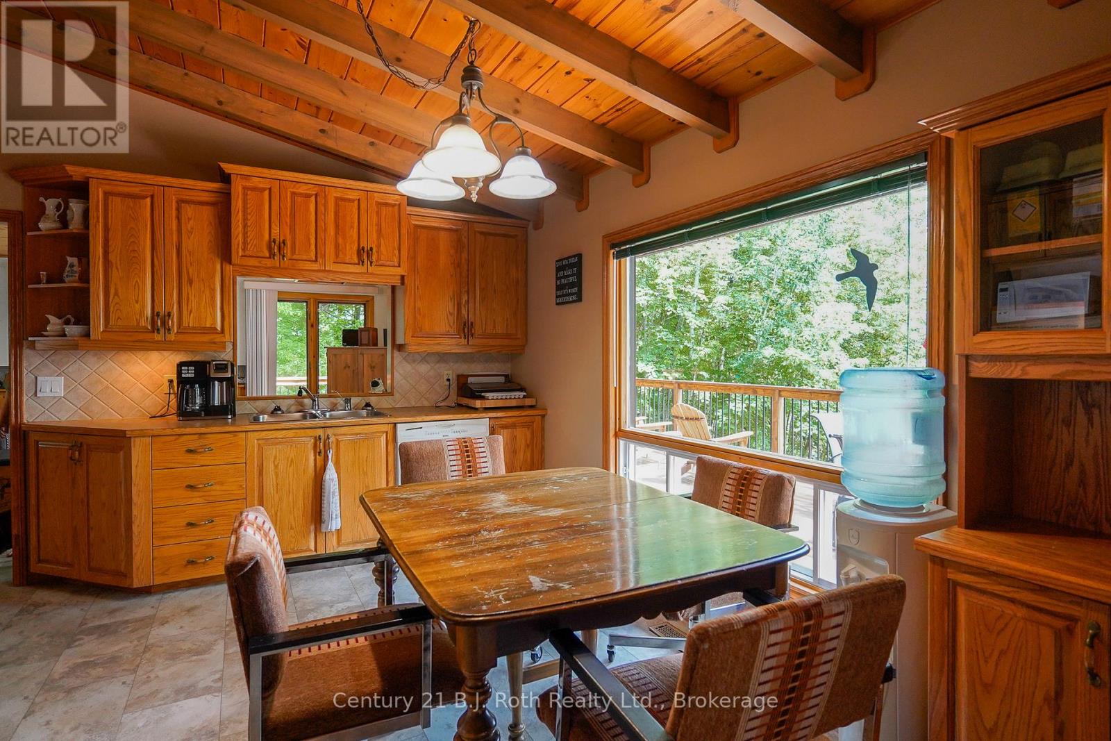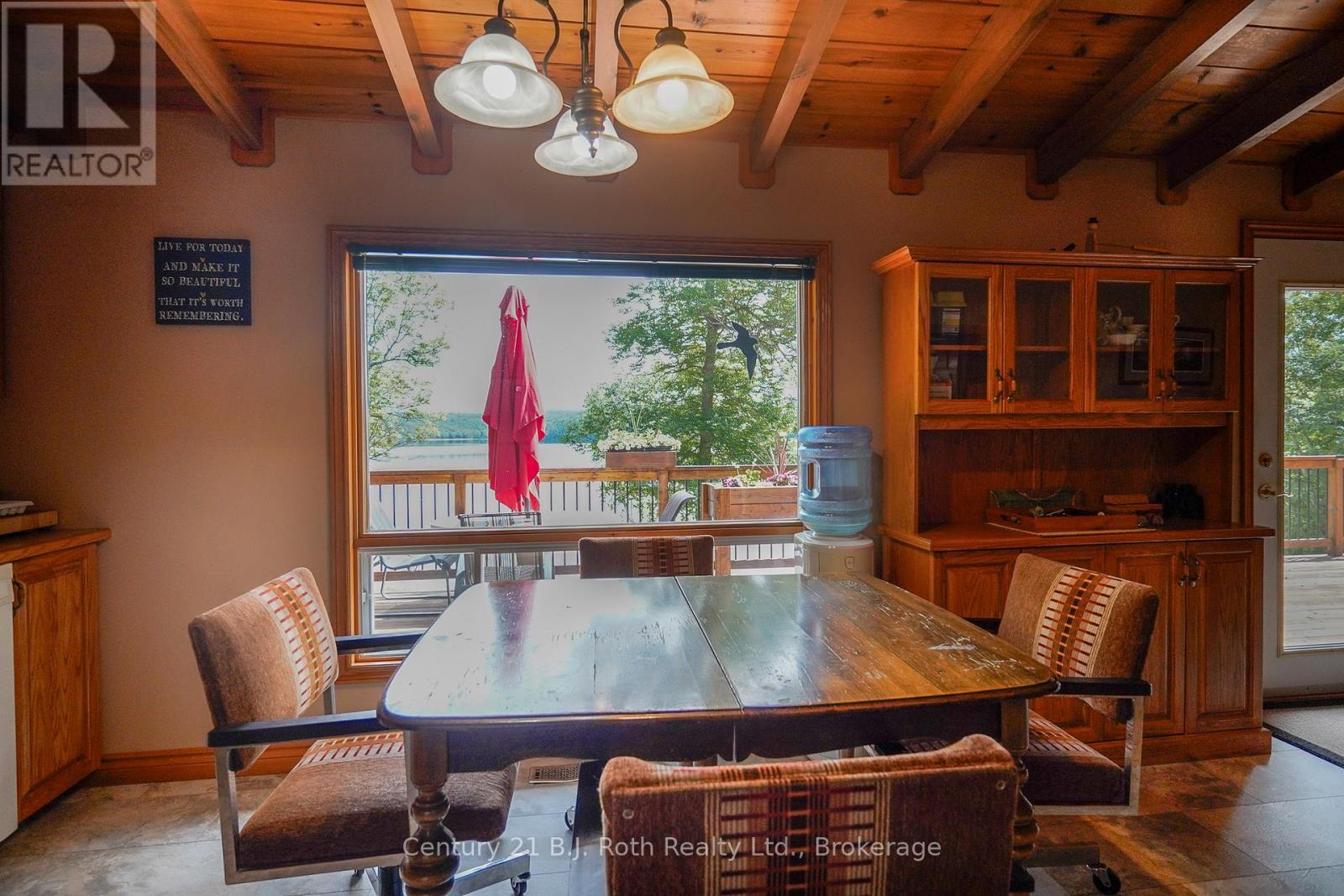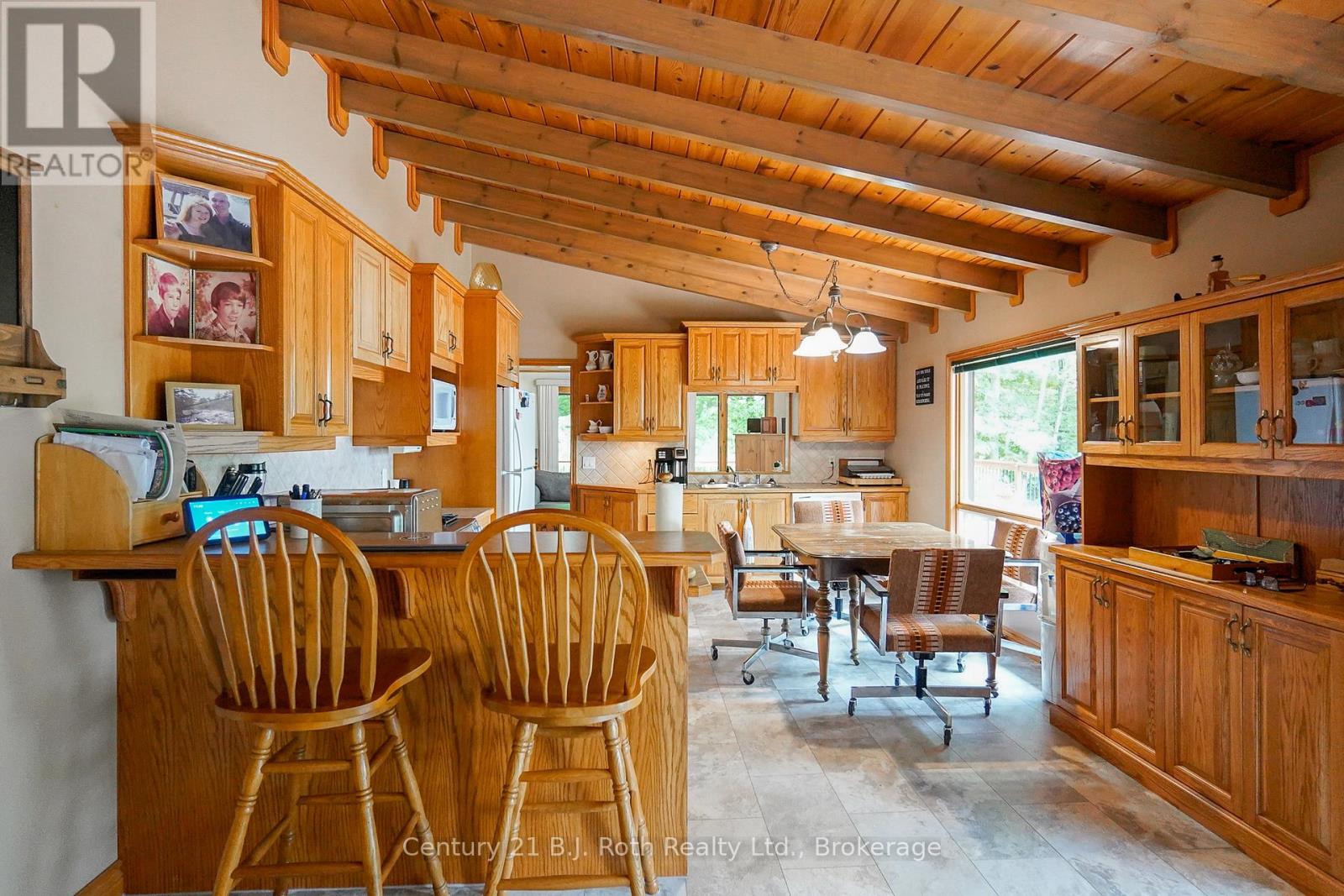 Welcome to this beautifully maintained year-round waterfront home on Restoule Lake, cherished by the same family for decades. Situated on over an acre of landscaped grounds, the property features mature trees, stunning rock outcroppings, a manicured lawn, and a gentle slope to approximately 200 ft of shoreline on the highly sought-after 14 km long Restoule Lake. Offering approximately 2,300 sq ft of finished living space, this home includes 4 bedrooms and 2 bathrooms. The main floor features a bright open-concept layout designed to capture lake views, with an eat-in kitchen, dining room (or office) with walkout, and a living room with walkout to the full-length elevated deck-perfect for entertaining or relaxing while enjoying the waterfront scenery. A woodstove adds warmth and charm for cozy winter evenings. Two bedrooms (one with walk-in closet), a 3-piece bath, and ample storage complete the main level. The finished walkout lower level offers a spacious family room, laundry area, office nook, two additional bedrooms, and a second 3-piece bathroom. A workshop/utility room with overhead door provides easy access for storage and recreational equipment. Additional features include a detached 32'3" x 24'3" insulated and heated garage/shop with 60-amp panel and a finished loft above with new flooring, ideal for guests or studio space. The home is serviced by 200-amp electrical, forced-air propane furnace (new 2026), central air, central vacuum, septic system, and lake water with UV system. Updated flooring and eavestroughs with gutter guards. High-speed internet and Bell Satellite available. Restoule Lake offers excellent swimming, boating, and fishing including Pike, Bass, Pickerel, Lake Trout, and world-class Muskie. Close to ATV and OFSC trails, Restoule Provincial Park, and acres of Crown land. Located on a quiet private road ($200/year maintenance) with friendly neighbours. Quick closing available. Excellent short-term rental opportunity. (id:64974)