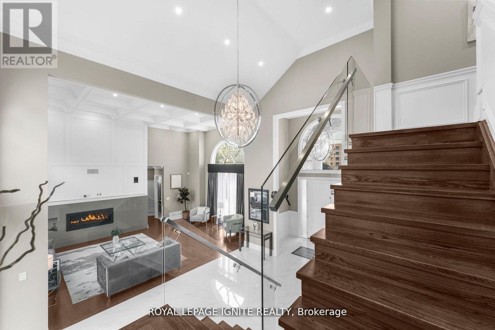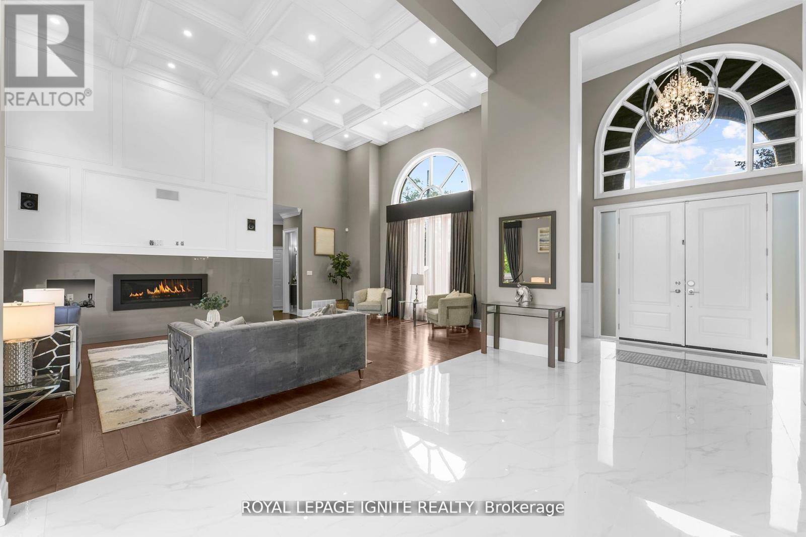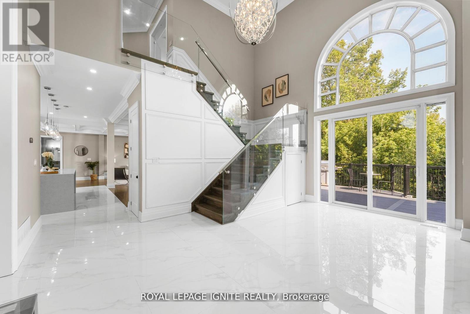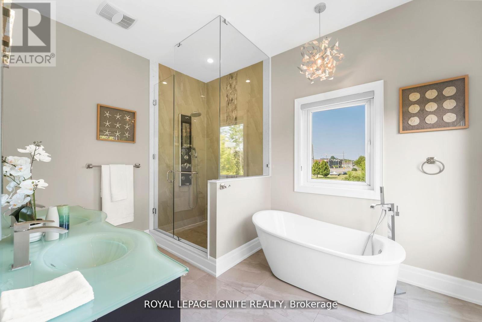 Welcome to this stunning custom-built estate home, just over five years new! Over 5000 sq ft of living space. This luxurious 5 +1 bedroom, 6 bathroom residence offers exceptional design, premium finishes, and a peaceful setting with Ravine views. Commercial zoning as well in Courtice Secondary Plan. Step into the grand foyer with soaring 22-foot ceilings, setting the stage for the open, light-filled interior. The living room features dramatic 18-foot ceilings and a striking gas fireplace, creating a warm and elegant space to relax or entertain. A wide staircase with sleek glass railings adds to the modern aesthetic. The chef's kitchen is a showstopper, complete with a 10-foot waterfall island, gas stove, and high-end stainless steel KitchenAid appliances ideal for gourmet cooking and hosting. Upstairs, three spacious bedrooms each feature their own ensuite bathroom, offering comfort and privacy for all. The primary suite includes a large walk-in closet, a luxurious 5-piece ensuite, and breathtaking views of nature. A versatile fourth & fifth bedrooms are conveniently located on the main floor. Newly renovated basement with separate entrance. Massive living/dining space. New stainless steel appliances. Huge bedroom with a walk-in closet and window. Step outside to enjoy a private deck and a massive backyard overlooking a tranquil creek perfect for relaxing or entertaining in a natural setting. View of the meandering creek and mature trees from the private backyard. Located close to all amenities, including shopping, dining, schools, and places of worship. Commuters will love the easy access to Highways 401, 418, and 407, with GO Transit and Durham Region Transit right at your doorstep. Millennium Trail access. Walk to the Courtice Rec Centre with a pool and Library. Don't miss this rare opportunity to live in a truly one-of-a-kind property that blends luxury living with everyday convenience! (id:64974)