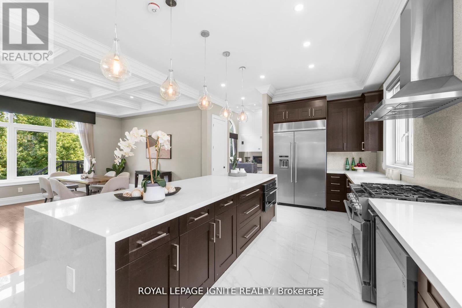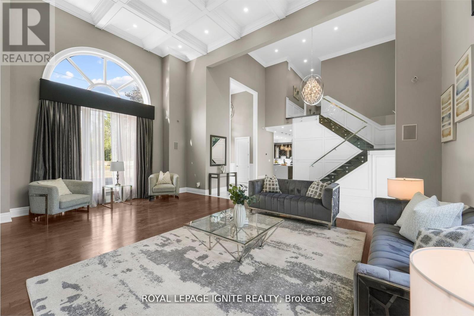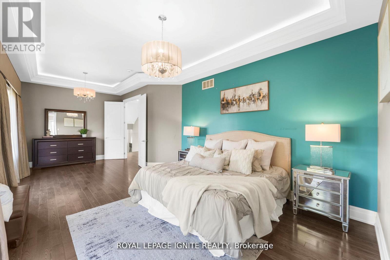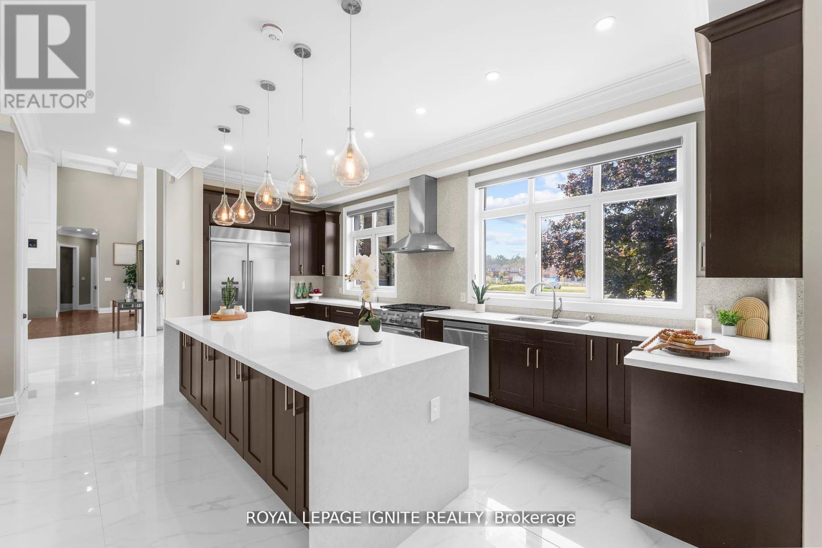 Welcome to this stunning custom-built estate home, just over five years new! Over 5000 sq ft of living space. This luxurious 5 +1 bedroom, 6 bathroom residence offers exceptional design, premium finishes, and a peaceful setting with Ravine views. Commercial zoning as well in Courtice Secondary Plan. Step into the grand foyer with soaring 22-foot ceilings, setting the stage for the open, light-filled interior. The living room features dramatic 18-foot ceilings and a striking gas fireplace, creating a warm and elegant space to relax or entertain. A wide staircase with sleek glass railings adds to the modern aesthetic. The chef's kitchen is a showstopper, complete with a 10-foot waterfall island, gas stove, and high-end stainless steel KitchenAid appliances ideal for gourmet cooking and hosting. Upstairs, three spacious bedrooms each feature their own ensuite bathroom, offering comfort and privacy for all. The primary suite includes a large walk-in closet, a luxurious 5-piece ensuite, and breathtaking views of nature. A versatile fourth & fifth bedrooms are conveniently located on the main floor. Newly renovated basement with separate entrance. Massive living/dining space. New stainless steel appliances. Huge bedroom with a walk-in closet and window. Step outside to enjoy a private deck and a massive backyard overlooking a tranquil creek perfect for relaxing or entertaining in a natural setting. View of the meandering creek and mature trees from the private backyard. Located close to all amenities, including shopping, dining, schools, and places of worship. Commuters will love the easy access to Highways 401, 418, and 407, with GO Transit and Durham Region Transit right at your doorstep. Millennium Trail access. Walk to the Courtice Rec Centre with a pool and Library. Don't miss this rare opportunity to live in a truly one-of-a-kind property that blends luxury living with everyday convenience! (id:64974)
