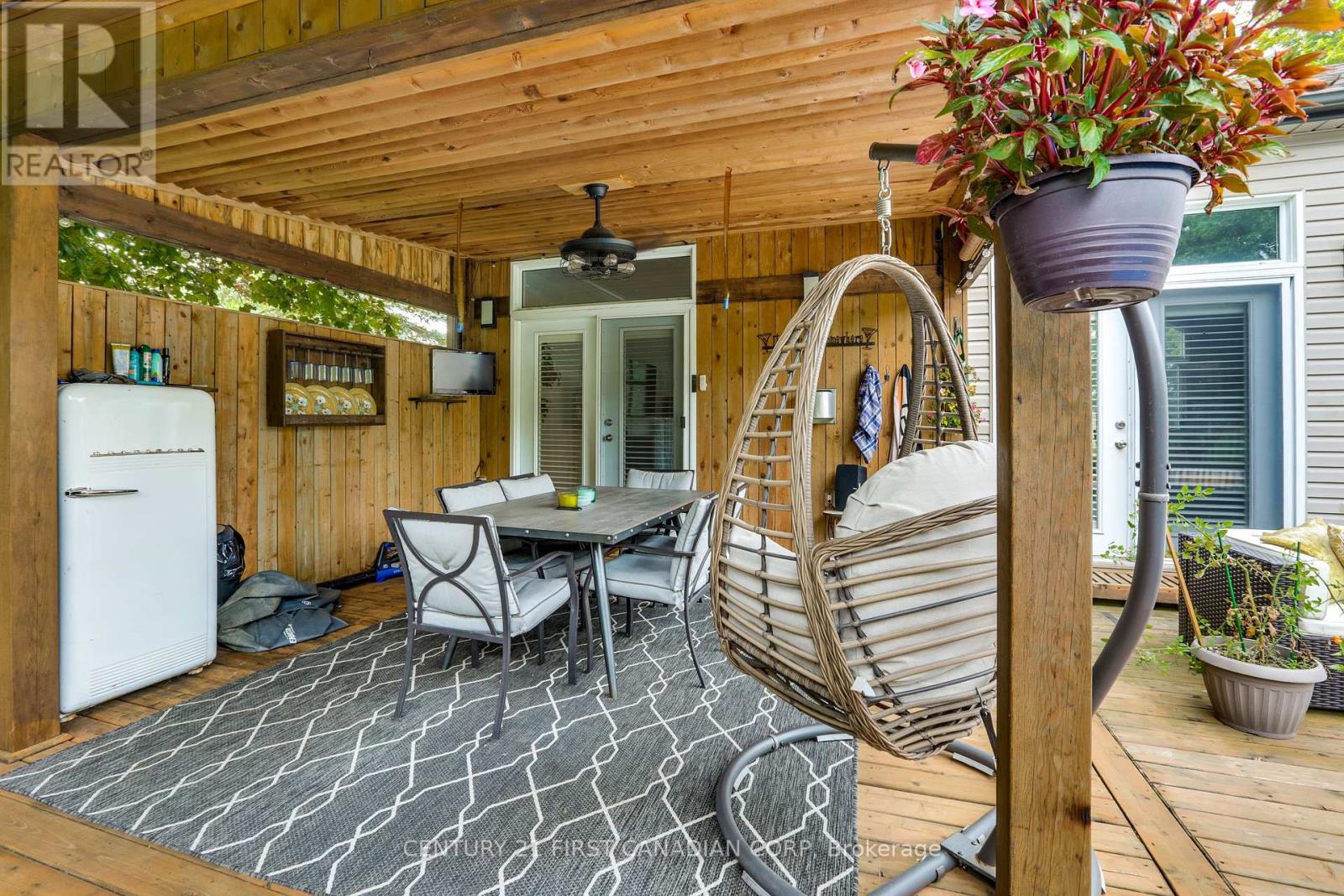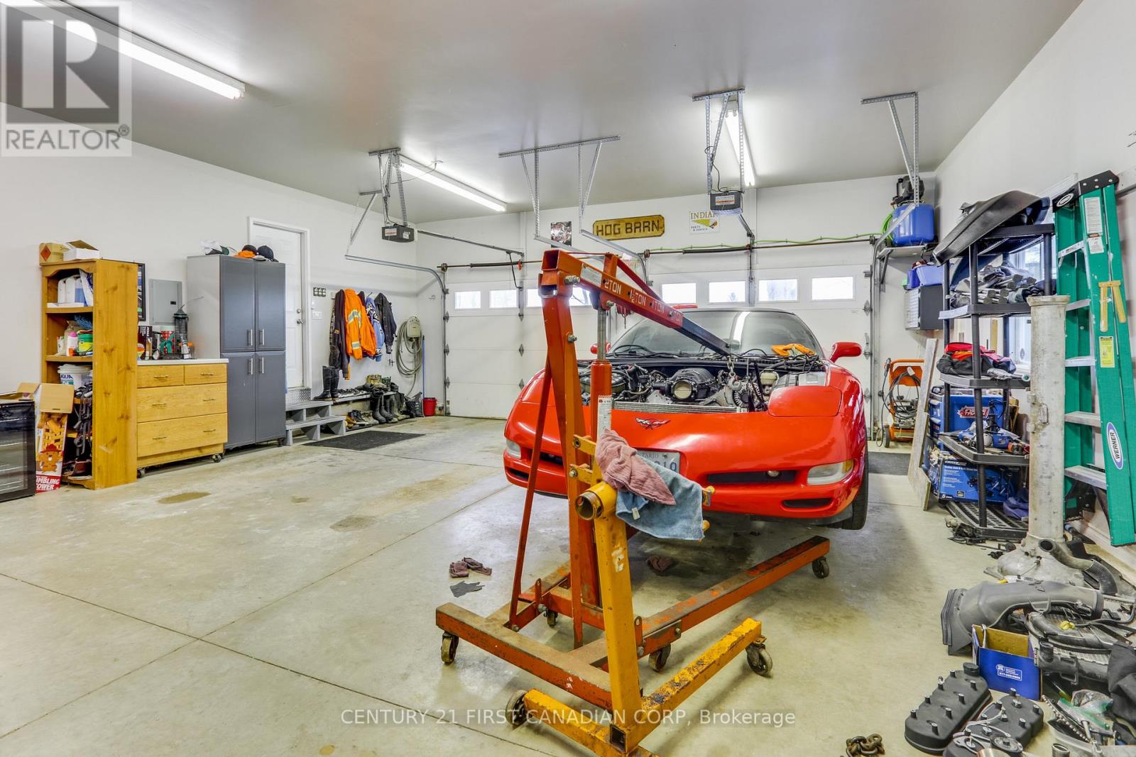 Welcome to this well-appointed raised ranch offering the perfect blend of country living and city convenience. This 3-bedroom home features a primary bedroom on the main level, located just a few steps up from the foyer, complete with a large walk-in closet and access to a spacious bathroom with jacuzzi tub and walk-in shower.The open-concept kitchen, dining, and living area is filled with natural light and overlooks the just-over-half-acre lot backing onto farmland, offering peaceful views and privacy.The lower level includes two additional bedrooms and a large family room, ideal for kids or a private retreat. A separate mid-level houses the foyer, mudroom/laundry, convenient half bath, and direct garage access, creating excellent functionality and separation of space.The double-wide, double-deep garage provides room for up to four vehicles or recreational toys and features a rear door to the fully fenced backyard. Enjoy summer evenings on the partially covered deck, relax by the firepit with sunset views, or cool off in the above-ground pool. Additional storage is provided by a large shed. Located minutes from London on a paved road with quick access to Hwy 401. Heated by forced-air propane. (id:64974)