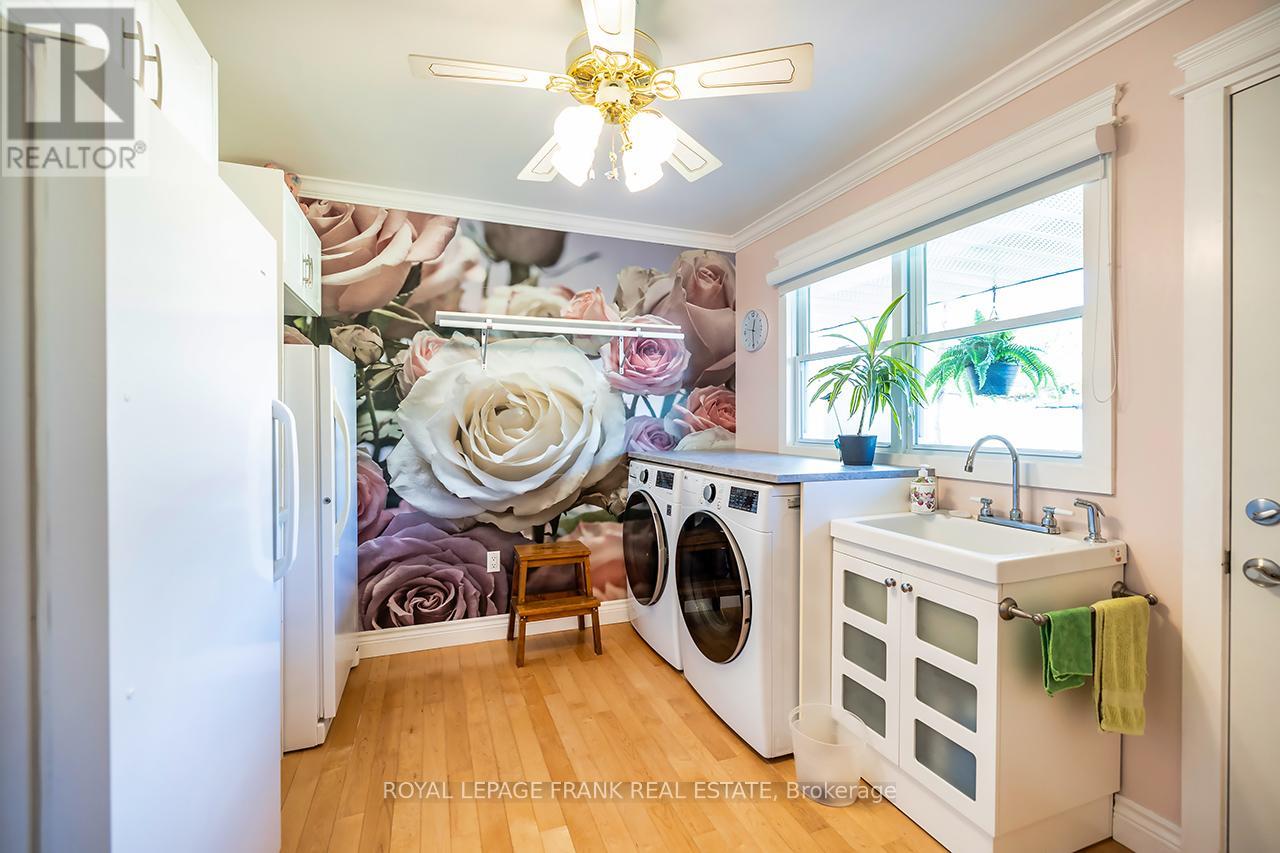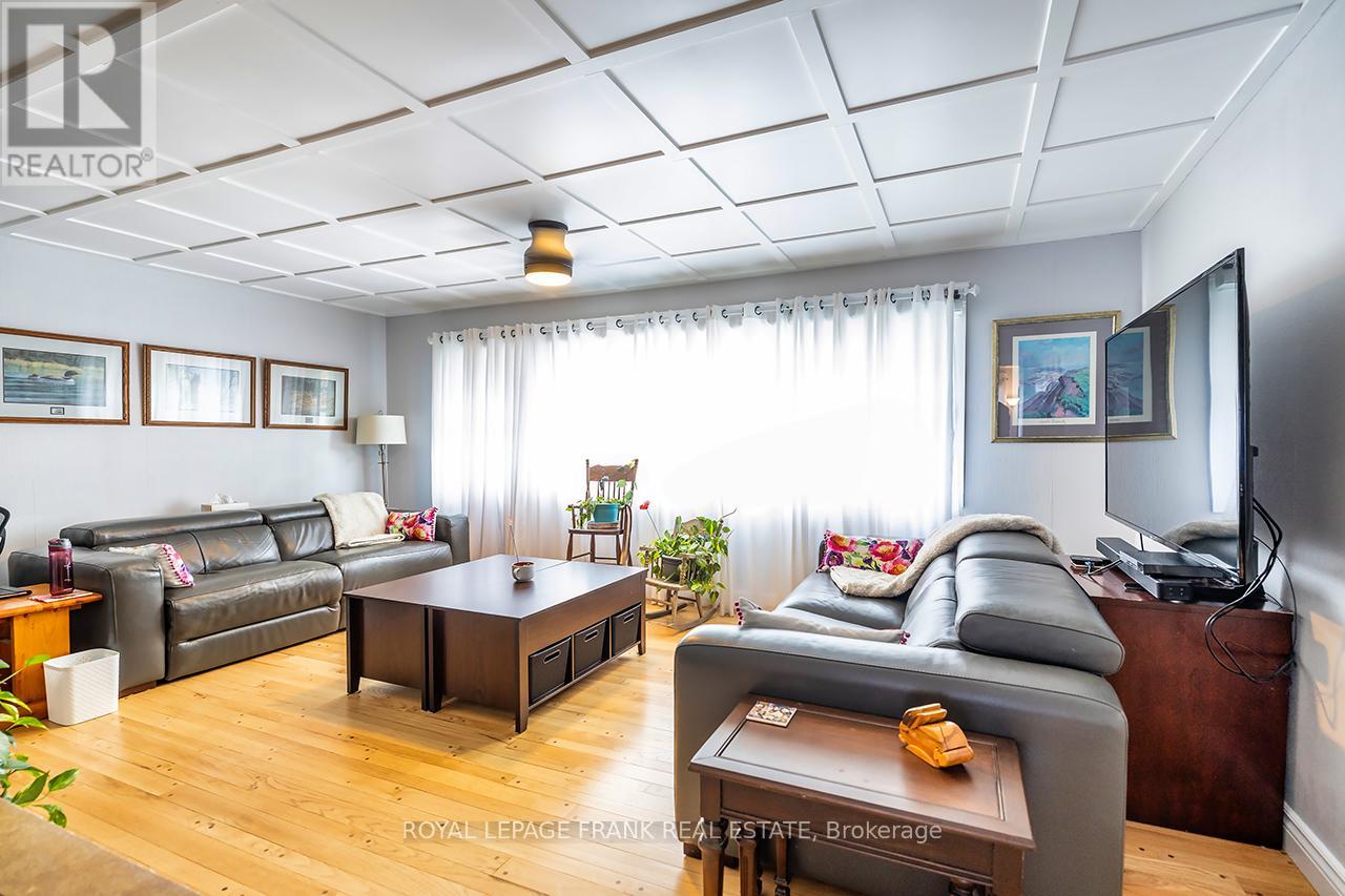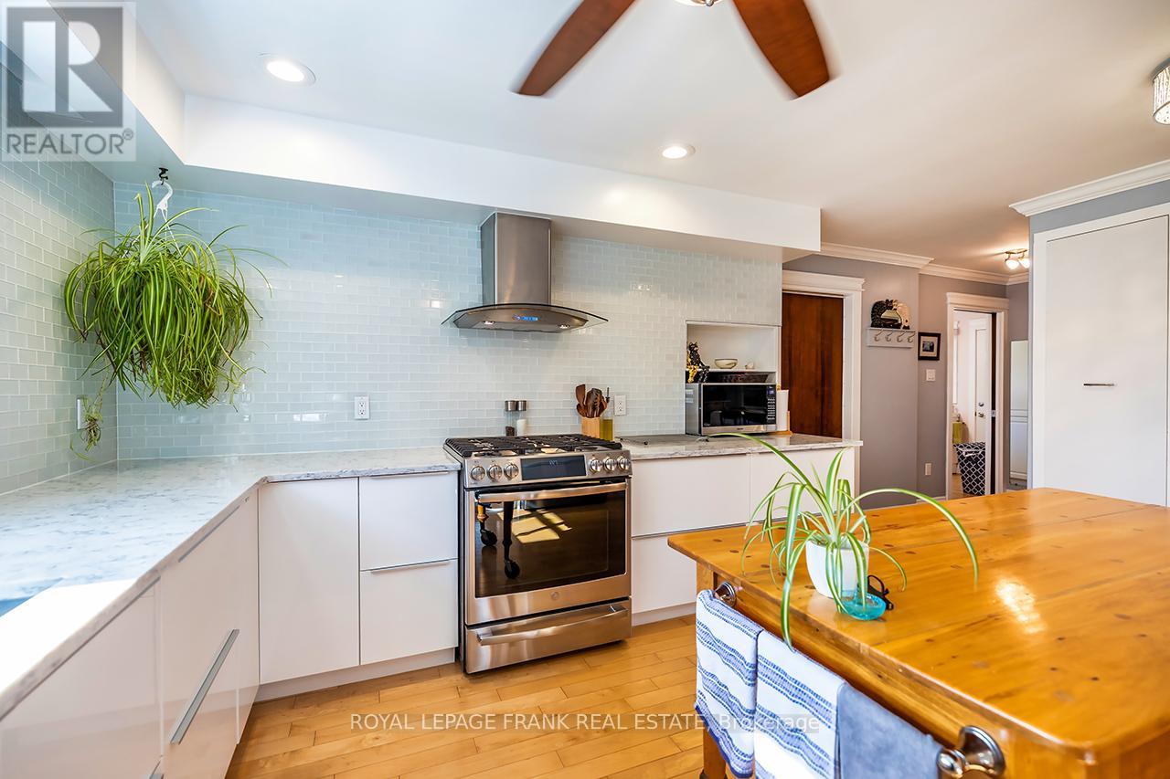 Beautifully renovated 2+2 bedroom ranch-style bungalow with finished basement and a legal 1,200 sq ft 2-bedroom apt. with private entrance. Come home to timeless Georgia Marble brick, aluminum siding, and mature maple trees. An 11-car driveway with turnaround, oversized 2-car garage, and landscaped walkway welcome you home. Inside, the spacious Foyer features granite floors and a double closet with custom shelving. The bright, open main floor showcases a Kitchen with expansive quartz counters, double sinks, range hood, stainless appliances, glass tile backsplash and smart cabinetry with drawers within drawers, and pullout pantry. A Powder Room is conveniently located near the Garage entrance. Main floor Laundry offers its own fridge, freezer, built-ins, and walkout to the fenced yard with new patio and gas BBQ hookup. The large Dining Room opens to a 3-season Sunroom, perfect for family gatherings and sunset views. Enjoy the spacious Living Room or retreat to the cozy Family Room/Den with a gas fireplace, tray ceiling, ceiling fan, and a unique wall safe. The primary Bedroom features his & hers closets, ceiling fan, and semi-ensuite bath with soaker tub and separate shower. A generous Guest Bedroom completes the main level, highlighted by hardwood floors and crown moulding throughout. Downstairs, find a Rec Room/Gym, and abundant storage. The home's true bonus is the brand-new, self-contained legal apartment-1,200 sq ft with full kitchen, Laundry, Living/Dining area, 4-pc Bath, and 2 large Bedrooms, each with double closets, plus private yard with shaded sitting area. Outside, enjoy a fenced yard with 10'x10' shed with ramp, ideal for tools or seasonal storage. The oversized garage includes two entrances to the home, three service doors, workbenches, cabinetry, utility sink with hot and cold water, and a powered 10' x 10' "drive Shed" with roll-up door. Warm, inviting, and filled with possibilities-this isn't just a house, it's a home. Come see for yourself! (id:64974)