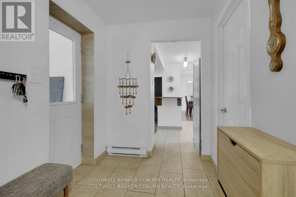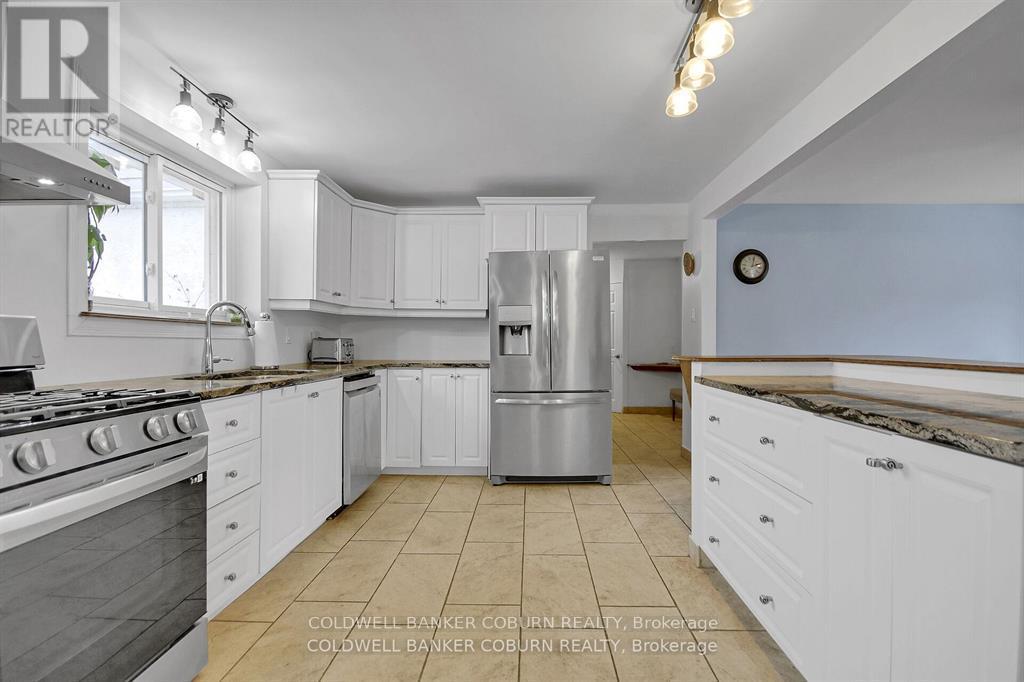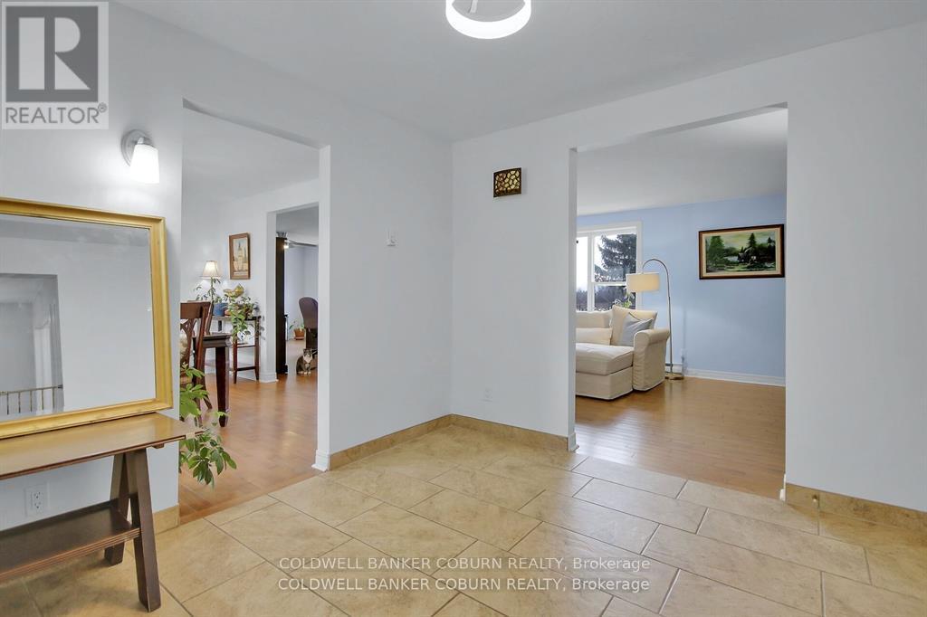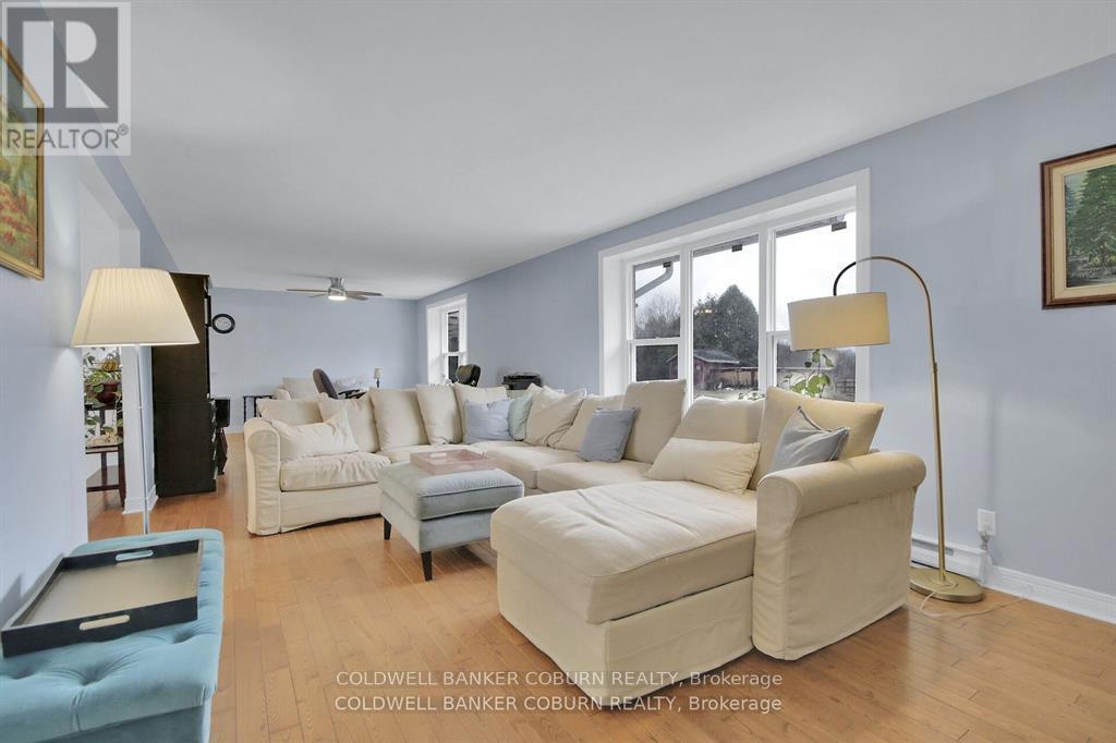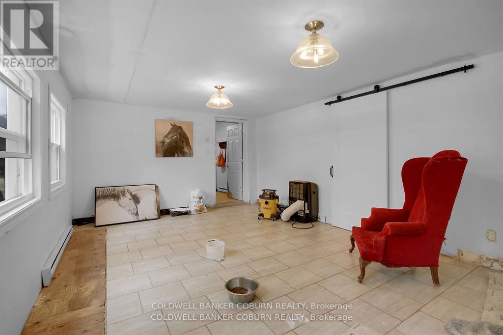 Welcome to 1696 Merwin Lane! This sprawling bungalow is situated on over 5.5 acres. The home is a two minute drive to the St.Lawrence River and close to all of Prescott's wonderful amenities including schools, stores, parks and beach. This home is in the hacienda style with stucco facade. The main living area features a bright and huge living room that faces the back of the property overlooking the meadow. The kitchen has updated cabinetry and granite counter tops. The dining room opens out to the living room - suitable for large family get togethers. The side entrance of the home opens up to a large screened in porch, mud room, powder room, walk-in pantry and a grand room that was once the garage. This room is currently being used for the pets but could easily become a new family room or an extra bedroom or office. The primary bedroom is bright and spacious with a large ensuite. The other two bedrooms are also a good size and share a newly updated bathroom. The outside of the home features a patio with built-in gazebo, a court yard near the front door and so many perennials that grow back year after year including hydrangeas and roses. There is a barn that offers 4 stalls, tack room and a large open area. (id:64974)