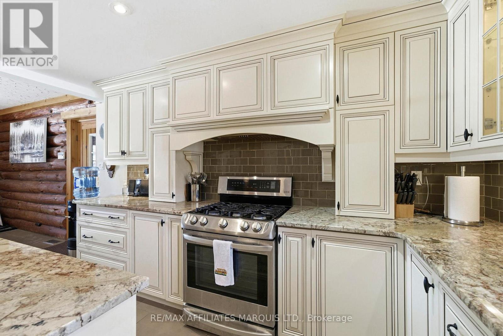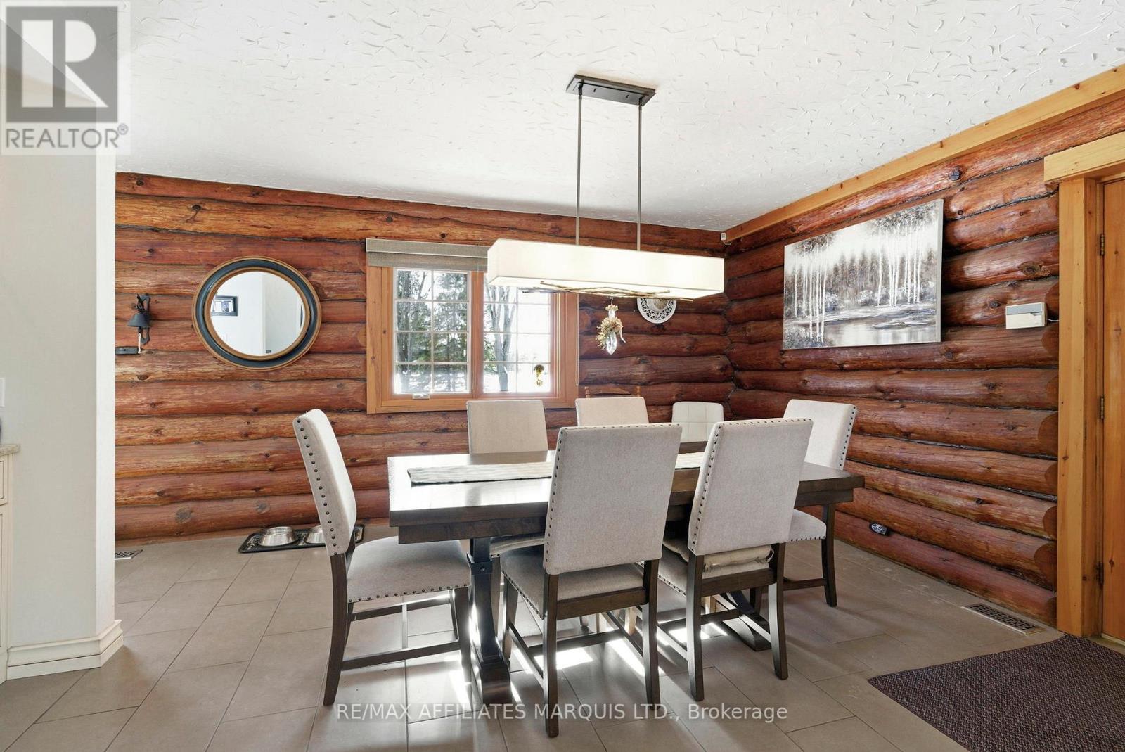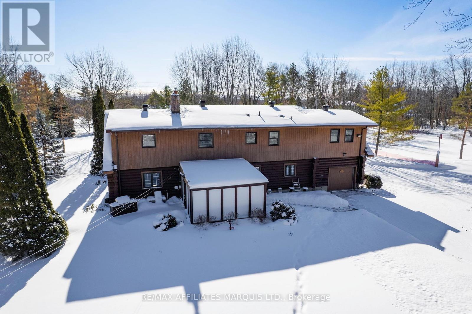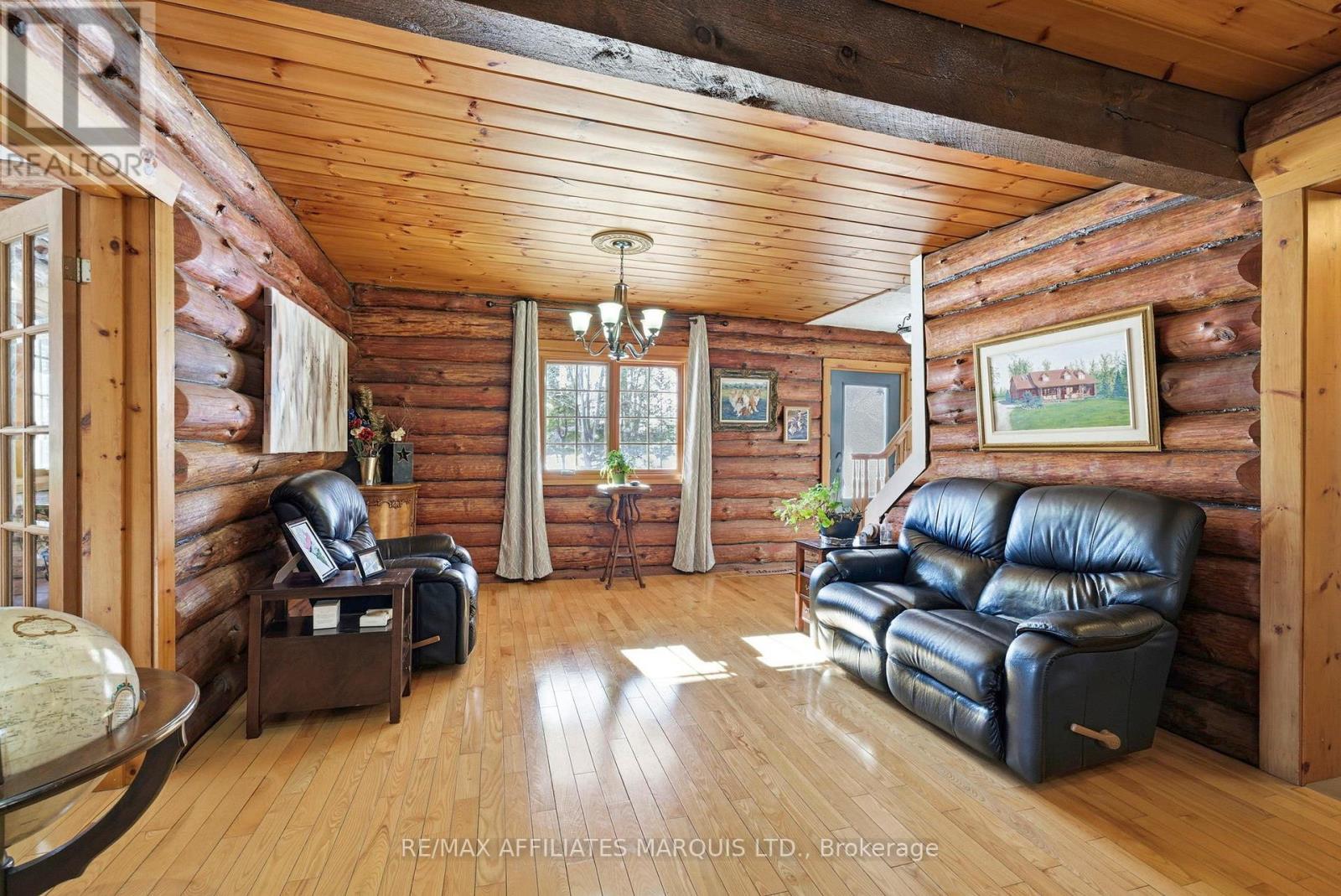 Welcome to this stunning 3,000 sq. ft. log home set on over 2 beautifully maintained acres just outside the city limits. Offering the perfect blend of peaceful rural living and convenient proximity to Cornwall, this property is ideal for families seeking space, character, and comfort. From the moment you arrive, the charm is undeniable. A spacious front porch invites you to relax and enjoy the quiet surroundings. Inside, exposed wood throughout the main floor creates a warm, timeless atmosphere. The updated eat-in kitchen features custom cabinetry, granite countertops, and a large island perfect for gathering. The inviting living room is highlighted by a striking stone fireplace with a gas insert and patio doors leading to the expansive screened-in patio, ideal for evening relaxation. A separate main-floor family room offers additional living space, and a convenient 2-piece bath combined with laundry adds everyday practicality. Upstairs you'll find four generously sized bedrooms. The primary suite includes a private 3-piece ensuite and a bonus room that could serve as a fifth bedroom, office, nursery, or exercise space. A full bathroom and an additional second-floor family room provide flexibility for growing families. The basement is currently used for storage but offers excellent potential for future development, with a walk-out from the attached single-car garage. Outside, the immaculate yard showcases mature landscaping, stone walkways, multiple patio areas, and a fire pit, perfect for entertaining or peaceful evenings under the stars. With ample parking and space for campers, boats, or recreational vehicles, this property blends lifestyle and practicality. Located minutes to Cornwall, approximately one hour to Ottawa and just over an hour to Montreal, this home offers space, warmth, and character you won't want to miss. (id:64974)