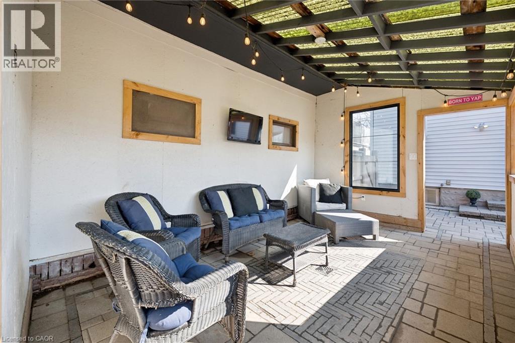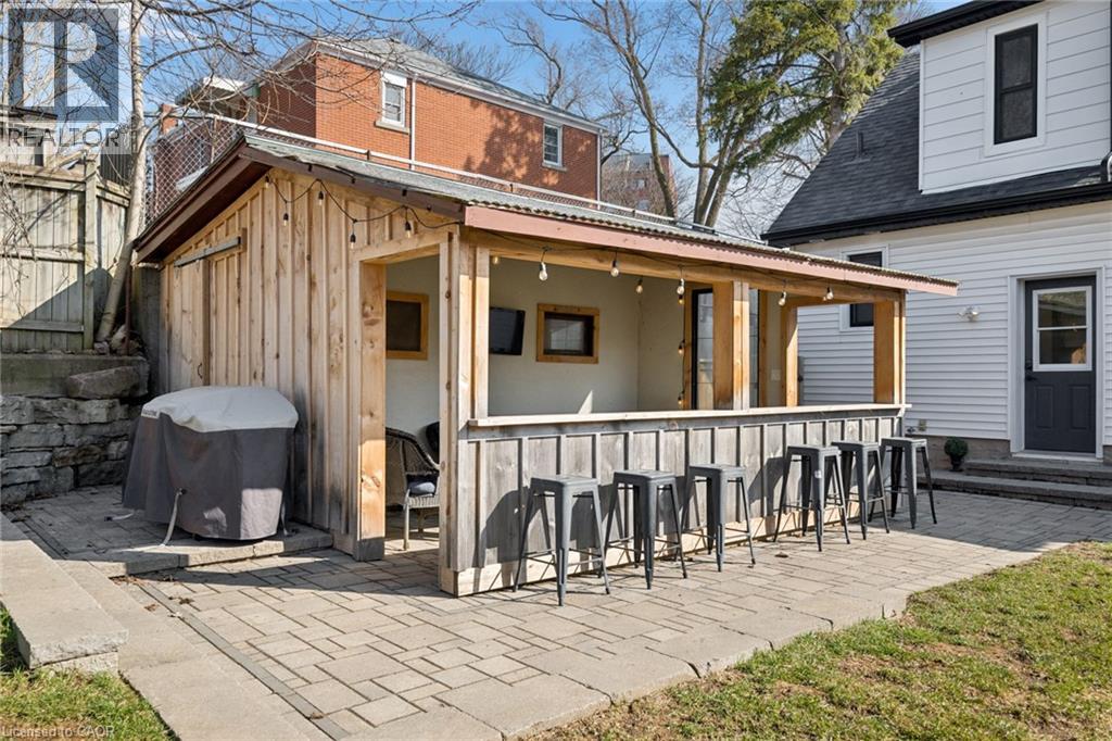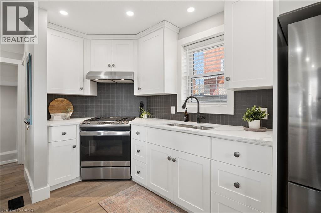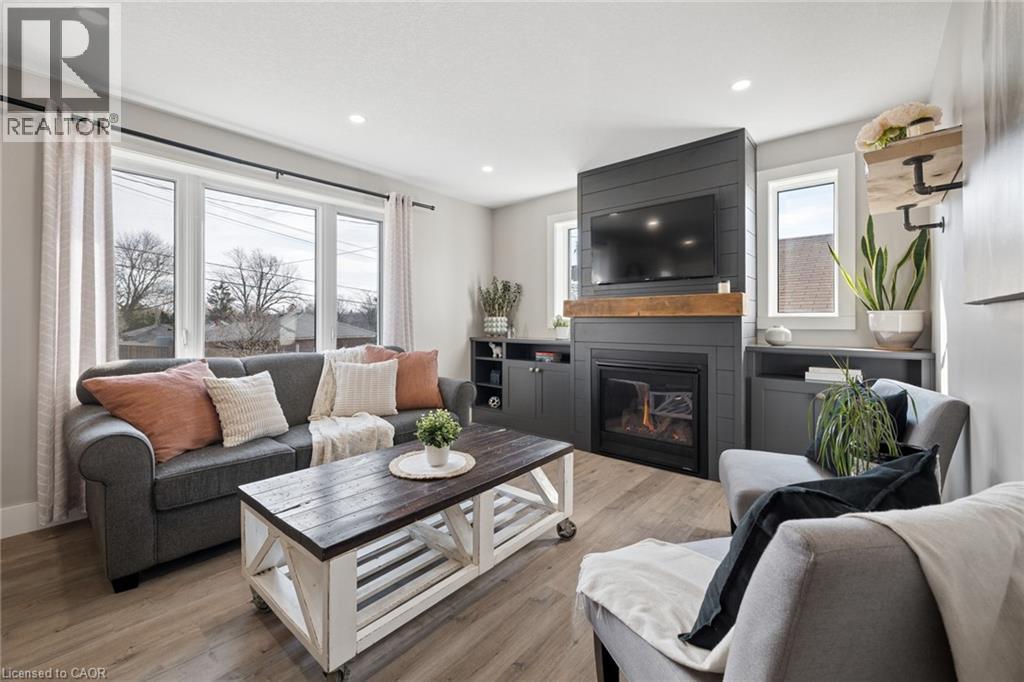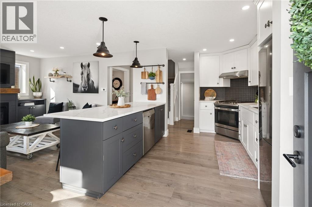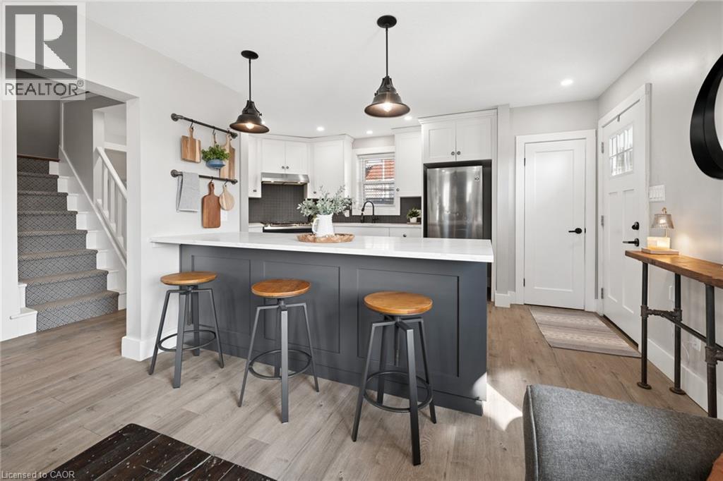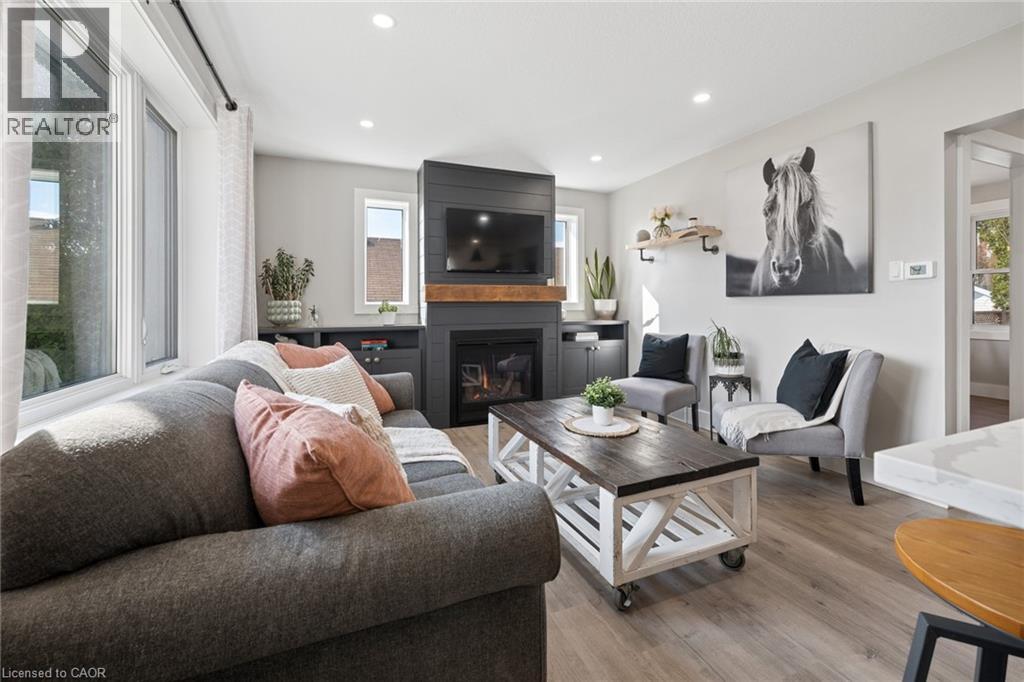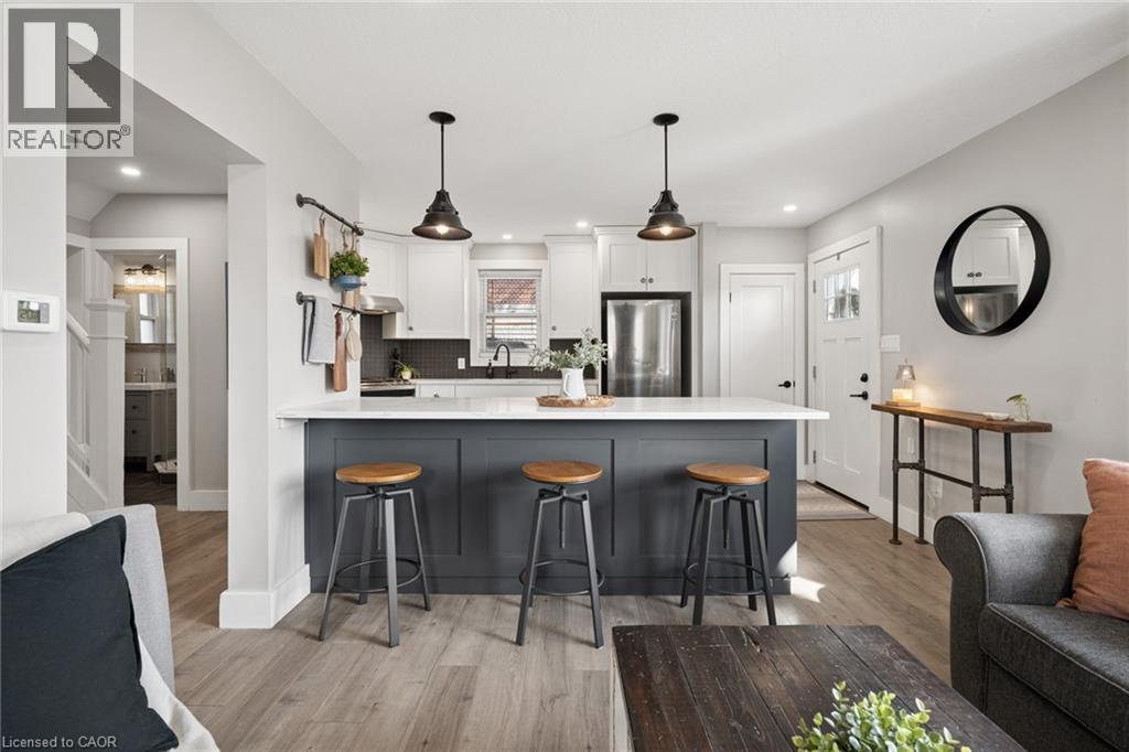 Fully renovated from top to bottom, this stunning 3-bedroom, 1.5-bath home offers the perfect blend of modern design, thoughtful upgrades, and lifestyle-set in a highly sought-after central Kitchener location just minutes from downtown amenities like Victoria Park, St. Mary's Hospital, Iron Horse Trail, shopping, and quick highway access. Step inside to a bright, open-concept main floor where pot lights and large windows fill the space with natural light. The beautifully updated two-tone kitchen (2020) features quartz countertops, a stylish backsplash, stainless steel appliances, and an oversized island ideal for entertaining. Major 2020 updates also include windows, doors, and extensive interior improvements, delivering a truly turnkey experience. The inviting living area is anchored by a cozy gas fireplace (2020) with custom built-ins and a wood mantle. A separate, spacious dining room provides versatility as an optional main floor bedroom. Upstairs offers two well-appointed bedrooms and a renovated bathroom (2020) with clean, contemporary finishes. The lower level provides excellent potential for a future fourth bedroom, office, or guest space, with updated plumbing throughout (2020, no cast iron) and a spacious laundry area. Additional upgrades include new insulation throughout most of the main floor, central A/C (2021), water softener (2020), and rented hot water heater (2021). Step outside to a professionally landscaped, fully fenced backyard featuring updated interlock (2024) and a standout detached covered structure with bar seating, lighting, and lounge space with TV capability-perfect for entertaining. A 16x10 sunroom and 16x8 shed, both with updated board and batten siding (2021), add functional space. Curb appeal is enhanced with new siding, fascia, and soffit (2022), plus a newly finished armour stone driveway (2025). Don't wait to call this move-in ready home yours! (id:64974)