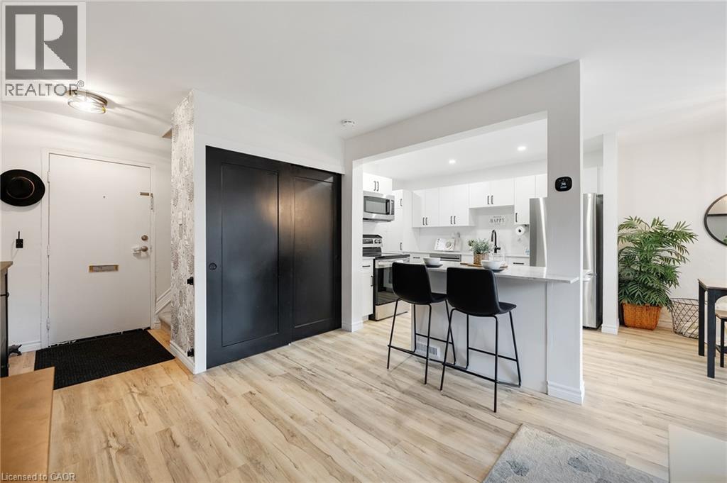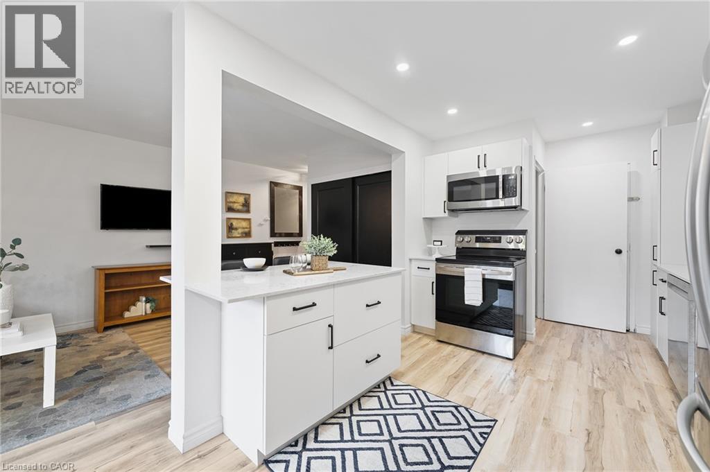 Stunningly renovated 3-bedroom, 1-bathroom two-storey condo townhome in St. Catharines desirable Carlton neighbourhood. Tucked away at the back of a quiet, family-friendly complex, this home offers added privacy, a fully fenced backyard, and a stylish, move-in ready interior. Features a bright, open-concept main floor with new vinyl plank flooring throughout, large principal rooms, and a custom kitchen with modern cabinetry, stainless steel appliances, quartz countertops, and a breakfast island. Sliding patio doors lead to a private yard with patio, green space, and a shed perfect for relaxing or entertaining. Upstairs includes 3 spacious bedrooms with contemporary finishes and a renovated 4-piece bathroom. The partially finished basement adds flexible space for a rec room, home office, playroom, additional bedroom or gym. Freshly painted throughout, move-in ready and located near parks, schools, shopping, and transit this home offers the benefits of condo living without compromising on space or lifestyle. (id:64974)
