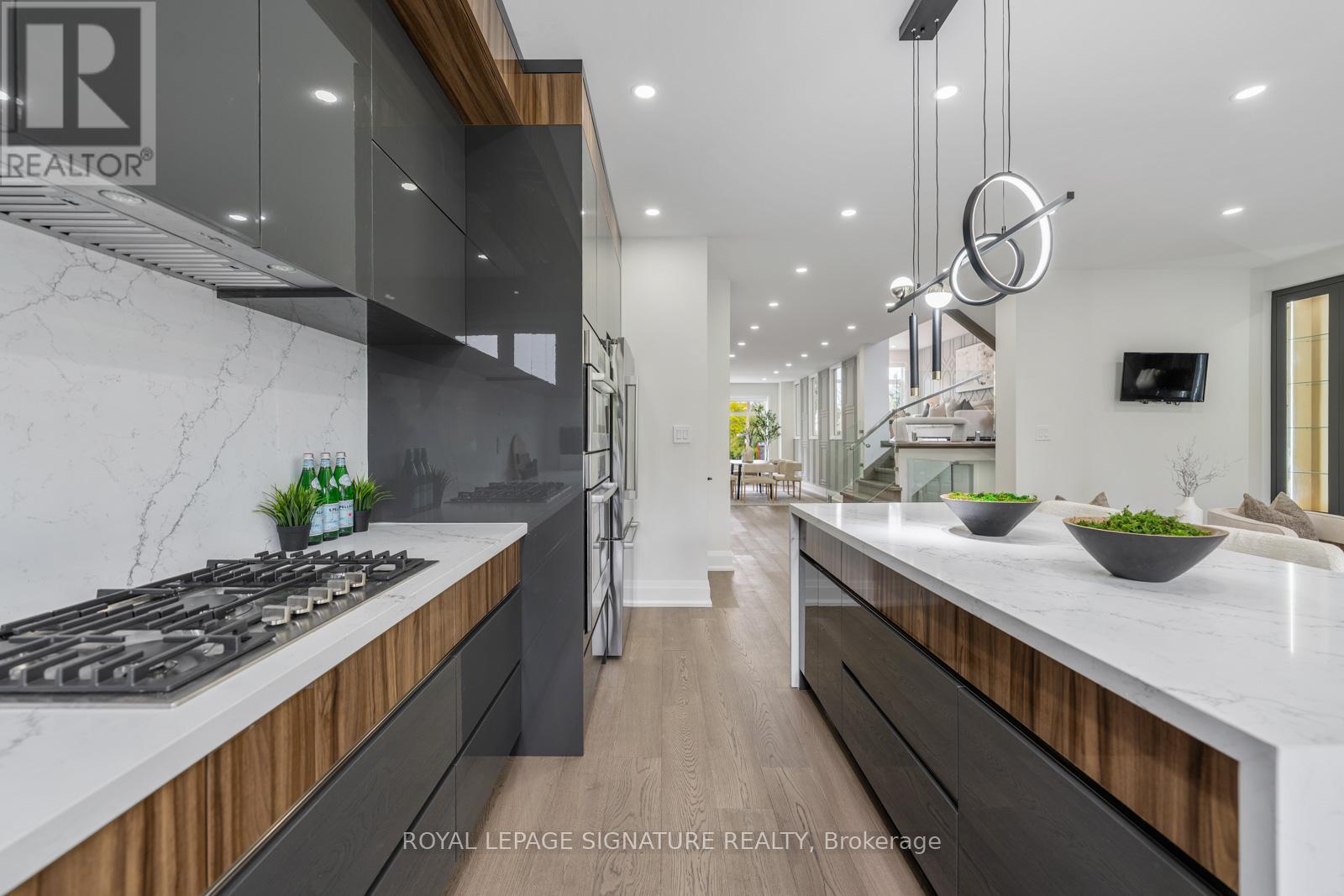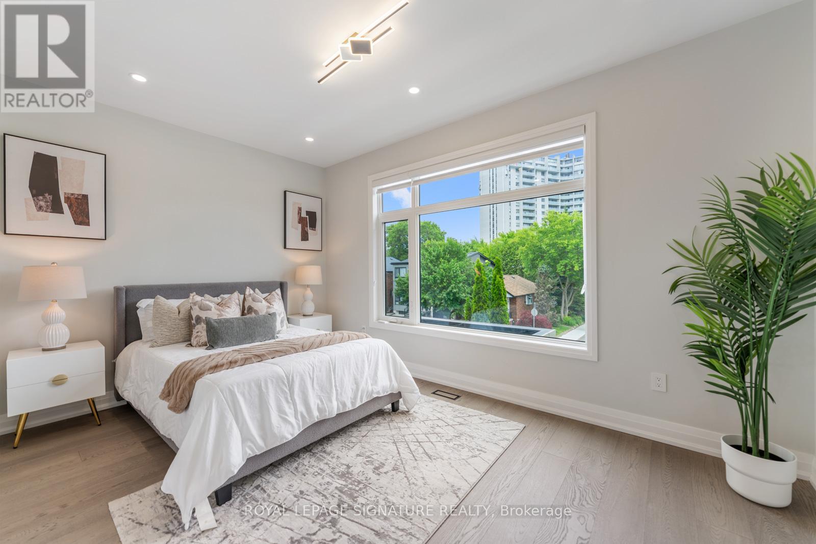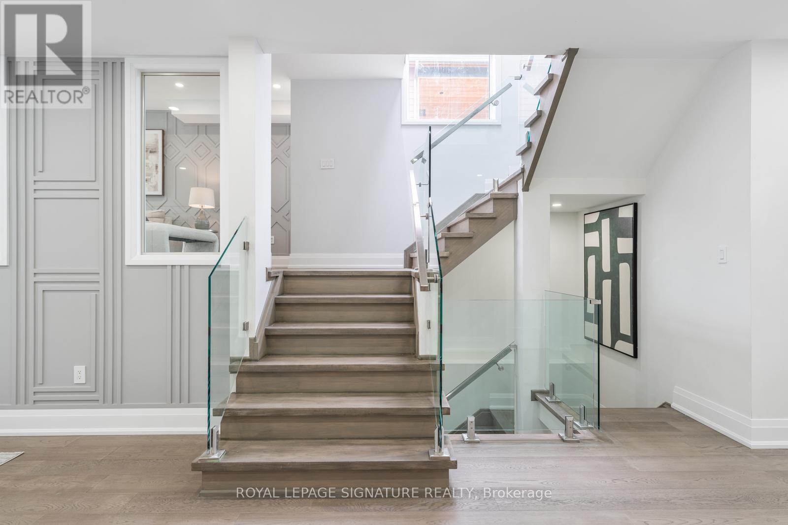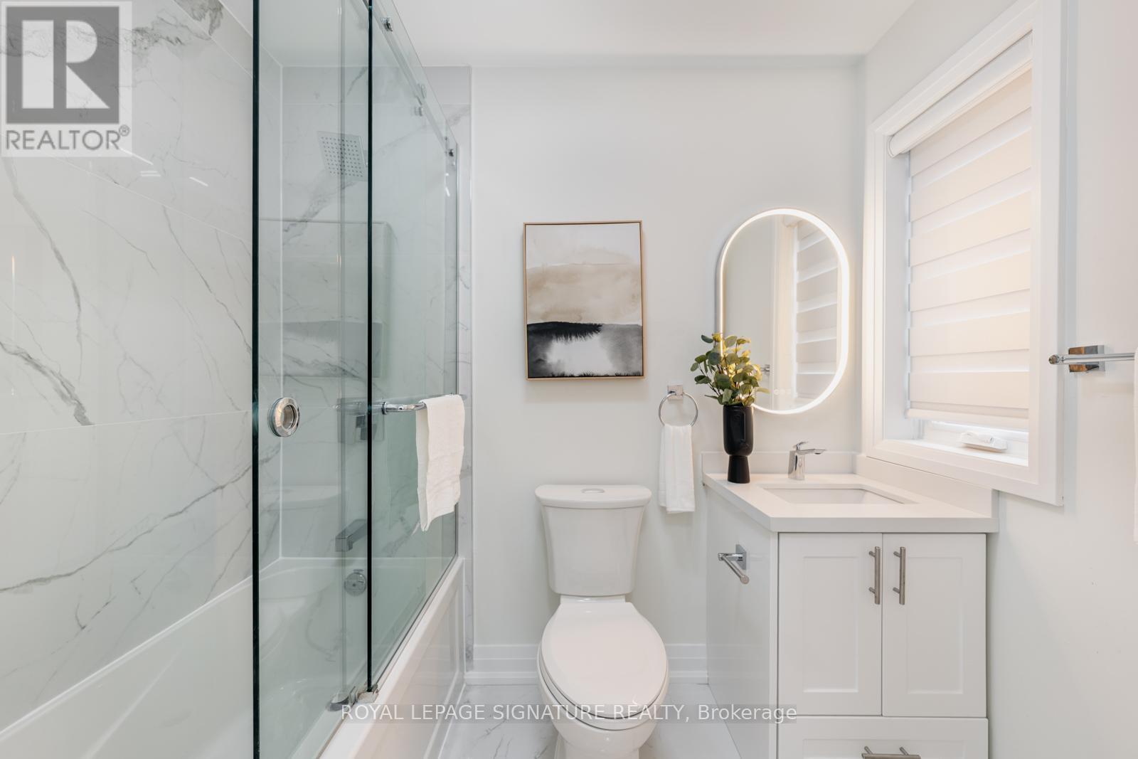 Majestic 4+1 Bedroom, 5 Bathroom Detached Home Situated on a premium 112.5 ft deep lot! This stunning property offers 2,481 sq ft above grade + 900 sq ft of finished basement space.Impressive curb appeal with stone and ACM Panelling exterior, elegant interlocking and a large covered front porch. Open-concept main floor highlighted by gorgeous engineered hardwood flooring and custom wainscoting. Spacious dining room ideal for entertaining, with seamless flow into the Family Room featuring built-in cabinetry and a gas fireplace with a sleek feature wall. Chefs kitchen boasts a sleek two-tone design, quartz countertops, matching backsplash, custom pendant lighting, a waterfall center island, high-end built-in appliances, and a full separate pantry. The living room features a gorgeous detailed accent wall and massive windows.Luxurious primary retreat offers a spa-inspired 7-pc ensuite, custom walk-in closet with organizers, and a feature wall. A secondary bedroom includes its own private 4-pc ensuite and double closet. 3rd and 4th Bedrooms share a 4pc bath and both include double closets! Convenient second-floor laundry room included.The fully finished basement features LED pot lights, a stylish full kitchen with quartz counters, stainless steel appliances, a 4-pc bathroom with custom tiling, separate laundry, and direct walk-out access. Includes 1 spacious bedroomsperfect for an in-law suite or income potential and a massive rec room can be split to create a 2nd bedroom!Fully fenced backyard with a large sun deck and a large shed! Steps to the TTC and the grand Stan Wadlow Park and Taylor Creek Trails! (id:64974)
