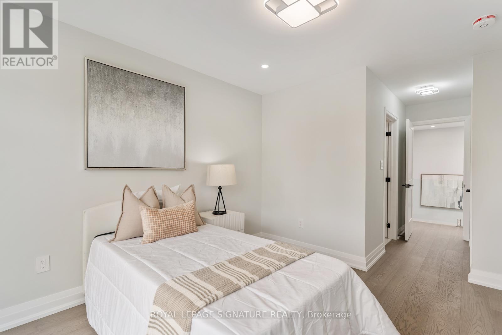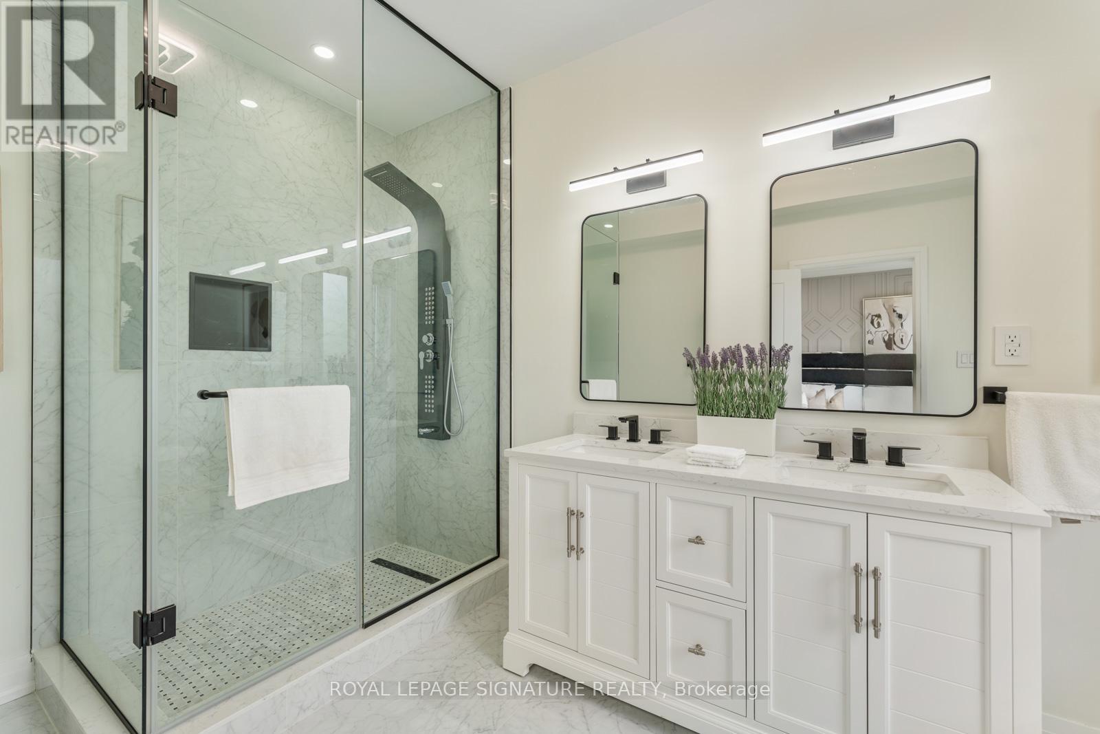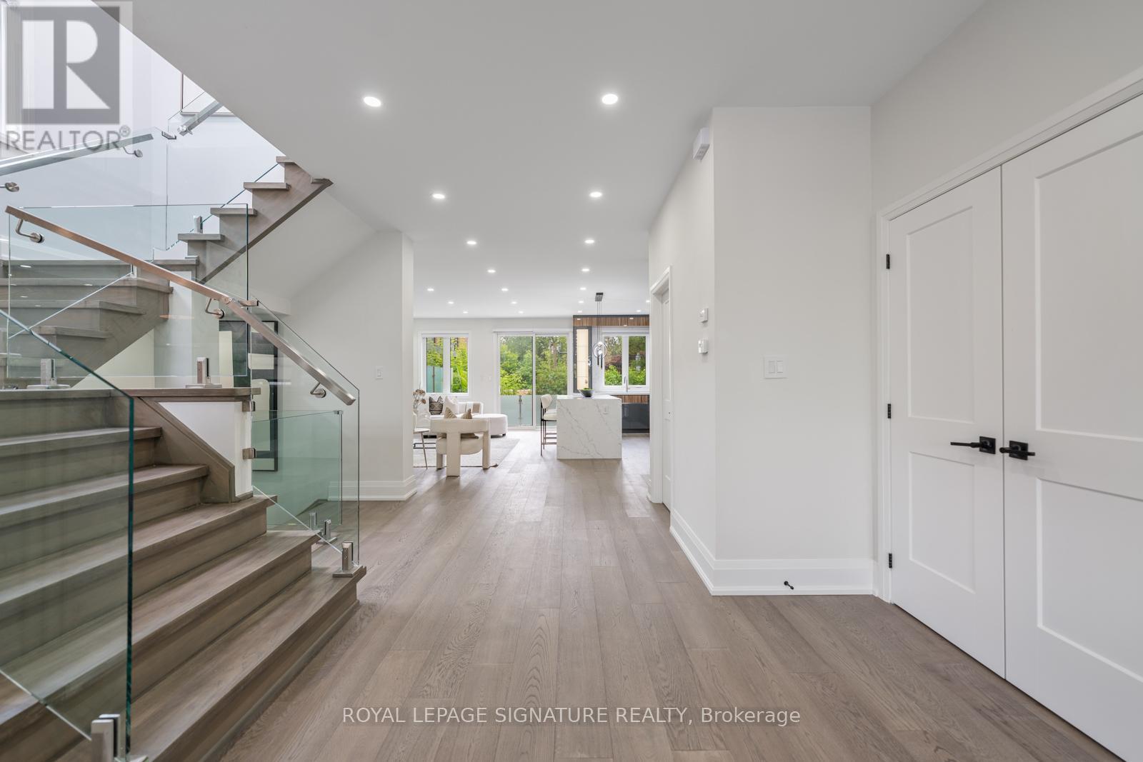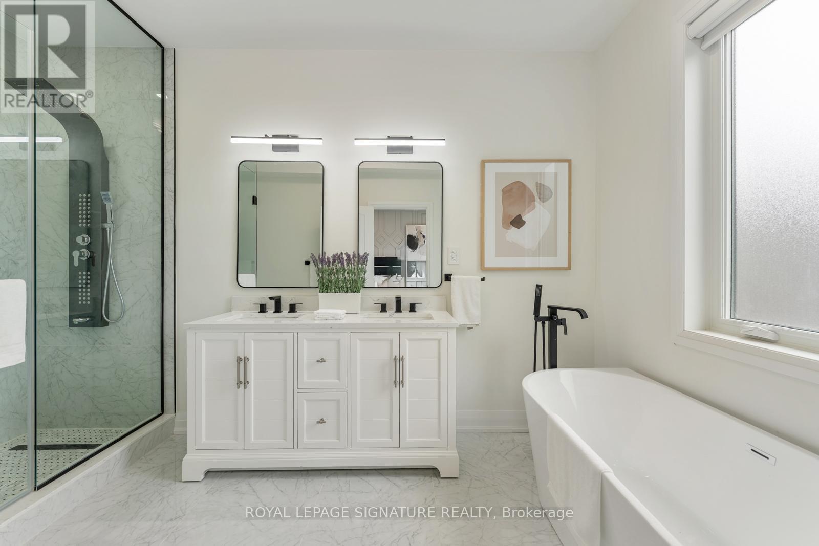 Majestic 4+1 Bedroom, 5 Bathroom Detached Home Situated on a premium 112.5 ft deep lot! This stunning property offers 2,481 sq ft above grade + 900 sq ft of finished basement space.Impressive curb appeal with stone and ACM Panelling exterior, elegant interlocking and a large covered front porch. Open-concept main floor highlighted by gorgeous engineered hardwood flooring and custom wainscoting. Spacious dining room ideal for entertaining, with seamless flow into the Family Room featuring built-in cabinetry and a gas fireplace with a sleek feature wall. Chefs kitchen boasts a sleek two-tone design, quartz countertops, matching backsplash, custom pendant lighting, a waterfall center island, high-end built-in appliances, and a full separate pantry. The living room features a gorgeous detailed accent wall and massive windows.Luxurious primary retreat offers a spa-inspired 7-pc ensuite, custom walk-in closet with organizers, and a feature wall. A secondary bedroom includes its own private 4-pc ensuite and double closet. 3rd and 4th Bedrooms share a 4pc bath and both include double closets! Convenient second-floor laundry room included.The fully finished basement features LED pot lights, a stylish full kitchen with quartz counters, stainless steel appliances, a 4-pc bathroom with custom tiling, separate laundry, and direct walk-out access. Includes 1 spacious bedroomsperfect for an in-law suite or income potential and a massive rec room can be split to create a 2nd bedroom!Fully fenced backyard with a large sun deck and a large shed! Steps to the TTC and the grand Stan Wadlow Park and Taylor Creek Trails! (id:64974)
