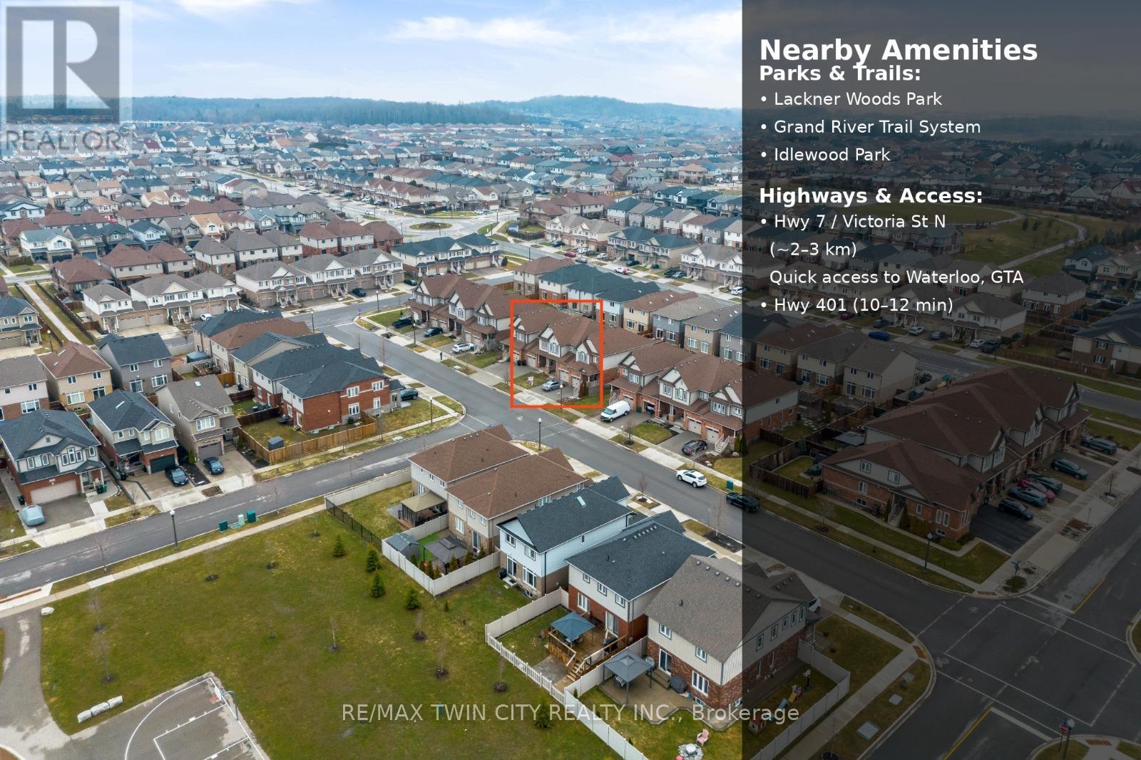 Welcome to 17 Valleybrook Drive, Kitchener: this superb freehold townhouse (no condo fees!) nestled in the highly sought-after Riverwood community of Lackner Woods, known for its family-friendly atmosphere, excellent schools and beautiful natural surroundings. Drive into this well-maintained home that impresses with its inviting curb appeal and convenient parking for 2 vehicles (1-car garage + private driveway). Step inside to a welcoming foyer featuring a 2pc powder room. Make your way up to the heart of the home, where a stunning open-concept layout awaits. The modern kitchen is designed to impress, featuring stainless steel appliances, a gas stove, stylish backsplash and ample cabinetry. The adjoining dining area is ideal for everyday meals and entertaining alike. The bright and airy living room is a true highlight, boasting wall of windows and a patio door that floods the space with natural light. Whether you're hosting friends, enjoying family time or settling in for cozy movie nights, this space offers the perfect setting. Upstairs, you'll find 3 generously sized bedrooms and two full bathrooms. The primary suite is your private retreat, complete with a walk-in closet and a spa-inspired ensuite featuring a relaxing soaker tub and a separate standing shower. The unfinished basement offers incredible potential, with a rough-in for a future bathroom, ready for you to design and create the space of your dreams, whether it's a rec room, home gym or additional living area. Step outside from the dining area to a partially finished backyard, an ideal space for kids to play, summer BBQs or hosting gatherings with family and friends. Located in one of Kitchener's most desirable neighbourhoods, you'll enjoy close proximity to top-rated schools, parks, playgrounds and scenic walking trails along the Grand River. Plus, easy access to major highways makes commuting to the GTA a breeze. Don't miss this opportunity, book your showing today and make this beautiful home yours! (id:64974)
