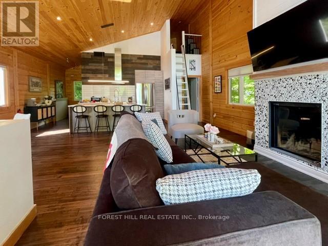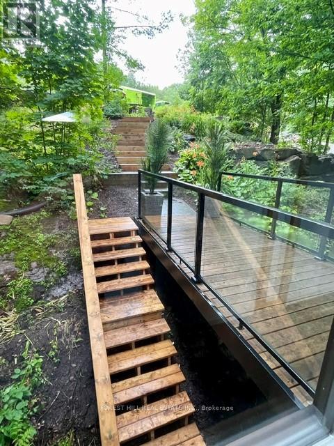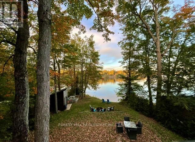 Offering 3+1 bedrooms & 2 bathrooms, the interior is highlighted by a bright, open-concept layout with impressive 22-foot ceilings & expansive windows that frame stunning lake views & fill the space with natural light. The kitchen is thoughtfully designed for both everyday living & entertaining, featuring granite surfaces, stainless steel appliances, & a large island with plenty of seating. A wood-burning fireplace anchors the main living space, creating a warm & inviting atmosphere throughout the seasons. Upstairs, a private composite balcony with glass railings provides a quiet place to unwind & take in the surrounding landscape. The primary bedroom includes a walkout to the rear deck & a rough-in for a future ensuite. Recent updates completed in 2024 add even more value, including a newly finished bathroom on the ground level & a newly installed steel staircase, offering both function & a modern aesthetic. The outdoor setting has been extensively enhanced with professionally designed landscaping by a top-tier firm, creating a polished yet natural environment. Multiple stone patio areas & a fire pit provide ideal spaces for entertaining or relaxing outdoors, all surrounded by mature trees for added privacy. The waterfront is exceptionally user-friendly, with a shallow sandy entry ideal for families, along with a Dock-in-a-Box system for convenient access to Lake Muskoka & its vast boating network. A matching bunkie at the water's edge offers additional space for guests or a quiet escape. Located just minutes from Muskoka Bay Resort, as well as the shops, dining, & waterfront attractions of Gravenhurst, this property offers both seclusion & convenience-an ideal setting to enjoy everything Muskoka has to offer. (id:64974)