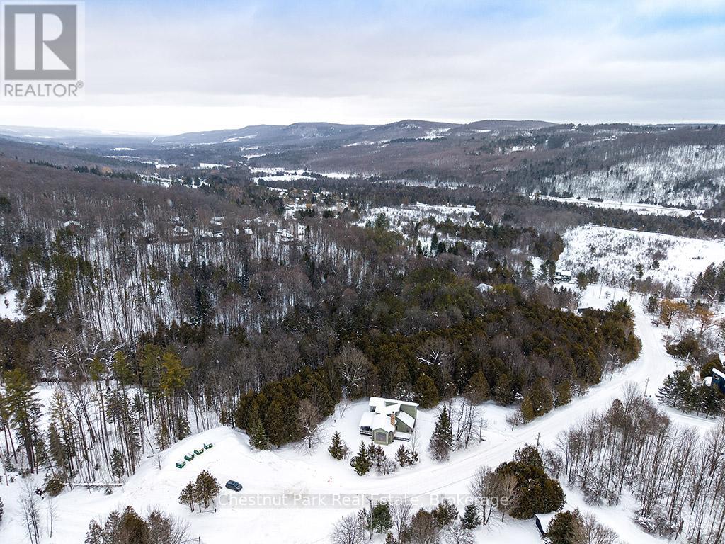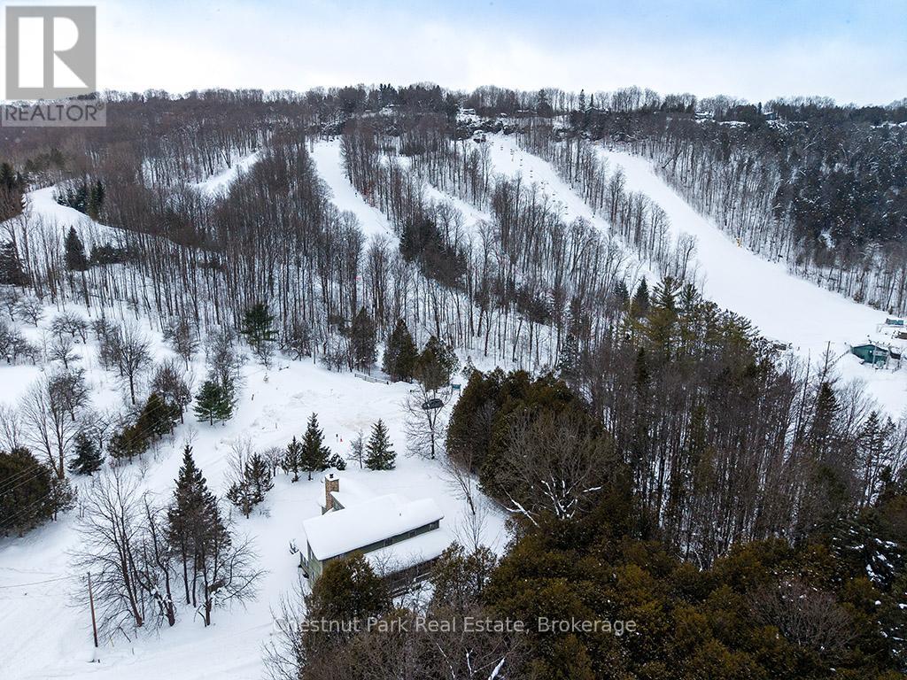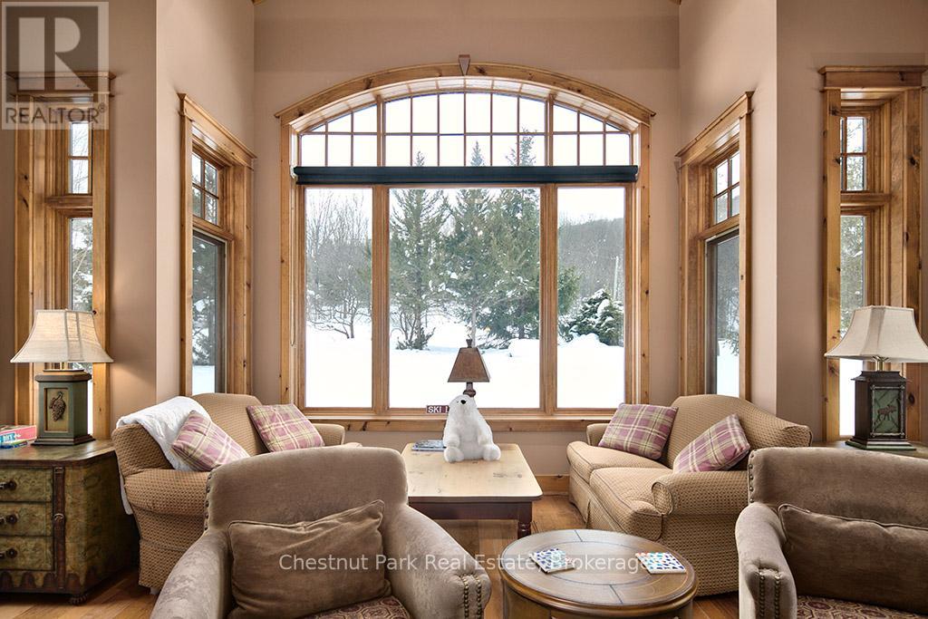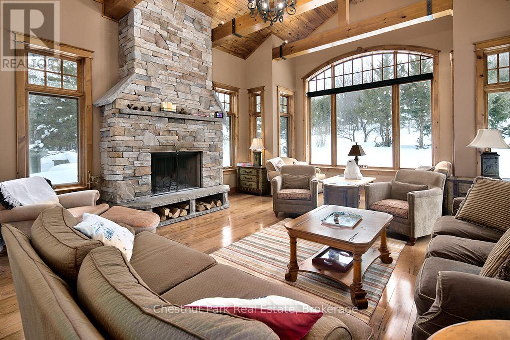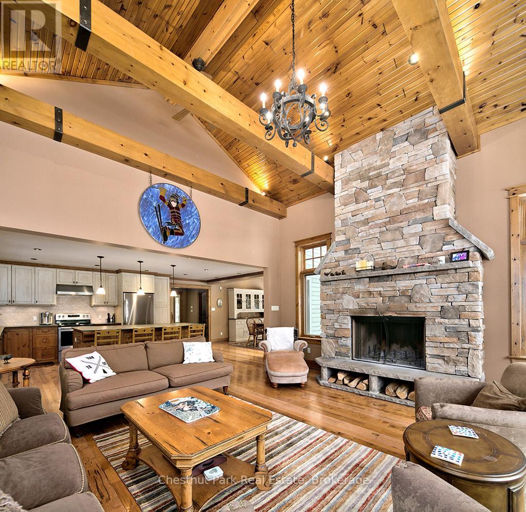 Rare opportunity to own a true ski-in, ski-out chalet at the prestigious Beaver Valley Ski Club, ideally located in Beaver South. Privately set at the end of a quiet dead-end road, this custom-built chalet offers the perfect blend of luxury, warmth, and functionality. A spacious stone-floored foyer welcomes you into the stunning open-concept great room, featuring soaring vaulted tongue-and-groove pine ceilings, dramatic timber beams with metal hardware, oversized windows, and views of skiers on Southern Comfort. The floor-to-ceiling wood-burning fireplace with hand-laid stone serves as a striking centerpiece. The custom kitchen is designed for entertaining, with modern appliances, double sinks, and a large island that naturally becomes a gathering place for family and friends. A light-filled formal dining room with vaulted ceilings and solid wood floors opens to a sunny south-facing deck and a separate covered porch with hot tub provides the perfect après-ski retreat. The main floor includes a bedroom with access to a three-piece bath, ideal for guests or senior family members. Life is easy with a generous boot room with dedicated ski entry. Upstairs, the primary suite features vaulted ceilings, custom furnishings, and beautiful hardwood trim. Additional bedrooms include a spectacular bunk room with custom triple-stacked bunks, plus a spacious guest bedroom and shared three-piece bath. The lower level offers a large games and family room with a custom pool table convertible to ping pong, an additional flex room, and a third bathroom. Solidly built and thoughtfully detailed throughout, it comfortably sleeps 12 and comes furnished. A rare offering in one of Grey Highlands' most exclusive private ski communities. (id:64974)