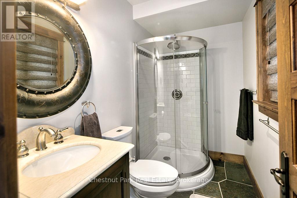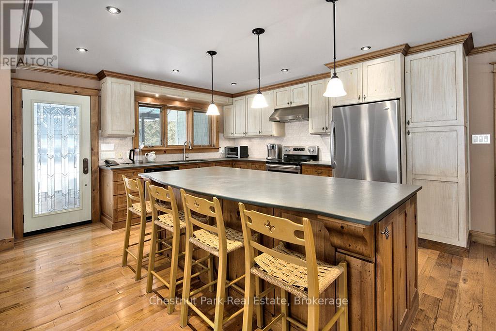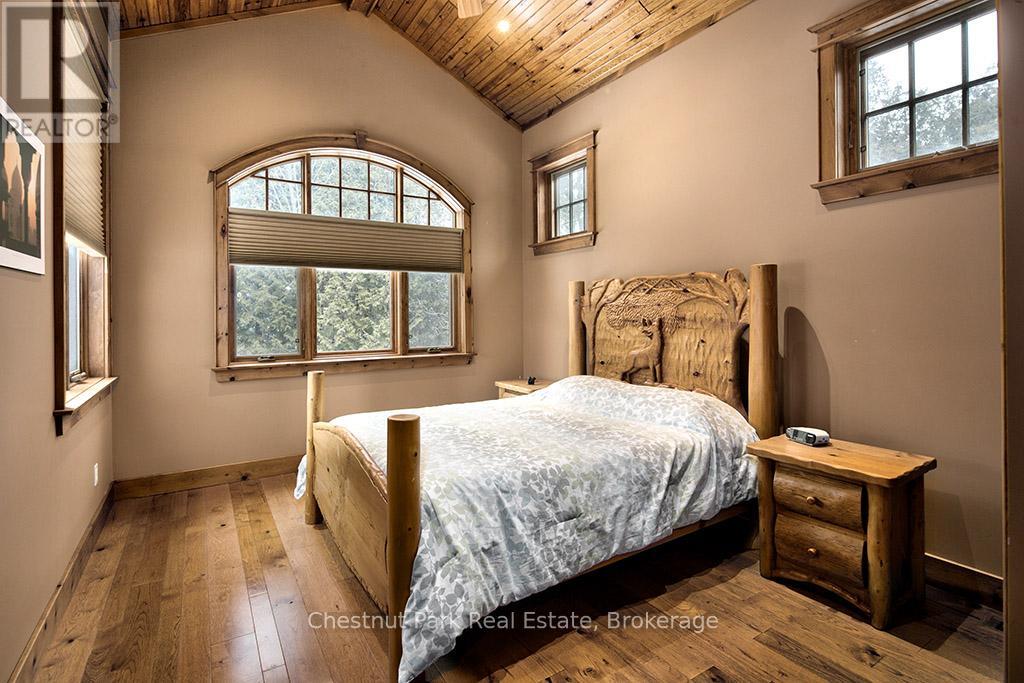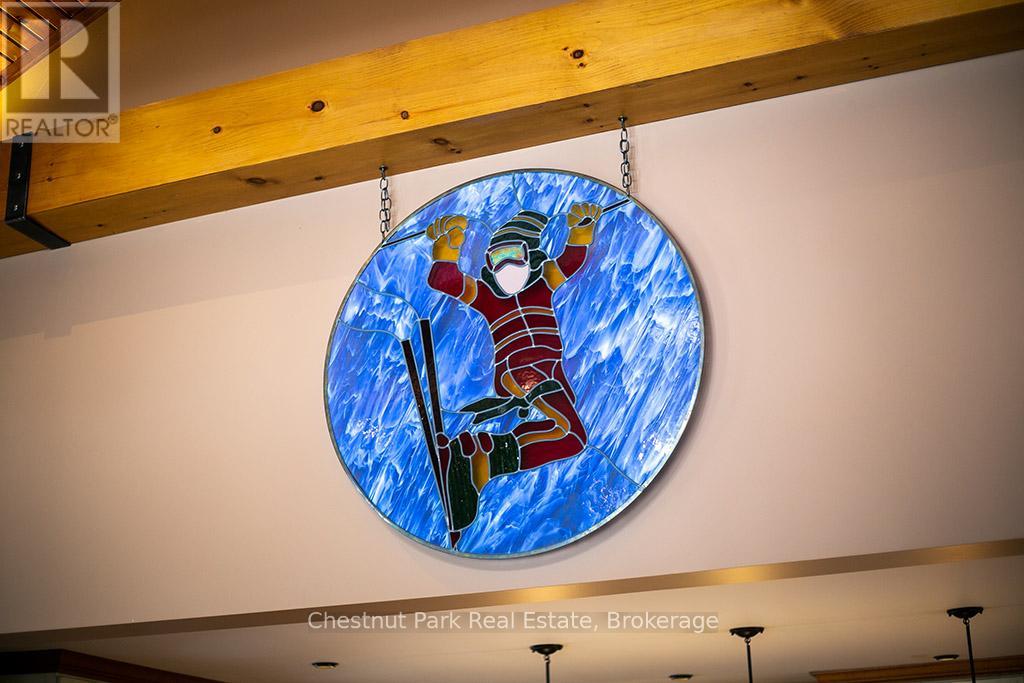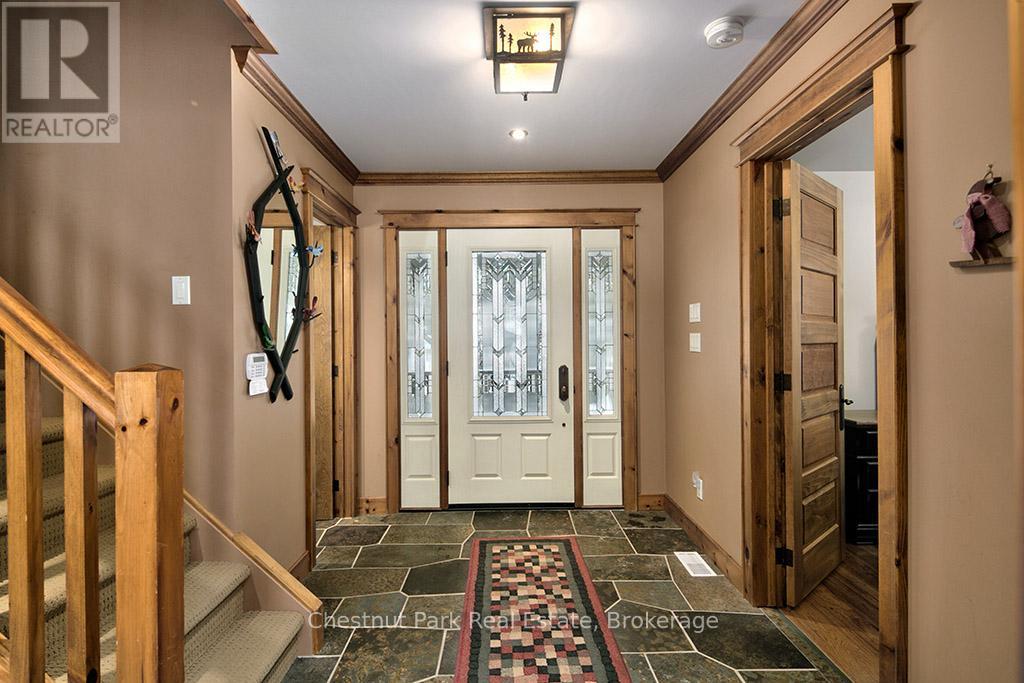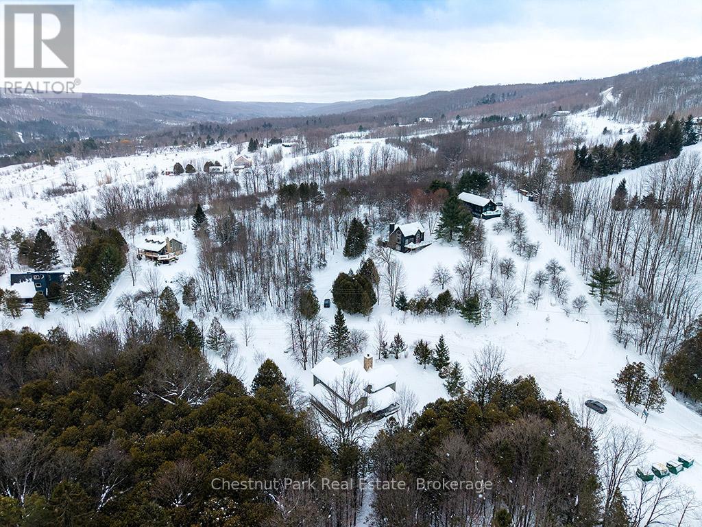 Rare opportunity to own a true ski-in, ski-out chalet at the prestigious Beaver Valley Ski Club, ideally located in Beaver South. Privately set at the end of a quiet dead-end road, this custom-built chalet offers the perfect blend of luxury, warmth, and functionality. A spacious stone-floored foyer welcomes you into the stunning open-concept great room, featuring soaring vaulted tongue-and-groove pine ceilings, dramatic timber beams with metal hardware, oversized windows, and views of skiers on Southern Comfort. The floor-to-ceiling wood-burning fireplace with hand-laid stone serves as a striking centerpiece. The custom kitchen is designed for entertaining, with modern appliances, double sinks, and a large island that naturally becomes a gathering place for family and friends. A light-filled formal dining room with vaulted ceilings and solid wood floors opens to a sunny south-facing deck and a separate covered porch with hot tub provides the perfect après-ski retreat. The main floor includes a bedroom with access to a three-piece bath, ideal for guests or senior family members. Life is easy with a generous boot room with dedicated ski entry. Upstairs, the primary suite features vaulted ceilings, custom furnishings, and beautiful hardwood trim. Additional bedrooms include a spectacular bunk room with custom triple-stacked bunks, plus a spacious guest bedroom and shared three-piece bath. The lower level offers a large games and family room with a custom pool table convertible to ping pong, an additional flex room, and a third bathroom. Solidly built and thoughtfully detailed throughout, it comfortably sleeps 12 and comes furnished. A rare offering in one of Grey Highlands' most exclusive private ski communities. (id:64974)