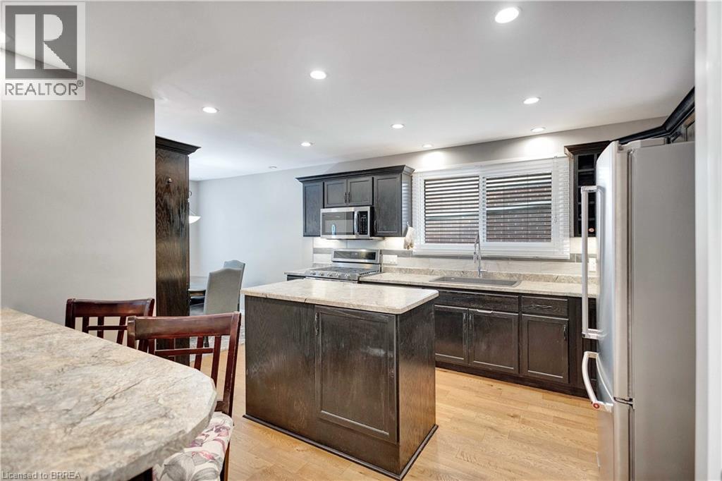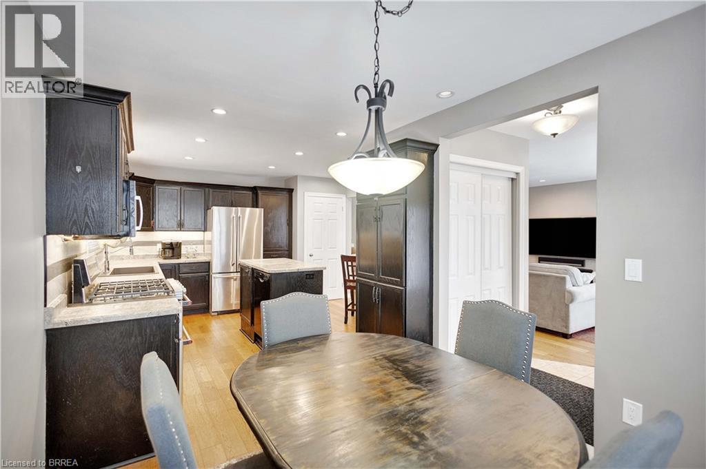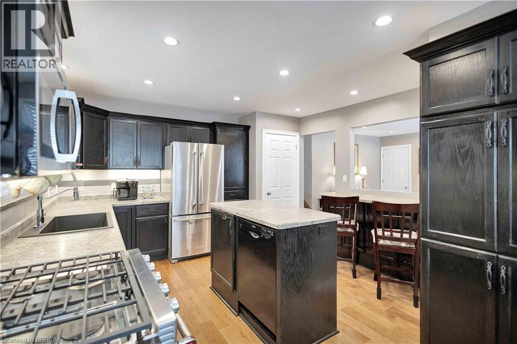 Location, Location, Location!! Within 1 minute to Hwy 403, Welcome to 170 Paris Road, a beautiful Backsplit with 3 bedrooms, 2 baths. Extended covered front porch offers plenty of room to sit out day or evening. Once inside you are welcomed into a large living room area with a huge bay window allowing for an abundance of natural light. Completing the main floor area is a modern eat-in kitchen with new cabinetry and updated countertops along with a huge island and loads of storage. Fridge and Stove are Stainless steel making this kitchen truly a delight. Second level offers 3 spacious bedrooms and a 4 pc bath. The lower level is surprisingly spacious with a huge rec room area, laundry area, and 3 pce bath. The door across from the laundry leads up to the garage so this area can also be turned into an in-law suite or potential income area. Enjoy the spacious backyard with a Gazebo that stays with the home and a Hot Tub. The backyard is partially fenced with plenty of room to accommodate an inground pool or create your own backyard oasis. Shed is in the back right corner of property with no electricity. This home has plenty of room for 4+ cars in the driveway. Golf, shopping, schools, trails are all within minutes, the home has been meticulously cared for and it shows. Book your viewing today. (id:64974)