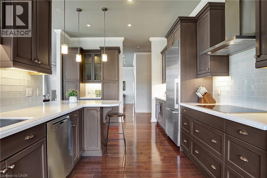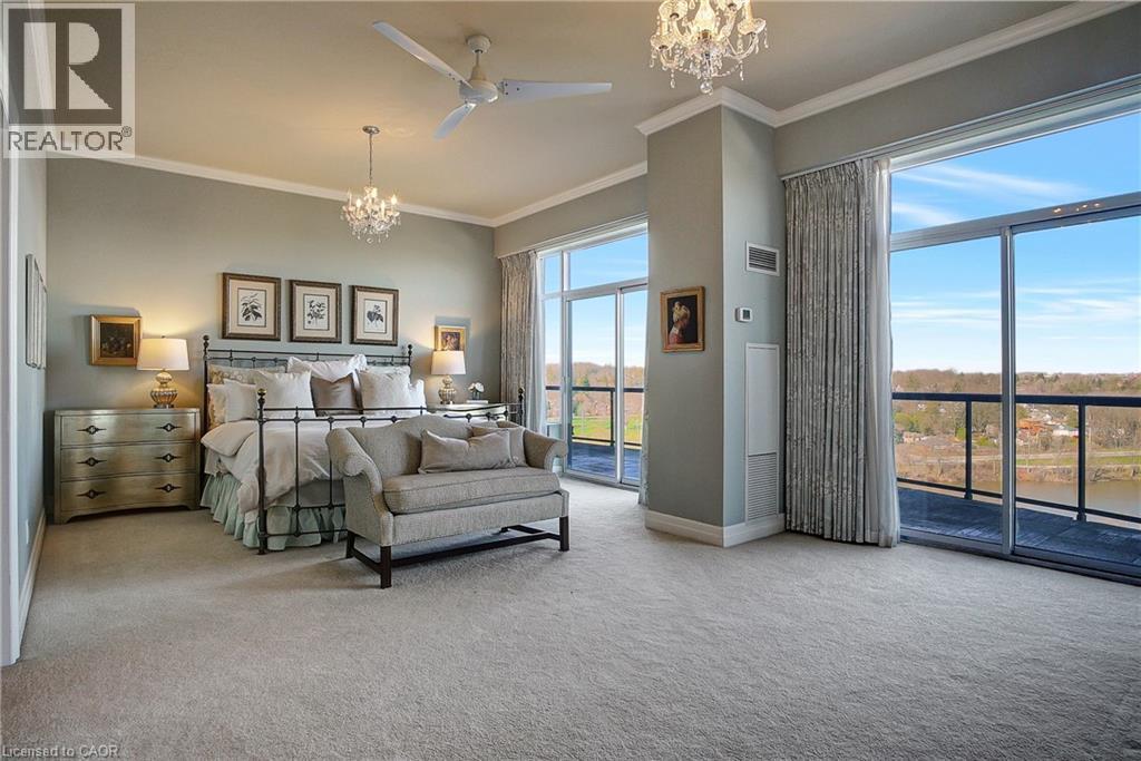 This One-of-a-Kind Luxury Penthouse was custom designed to create nearly 3,000 sq. ft. of refined living space, offering the perfect blend of elegance, comfort, and Panoramic River Views. Every window frames a breathtaking view of the river, and a full-length terrace with multiple walkouts provides a front-row seat to spectacular sunsets. The expansive and light-filled living room features a gas fireplace, seamlessly flowing into a grand dining area perfect for hosting a dinner party or large family gathering. The chefs kitchen is beautifully renovated and thoughtfully designed, with seating for five and overlooks the family room. A separate den offers the ideal space for a home office, home theatre, or additional third bedroom. Perfect for entertainers, the butlers pantry includes its own entrance, doubling as a service or catering kitchen for seamless hosting. The primary suite is tucked away in its own private wing, showcasing luxurious penthouse glamour with floor-to-ceiling windows and a walkout to the terrace. A spacious walk-in closet functions as a full dressing room complete with a center island. The show-stopping ensuite features a soaking tub positioned to take in the sweeping river views. The second bedroom is generously sized and includes its own ensuite bath, offering comfort and privacy for guests or family. With two underground parking spaces and two private locker rooms, this is elevated condo living without compromise. Set in the heart of historic Galt, you're just steps away from riverfront trails, fine dining at Cambridge Mill or Langdon Hall, the local farmer's market, and the vibrant Gaslight District. A rare opportunity to live large in one of the regions most desirable settings. (id:64974)