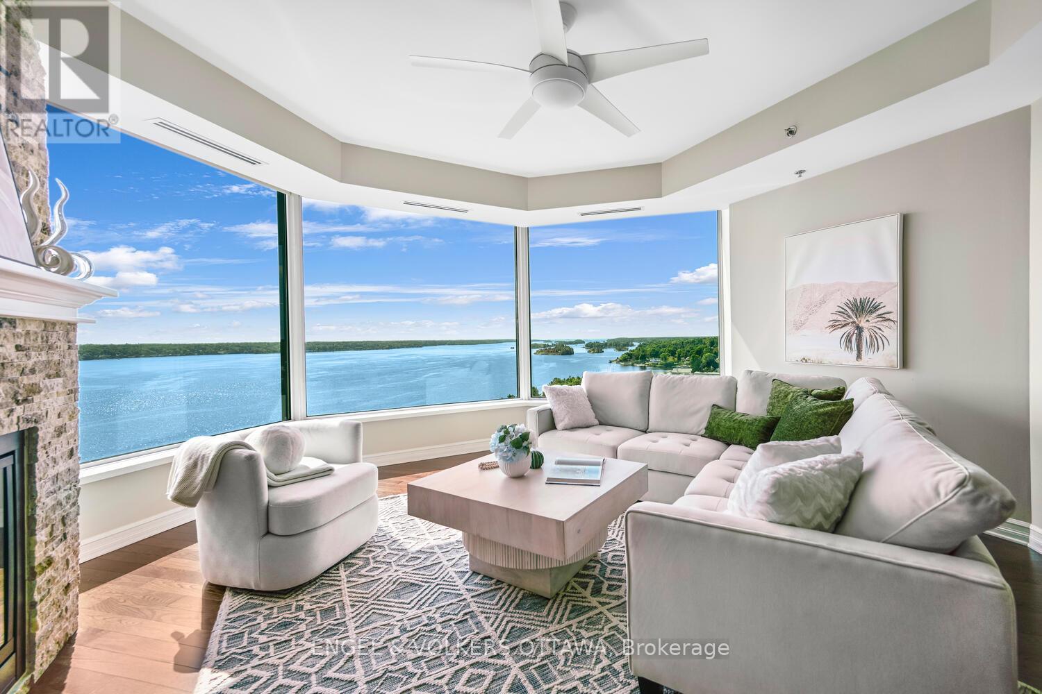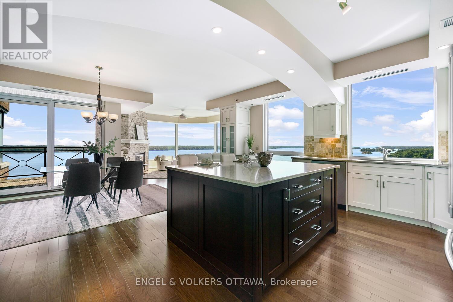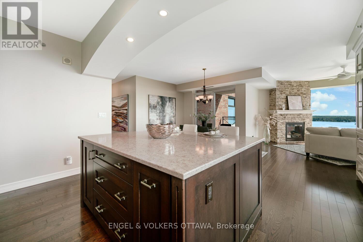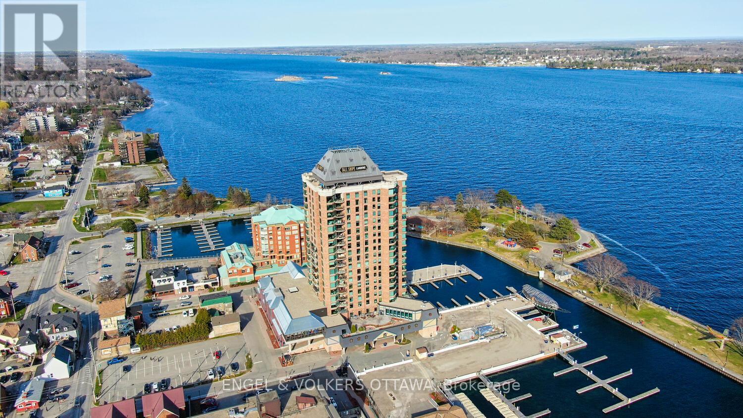Upon entering you are immediately drawn to the most remarkable view and the magic of the Thousand Islands! Enjoy the endless wonder of ships from faraway places, majestic cruise ships and private yachts plying the waters of the St. Lawrence River! This west facing T'Gallant suite boasts approximately 1622 sq. ft. of superbly designed luxury living plus 110 sq. ft. balcony. Open concept great room style combines a high quality custom kitchen with huge centre island, high end appliances, quartz countertops and great task lighting. This flows seamlessly to a spacious dining area and to an octagonal living room. The subtle stone work surrounding the gas fireplace adds a classic touch to an already extraordinary living space. And all this as well as both bedrooms and hallways are anchored by rich hardwood flooring. The primary bedroom easily accommodates a king size bed plus tonnes of space for bedside tables, armoires, etc. The ensuite bath separate shower, bath, double sinks, lots of storage and ceramic flooring. The second bedroom is easily used as a den, office and for occasional overnight stays. A second full bath completes the suite. Impeccably maintained throughout. Tall Ships offers amazing amenities indoor pool, sauna, indoor and outdoor hot tubs, meeting rooms, catering kitchen. Indoor parking for one car is included. (id:64974)